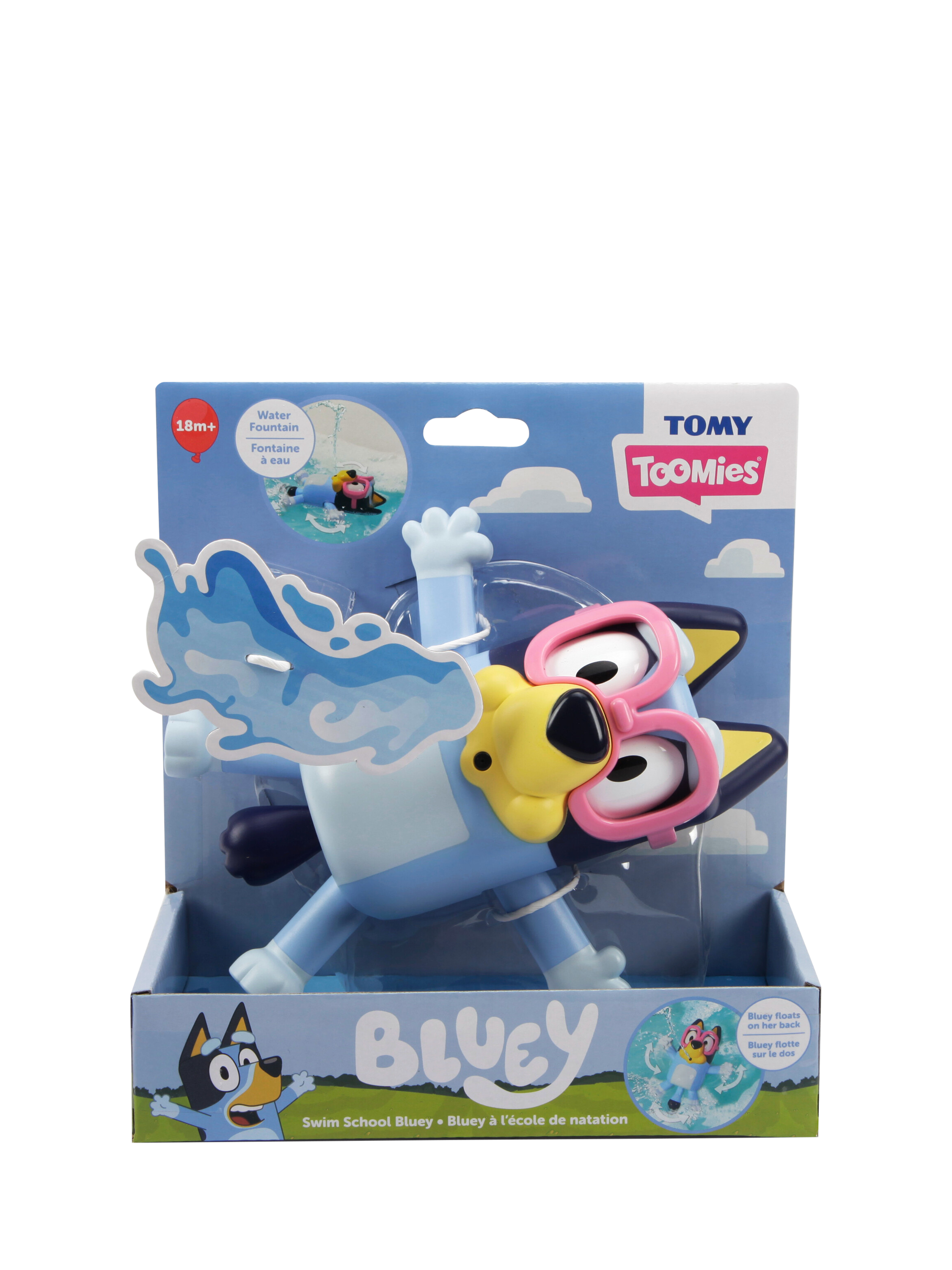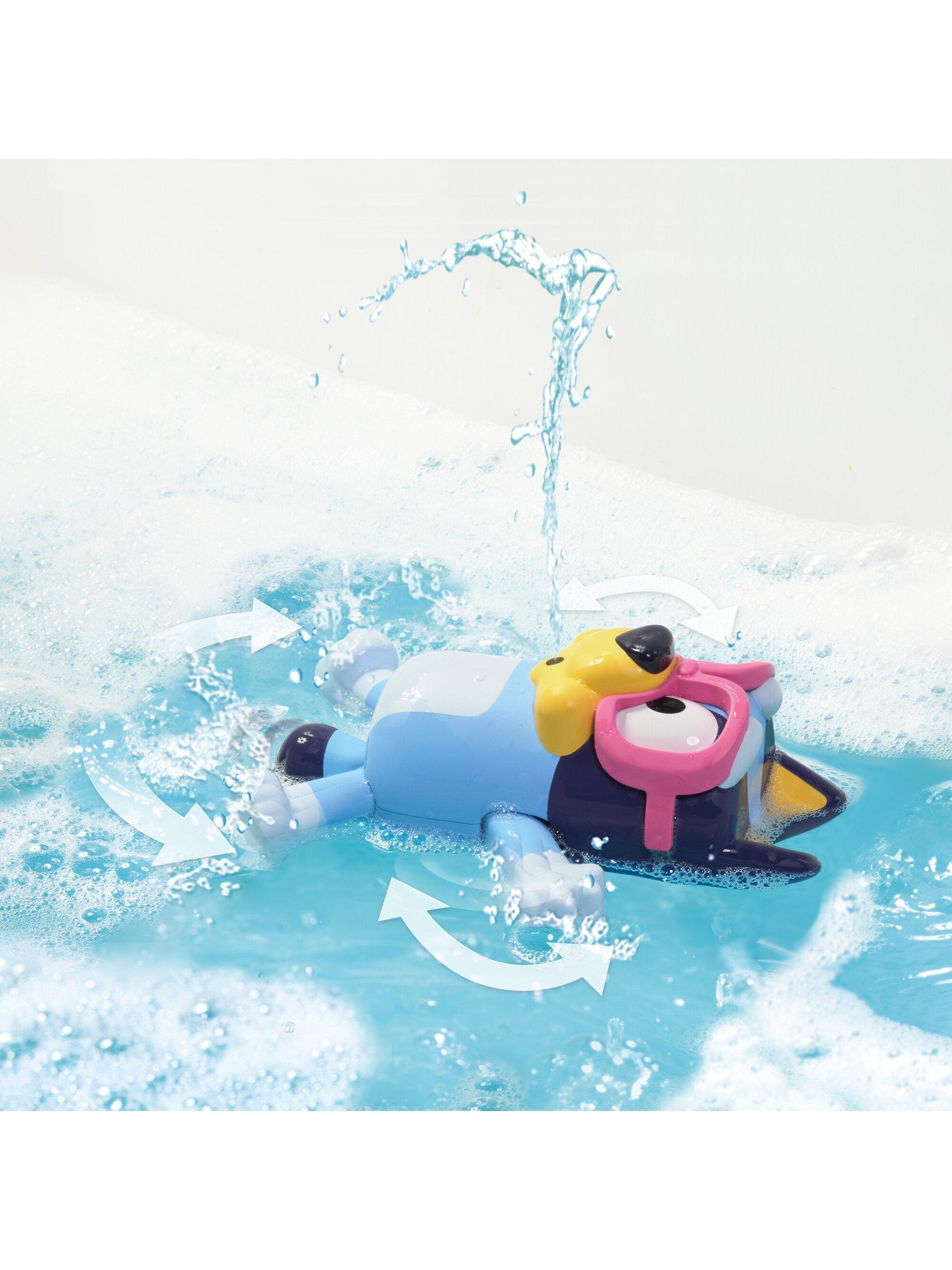 Dive into the fun of bath time with Swim School Bluey, the bath toy that shoots water high into the air for an amazing fountain show. Watch as Bluey floats on her back. The fun does not stop there. Simply place Bluey in water, pull her tail to fill, and then release. A little help from a parent or caregiver may be needed to pull the tail, making it a fun shared activity.