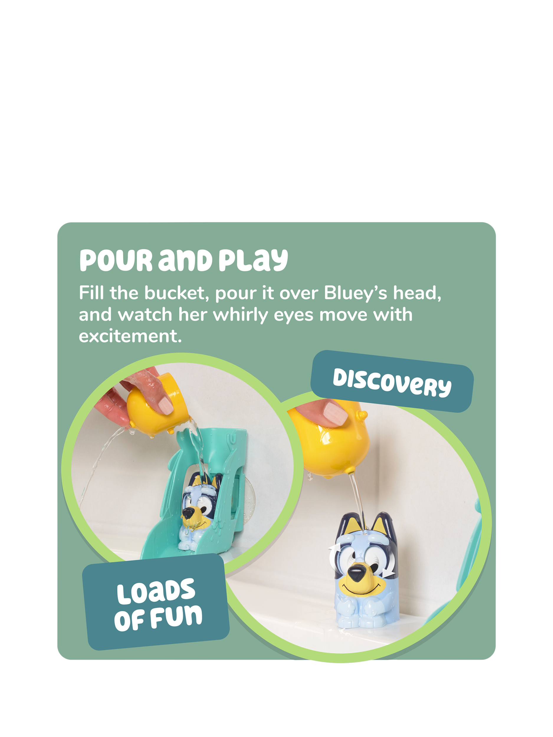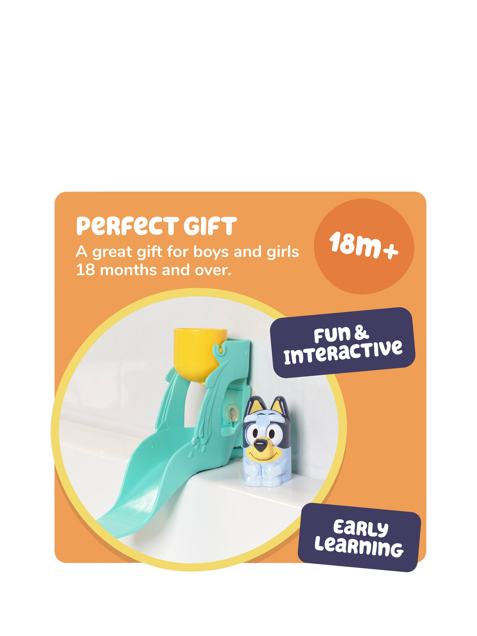 Pour water over Bluey to watch her silly, whirly eyes spin with excitement. Whether she's zooming down the waterslide or showing off her playful expressions, this Bluey bath toy turns bath time into an unforgettable adventure for toddlers aged 18 months and older.
