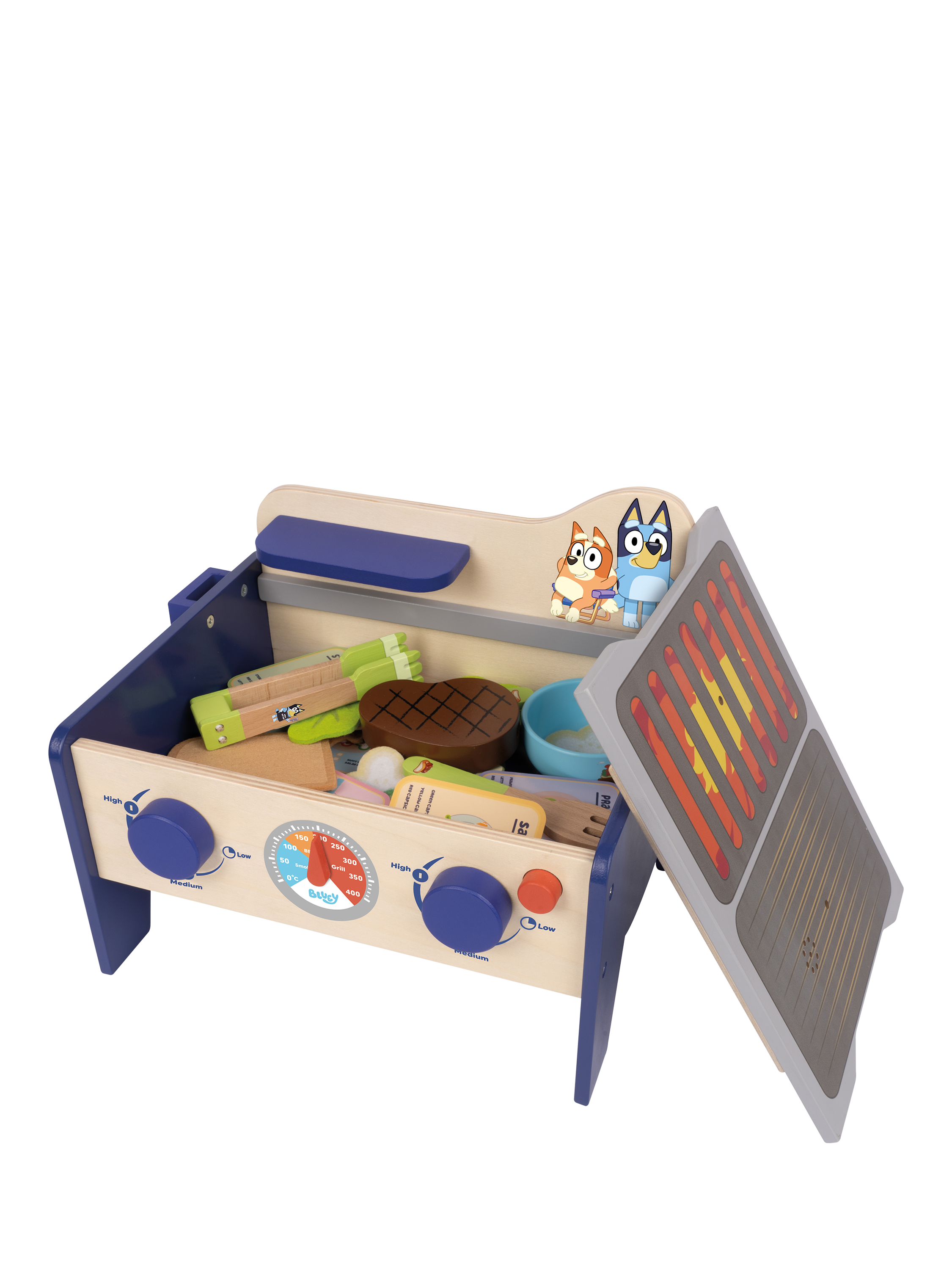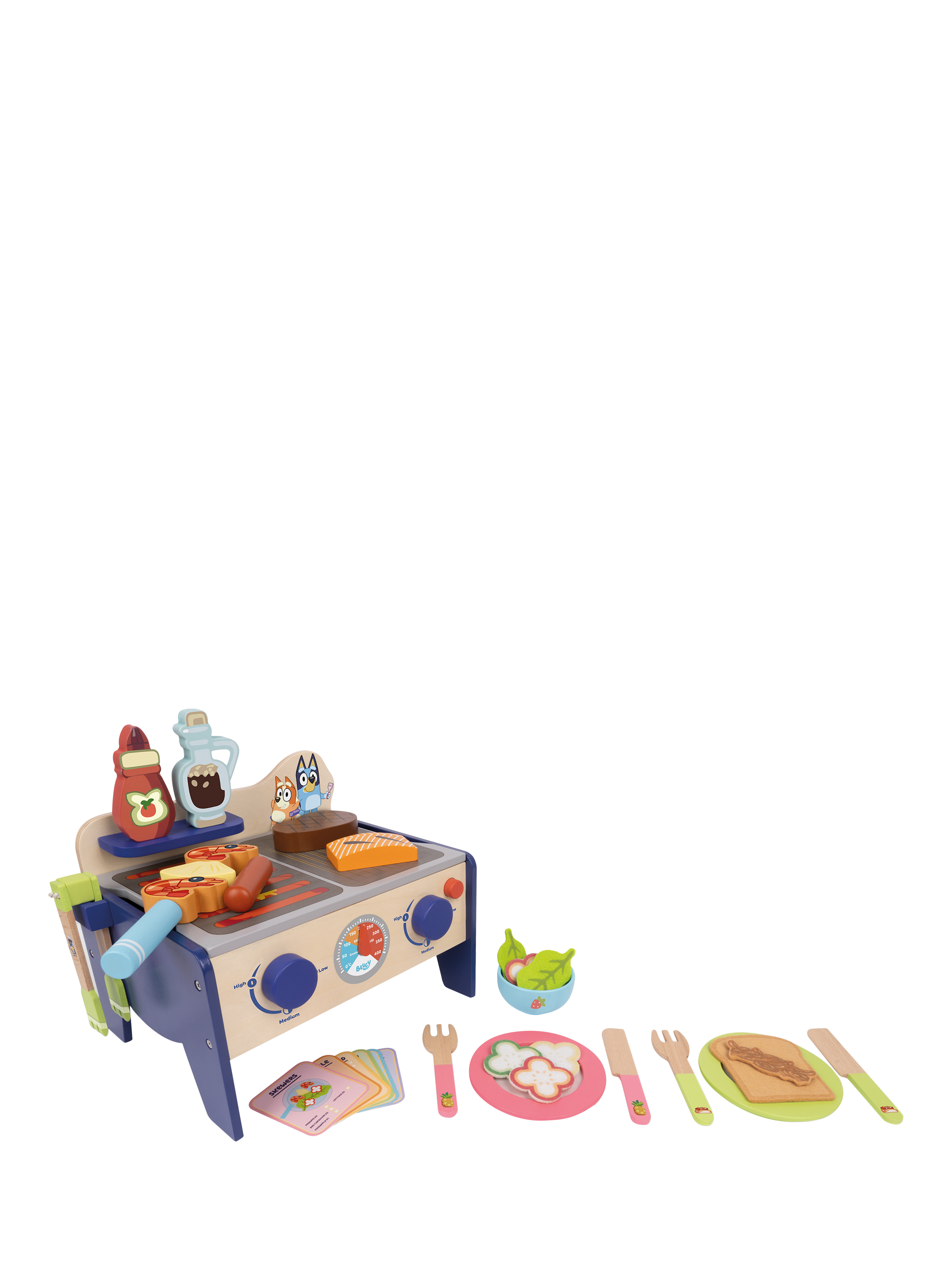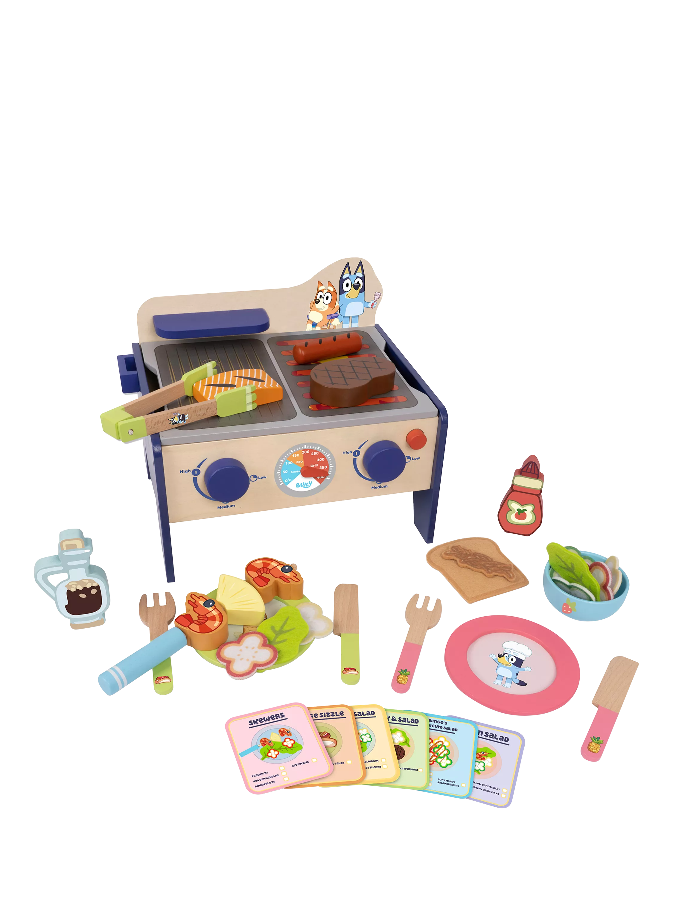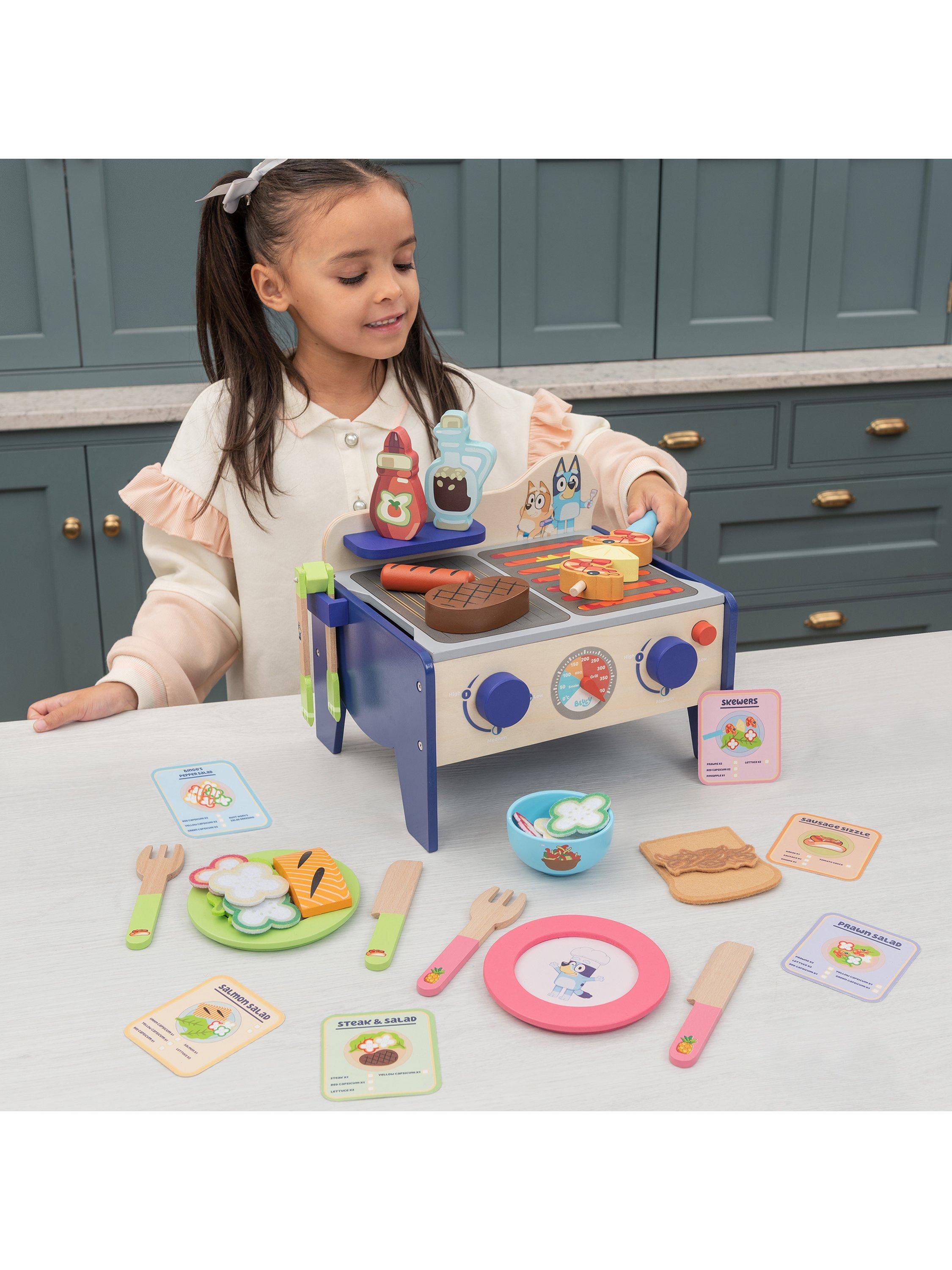 Cook up a delicious sausage sizzle or a healthy prawn salad with this interactive Bluey BBQ and Salad set.