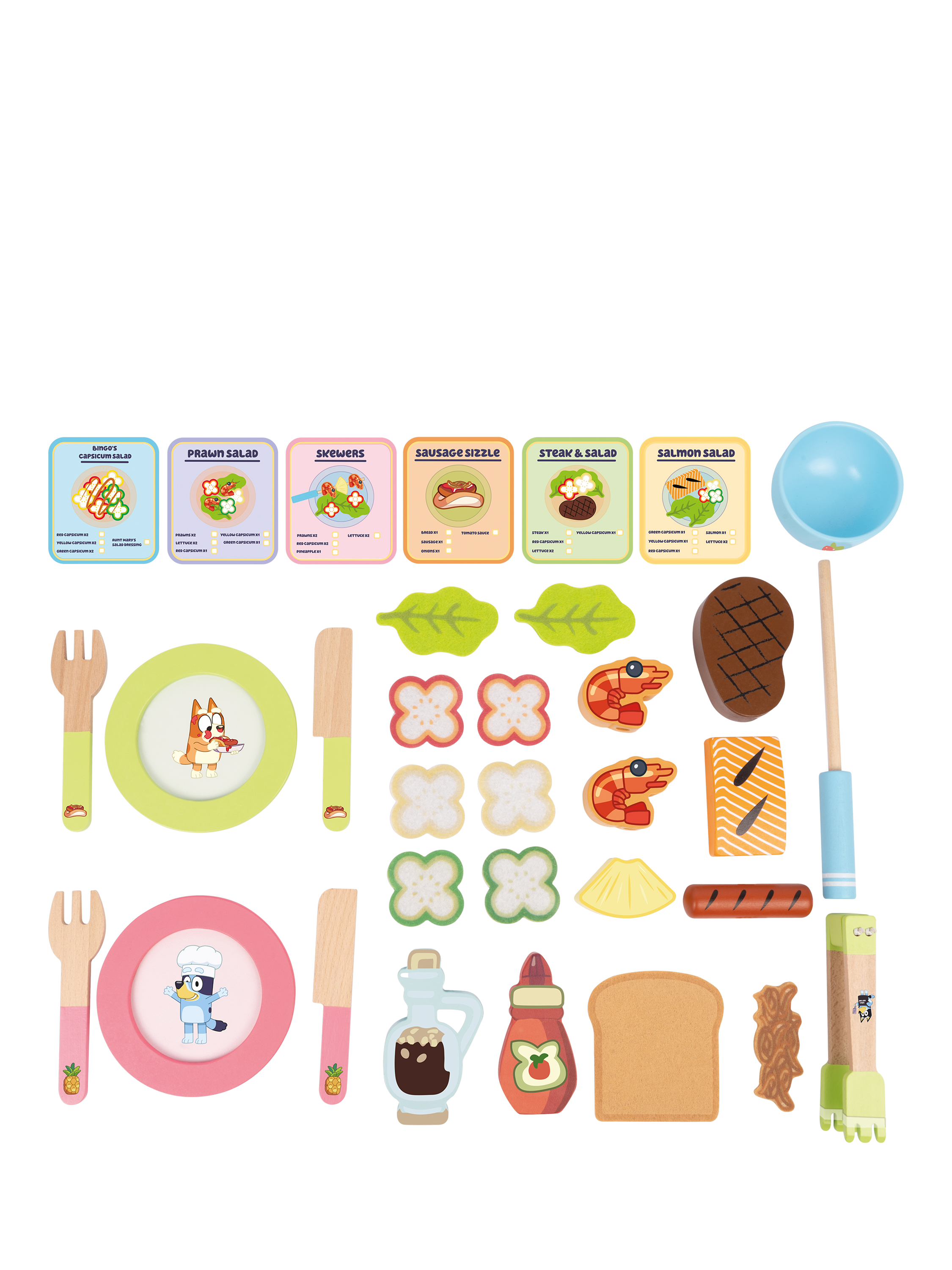 Bluey's BBQ and Salad Playset contains 33 wooden pieces to play with.