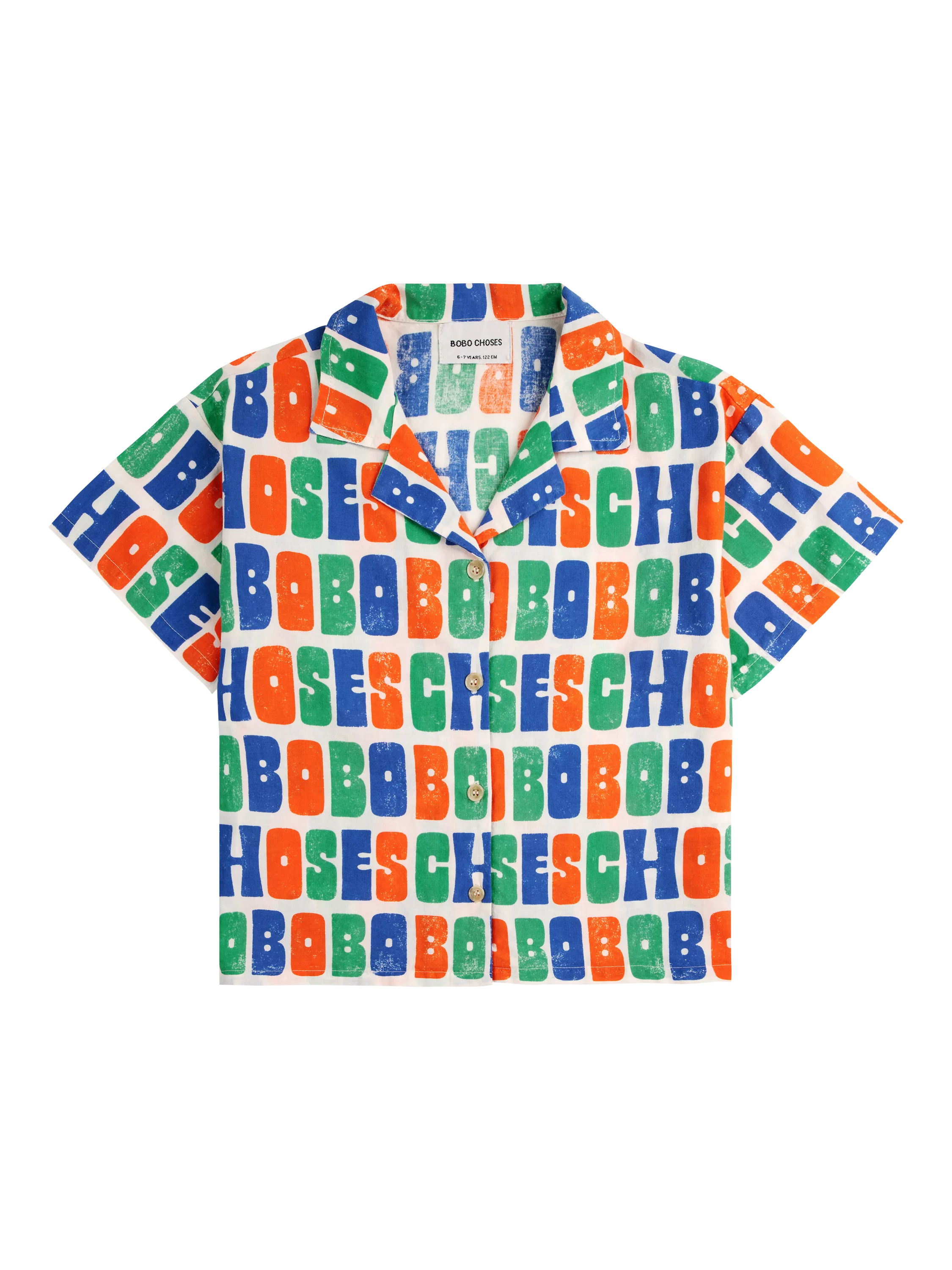 The Bobo Choses All Over Woven Shirt featuring a vibrant, artistic print on lightweight, breathable organic cotton fabric, perfect for a bold, playful look. A real eye-catcher.
