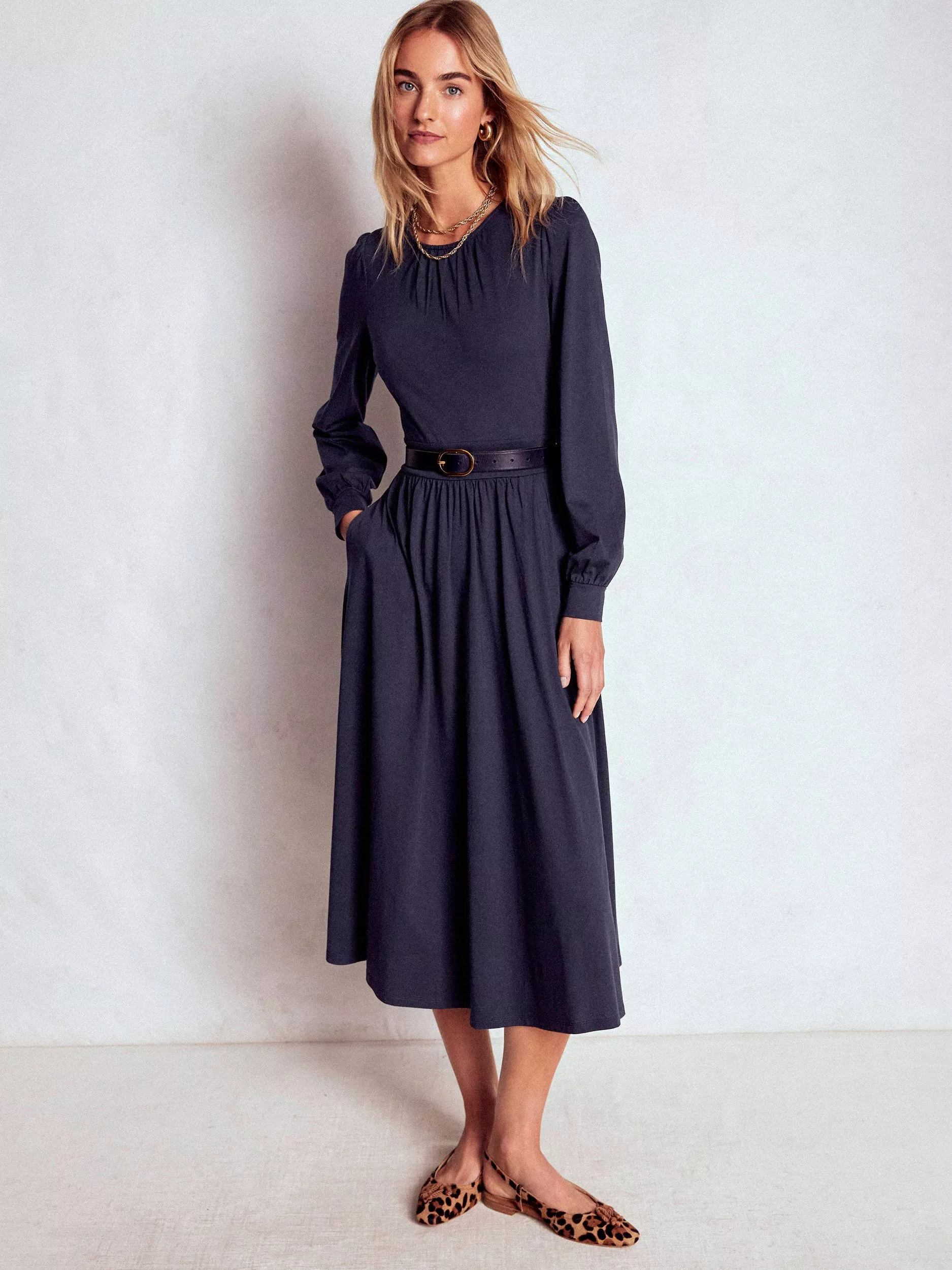 This fit and flare jersey midi dress offers soft comfort and all-day confidence. Its classic round neck and long sleeves make it easy to wear, while the cotton blend is designed with a touch of stretch for ultimate comfort.