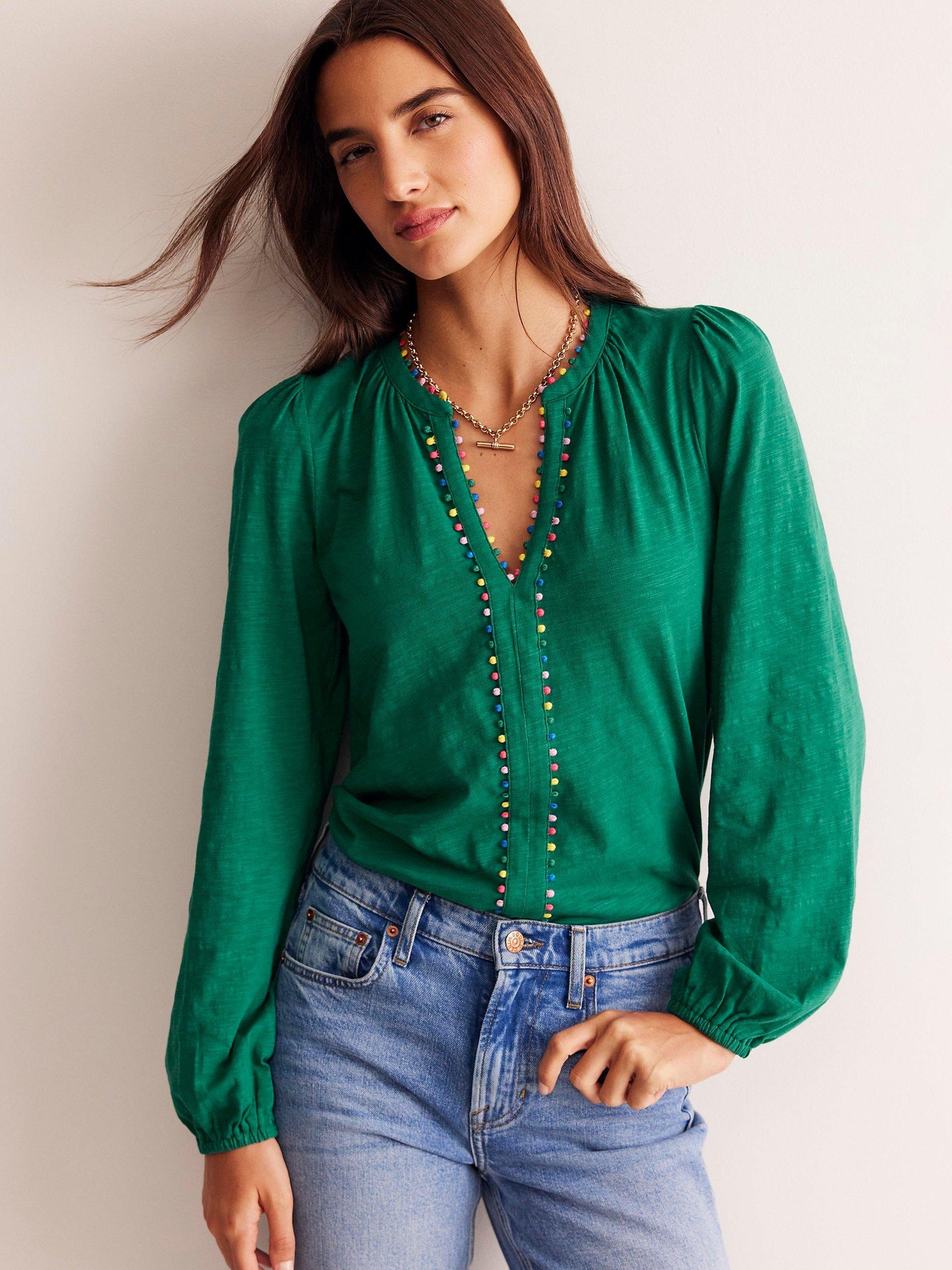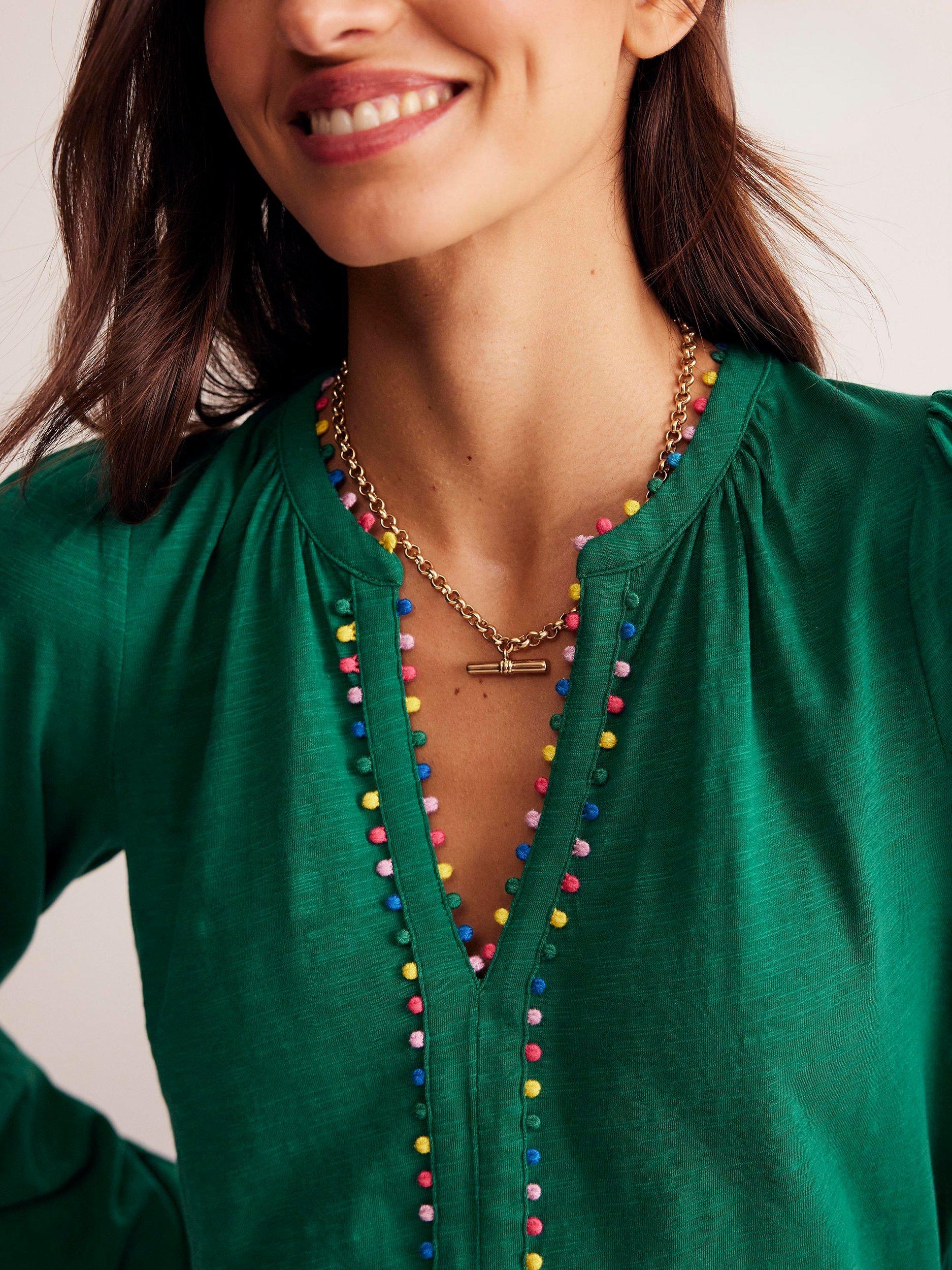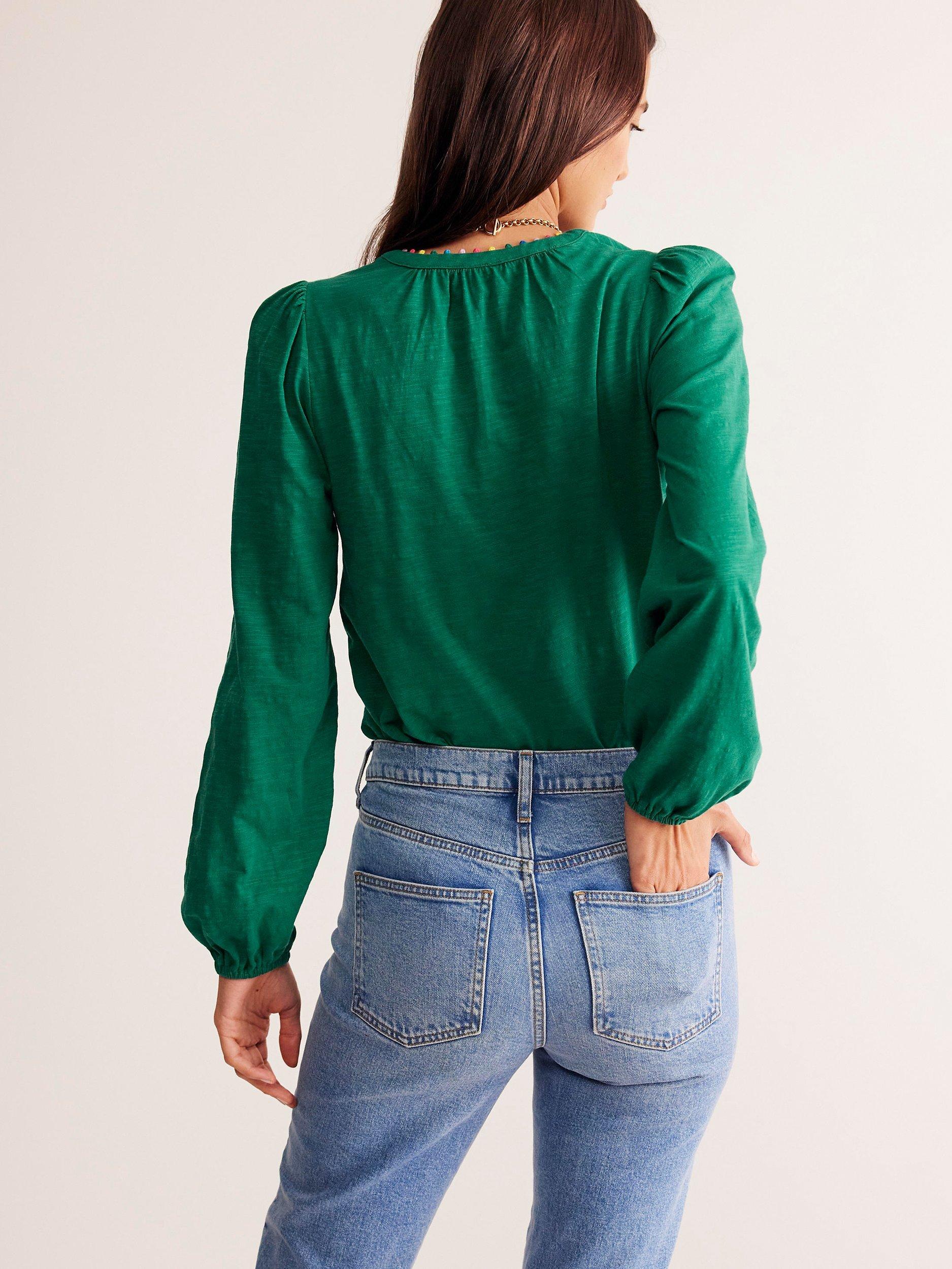 Ali is a blouson sleeve top made from easy jersey. A playful trim is added for a mood-boosting finish.