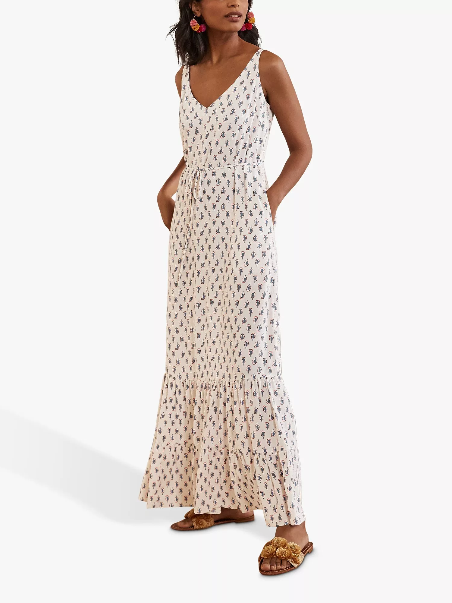 Boden has gone to town with the tiers on this super-summery dress. They feature on the hem of the full-and-floaty skirt, which flares out generously from the defined drawstring waist. At the top, a flattering wide V-neck is emphasised by the simple sleeveless shape. Natural drapey fabric with a subtly textured finish feels lightweight and comfortable to wear.