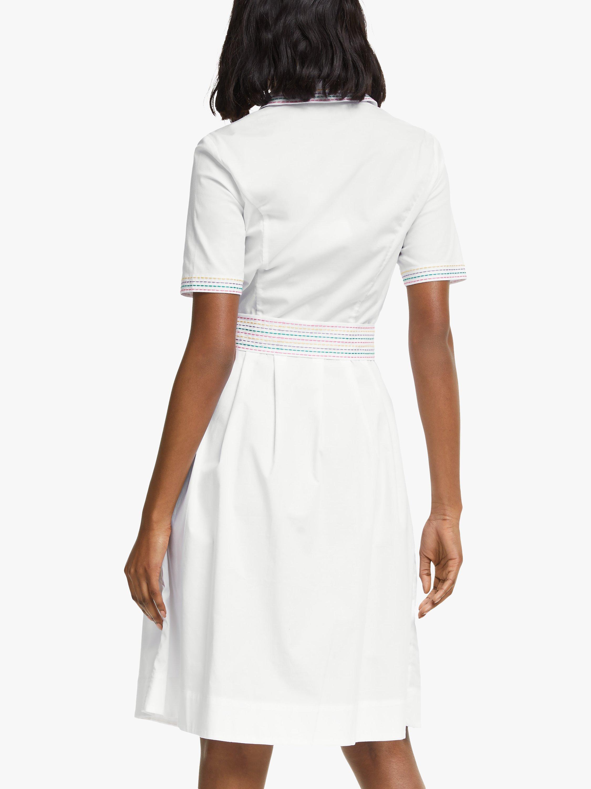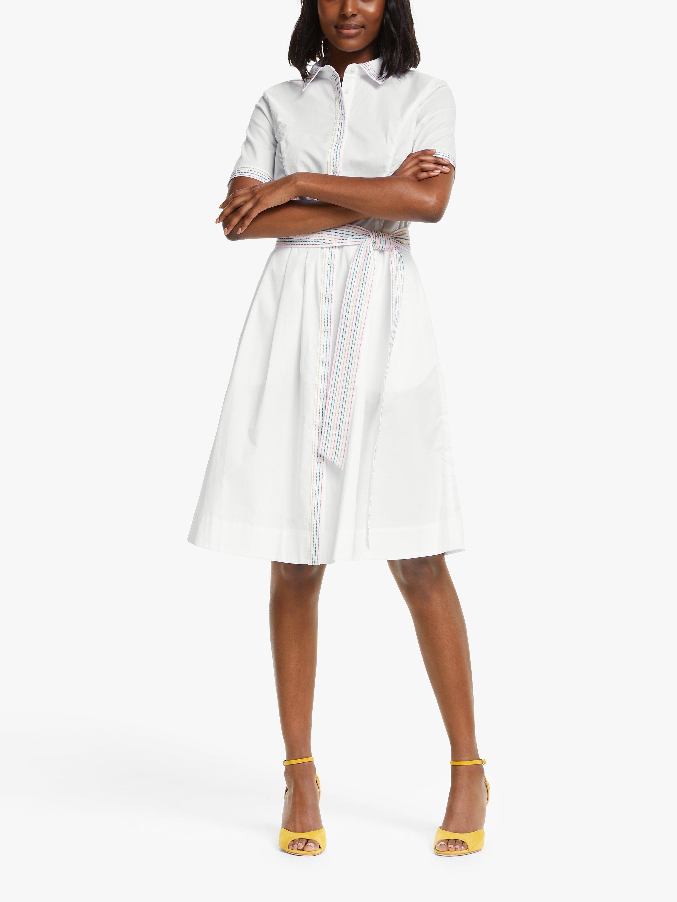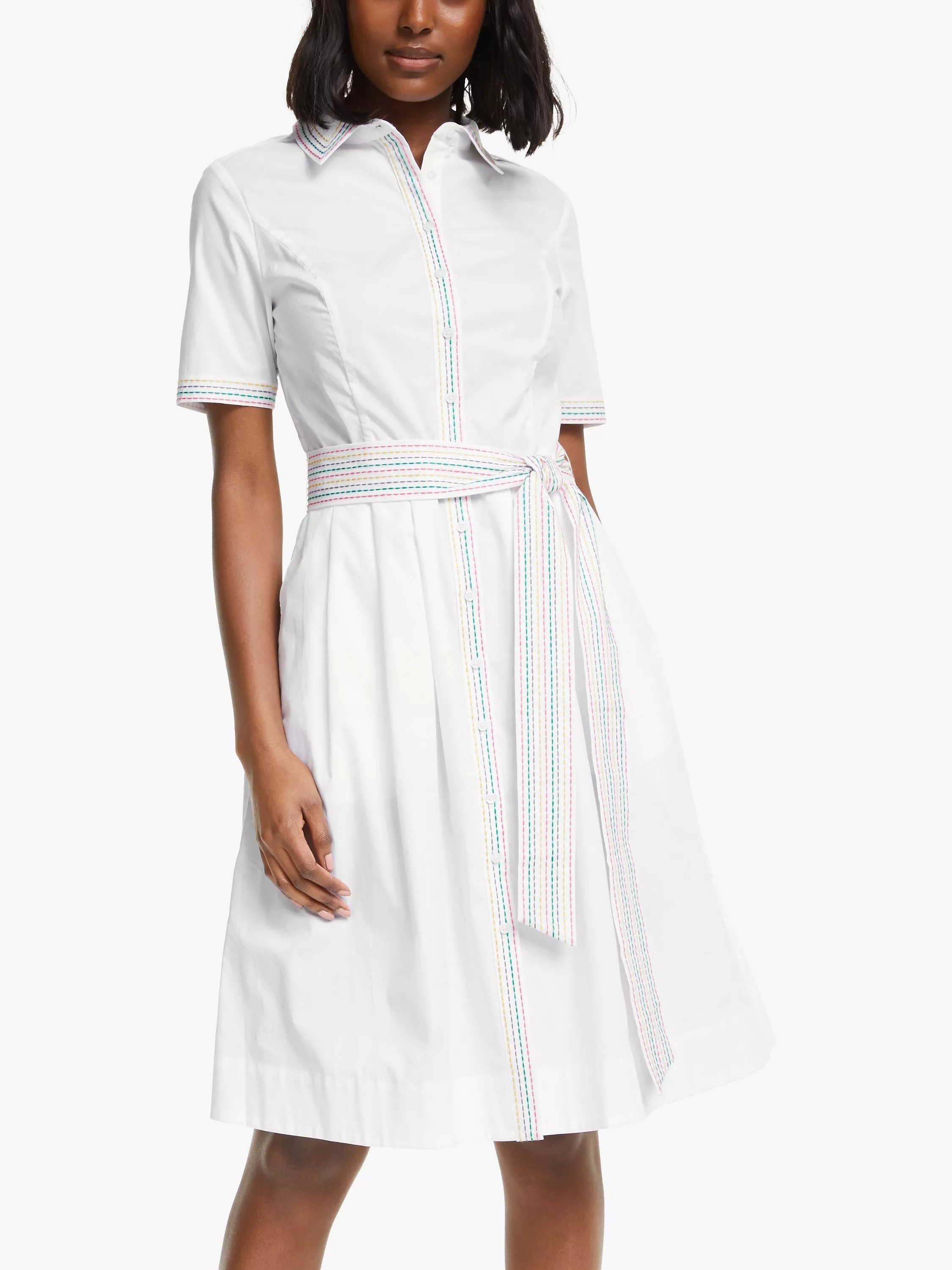 This Boden shirt dress updates your look ready for the warmer weather. The modern classic combines short sleeves, a tie waist and a full, flared skirt. Completed with pretty stitching, this looks great with heels or sandals.