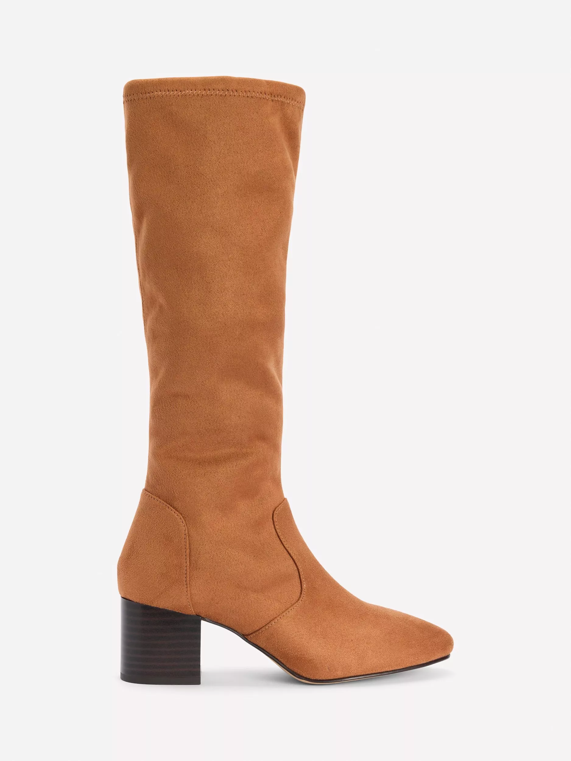 These knee-high boots combine comfort and style and are crafted from stretchy faux suede for a close-but-flexible fit. Plus, the barely there block heel means you can wear them all day without any pinching.