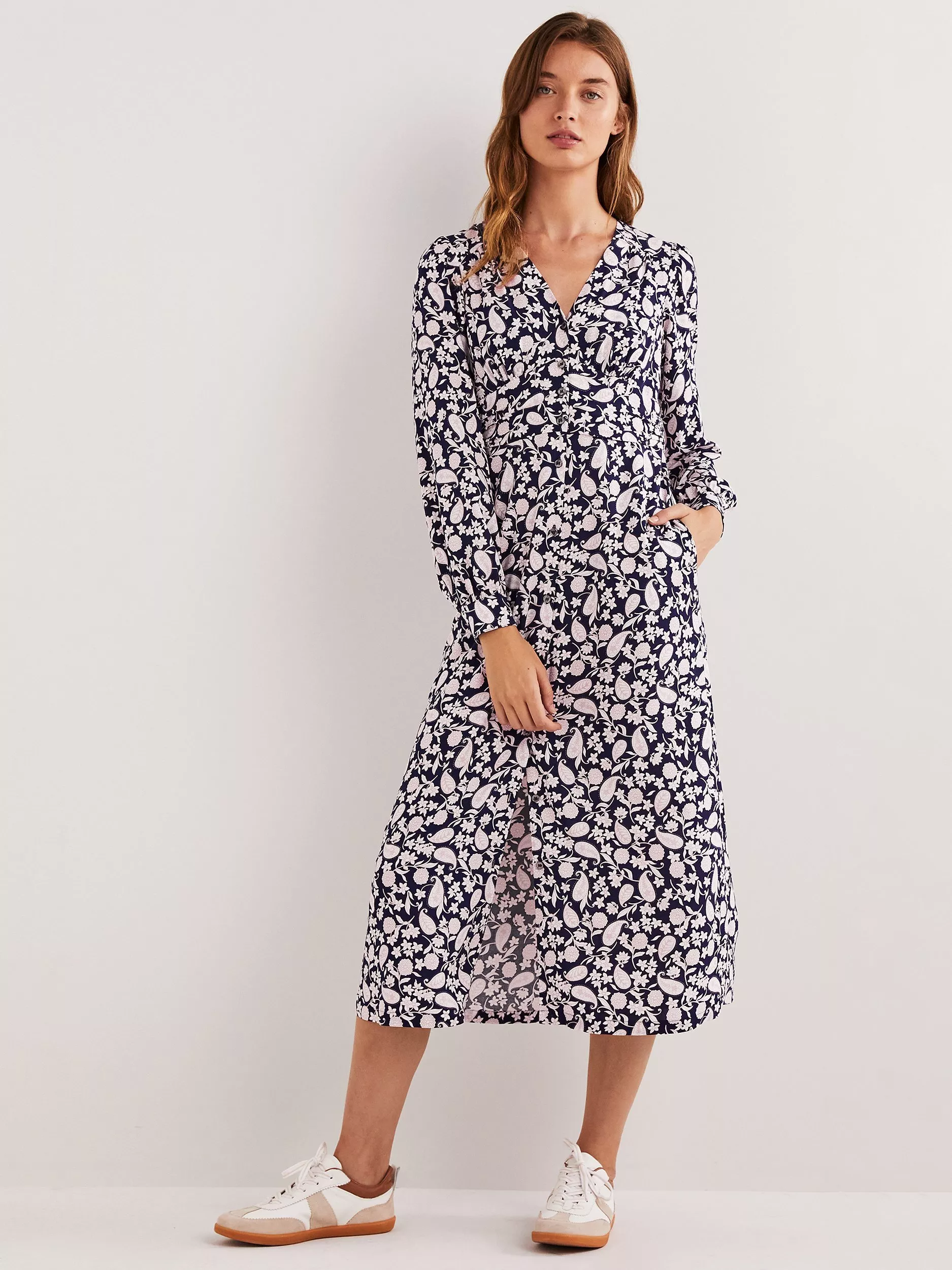 Repping vintage style with its tea shape silhouette, this midi dress by Boden is printed with fresh florals throughout.