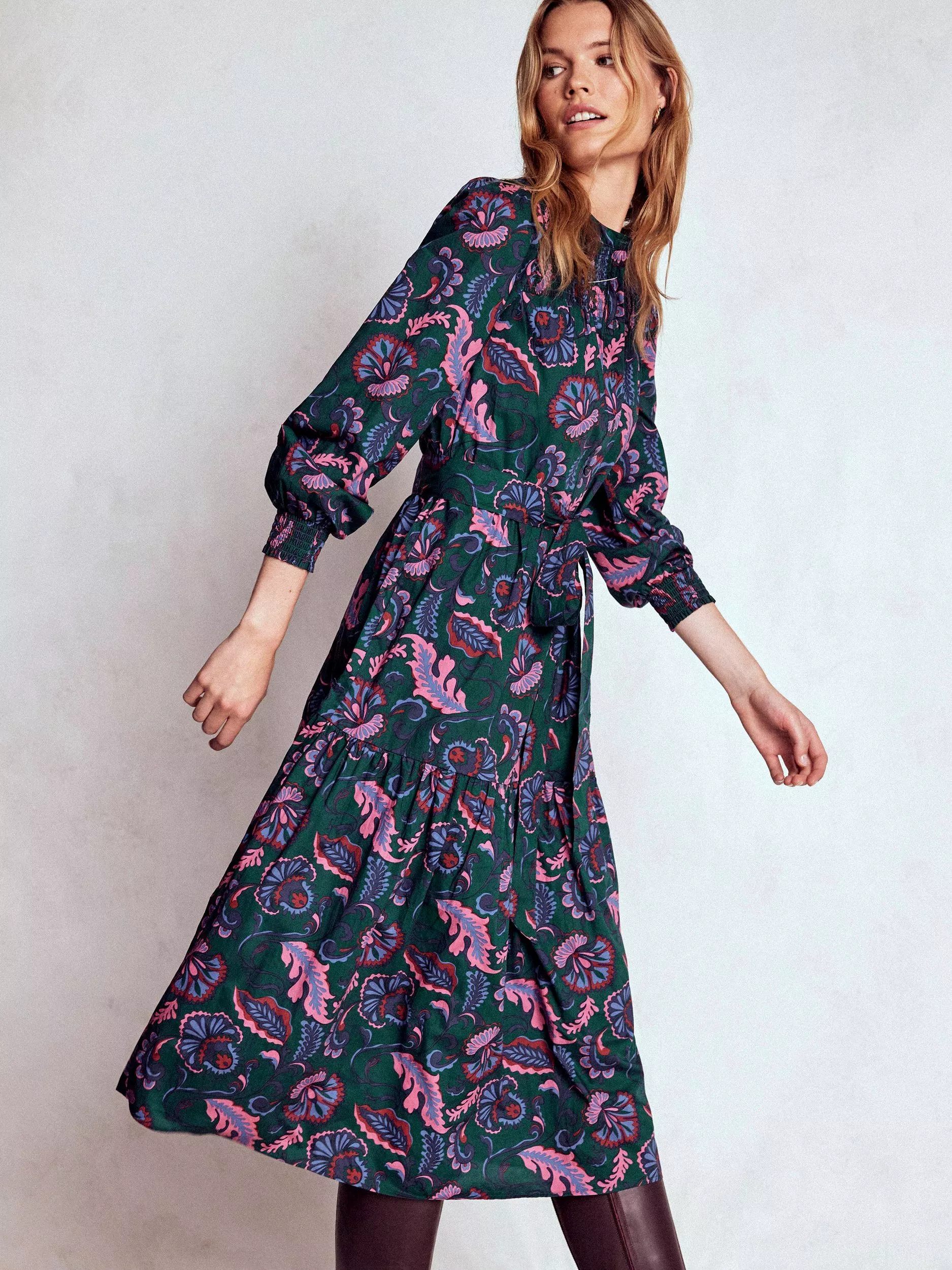 Tiered to perfection. This long sleeve cotton midi dress by Boden features a crew neck and a nature-inspired pattern.