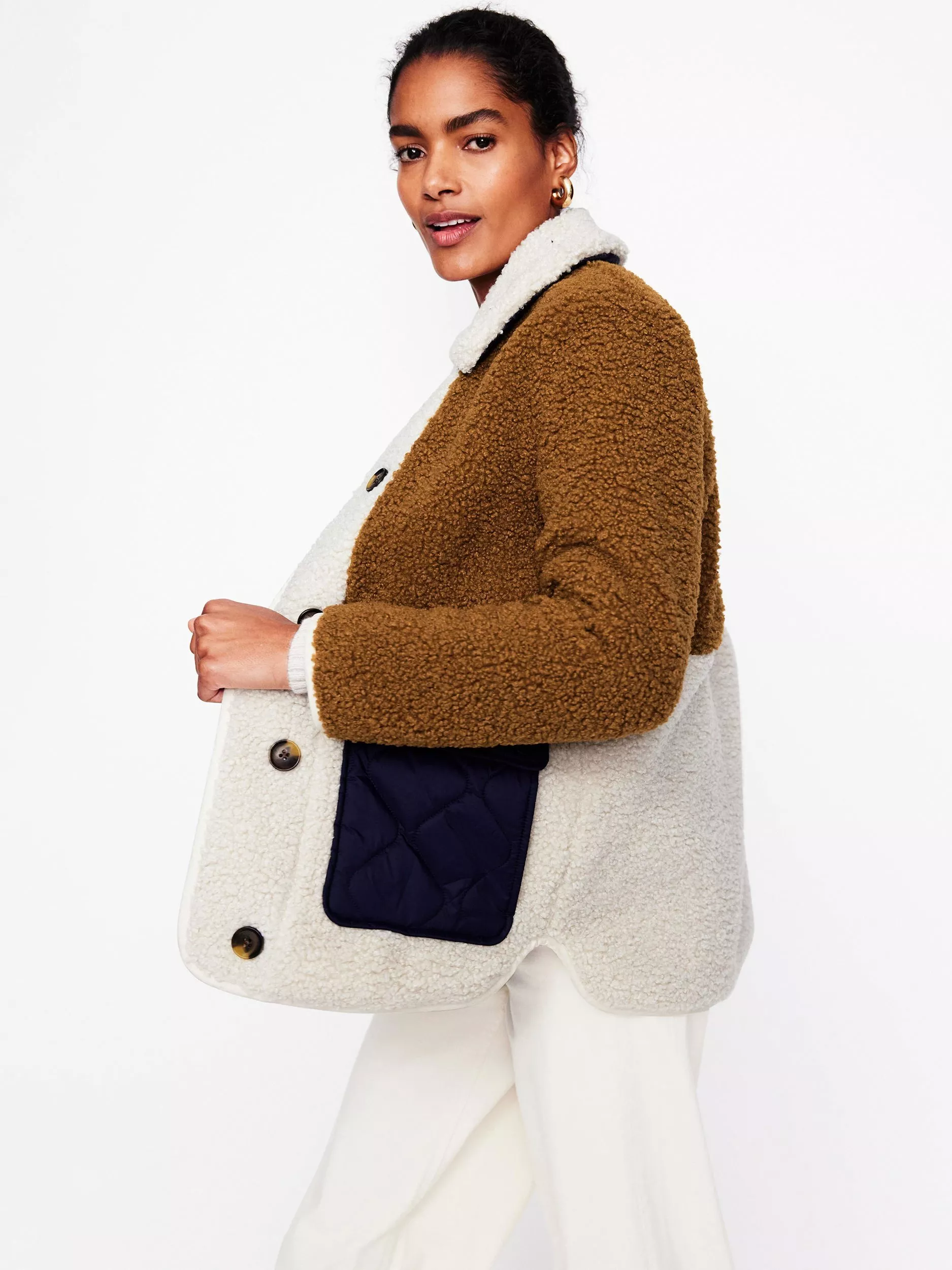 The Chester jacket is made for in-between weather days. The quilted fabric is accented with borg panels and there's a removable borg collar for when the sun does come out.