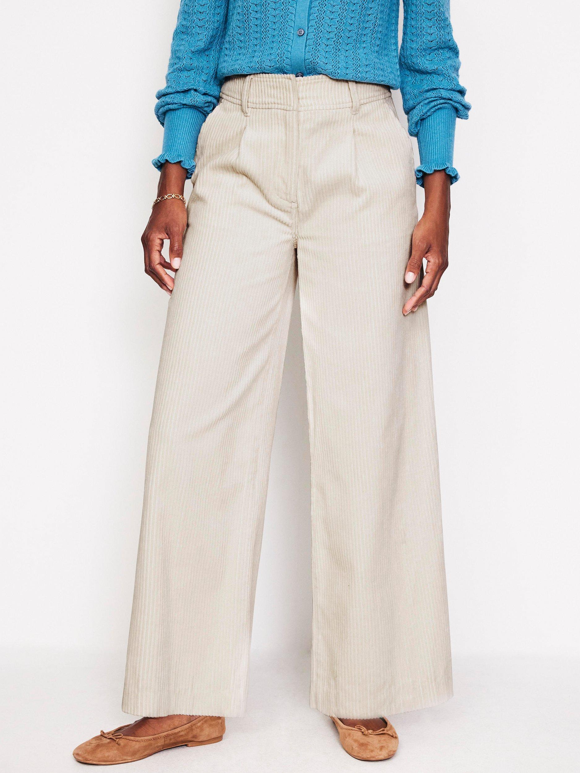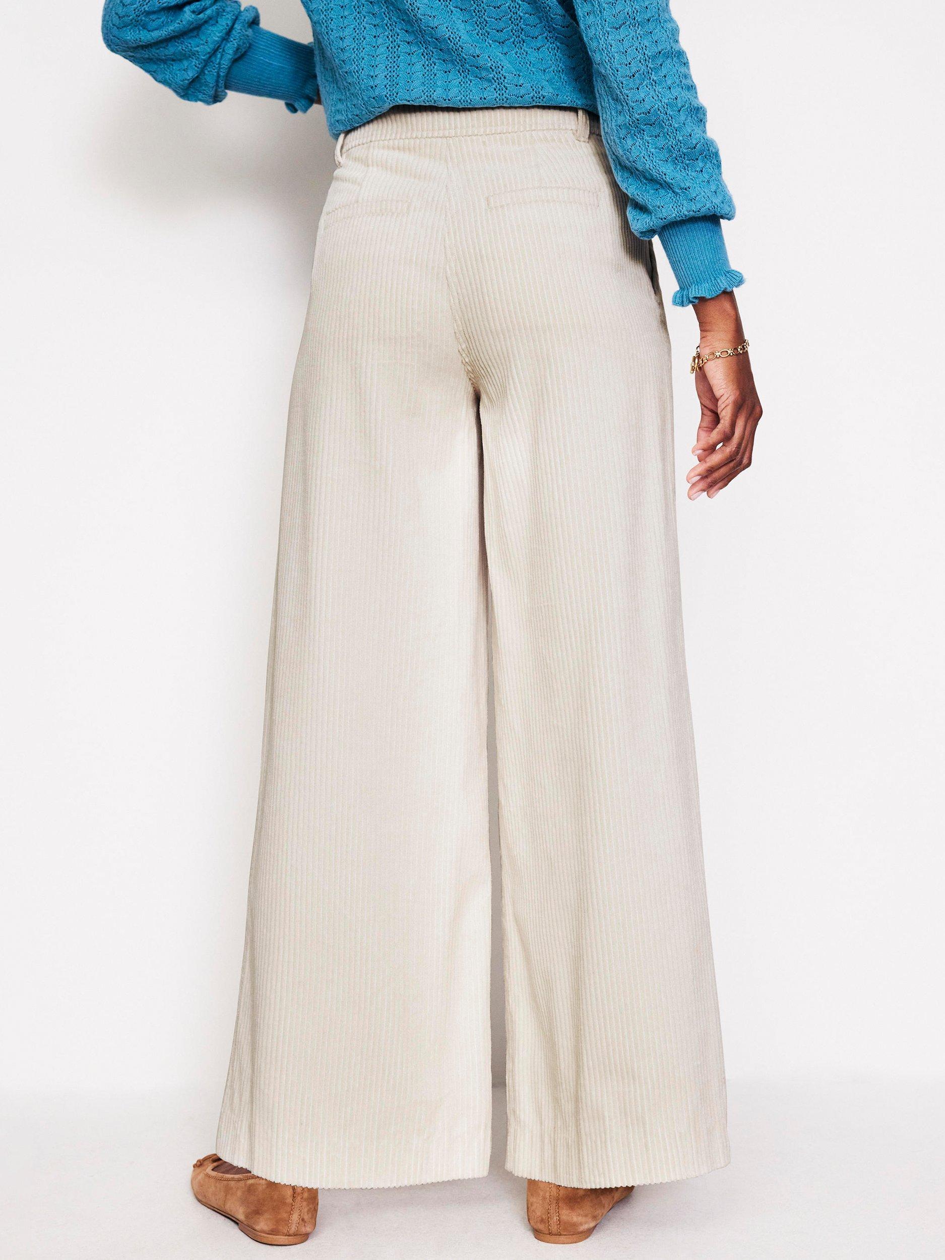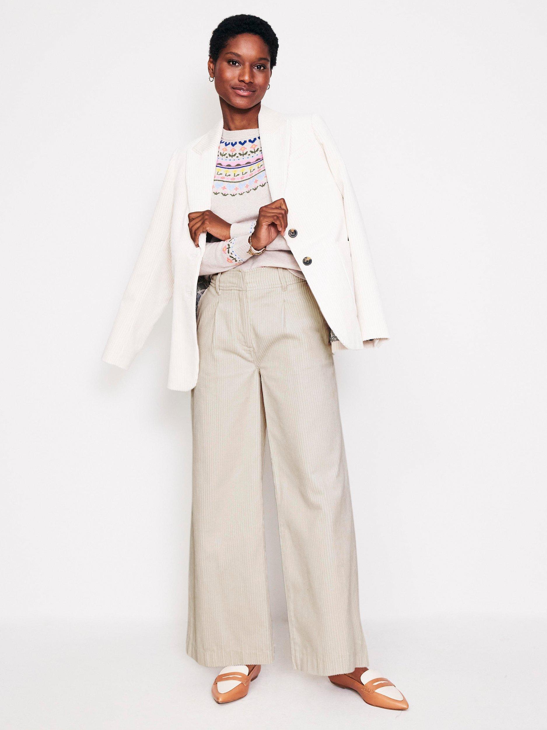 The Chiswick cord trousers are fitted through the hips and fall into wide-cut legs. They are perfect for long walks in the park.