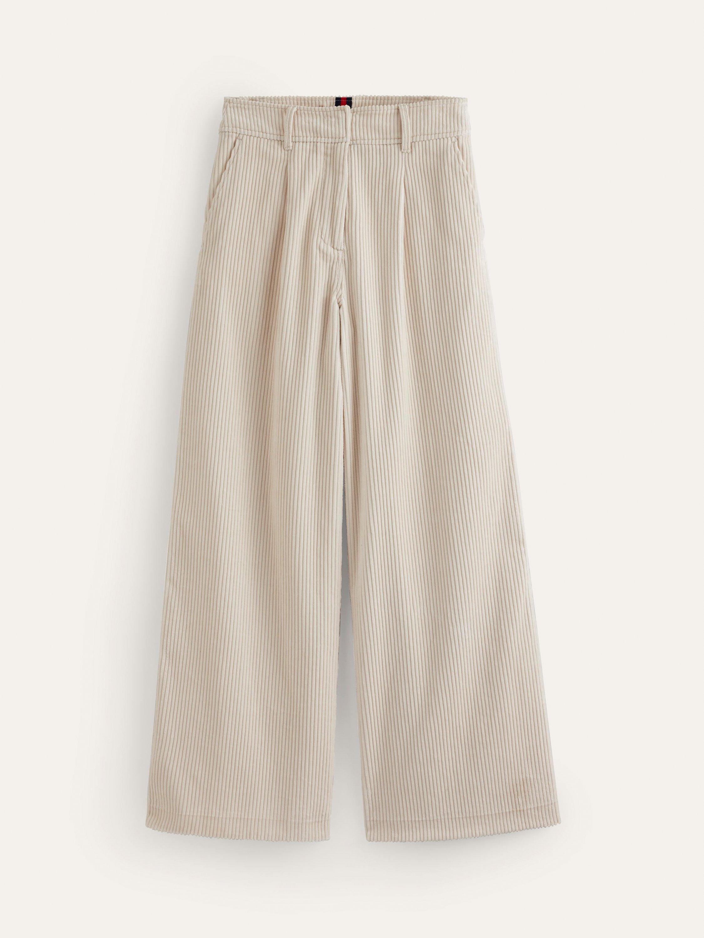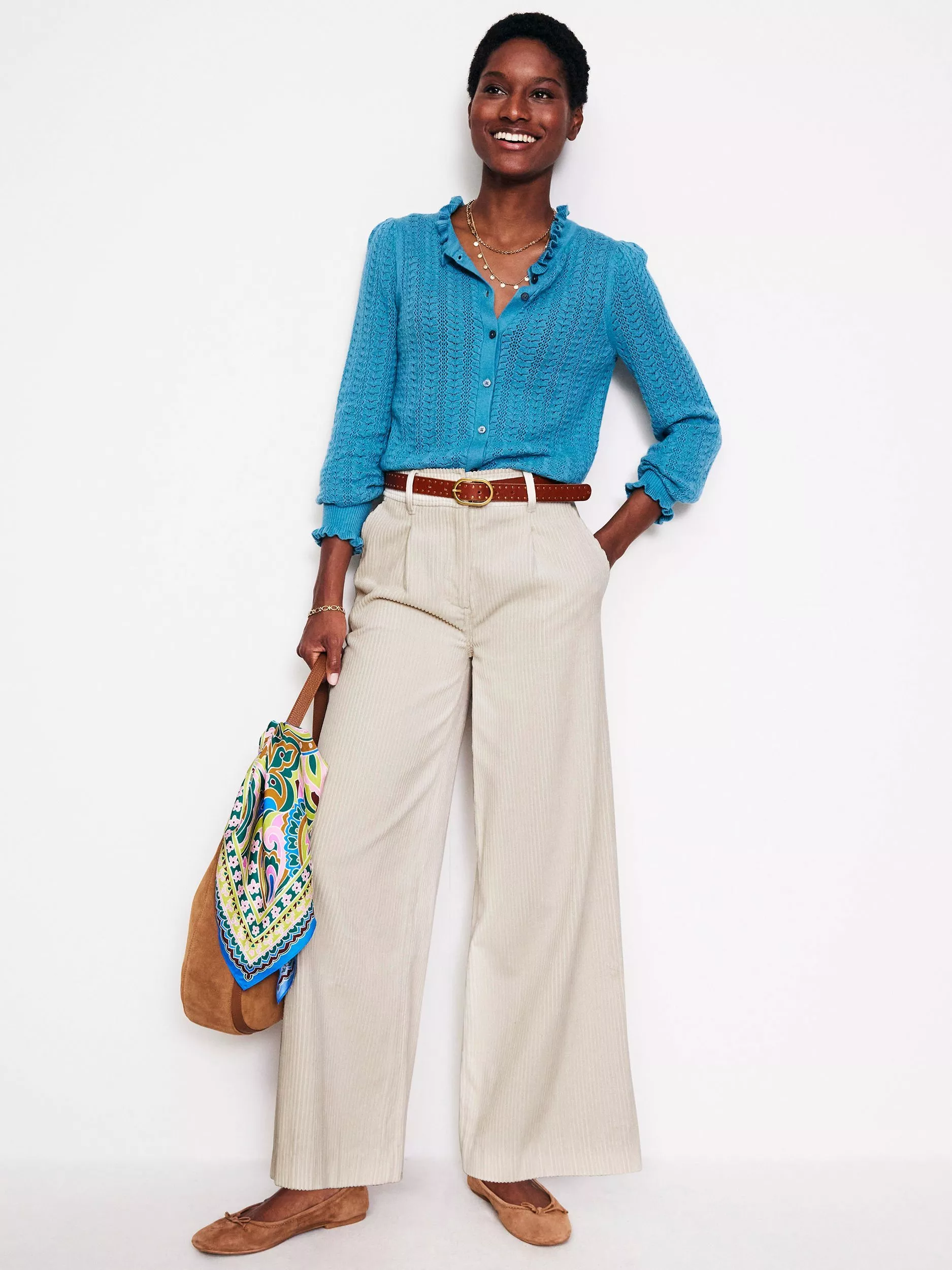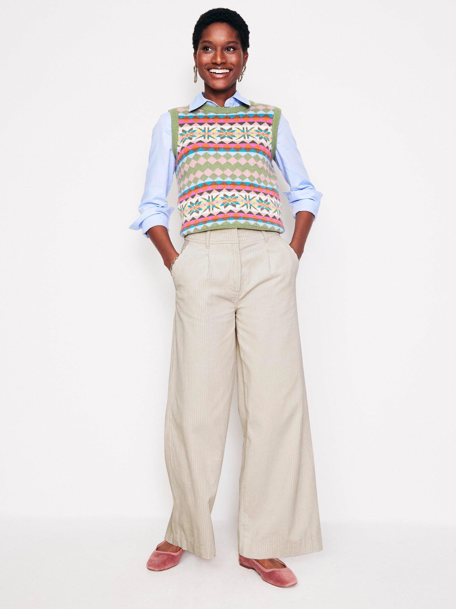 The Chiswick cord trousers are fitted through the hips and fall into wide-cut legs. They are perfect for long walks in the park.