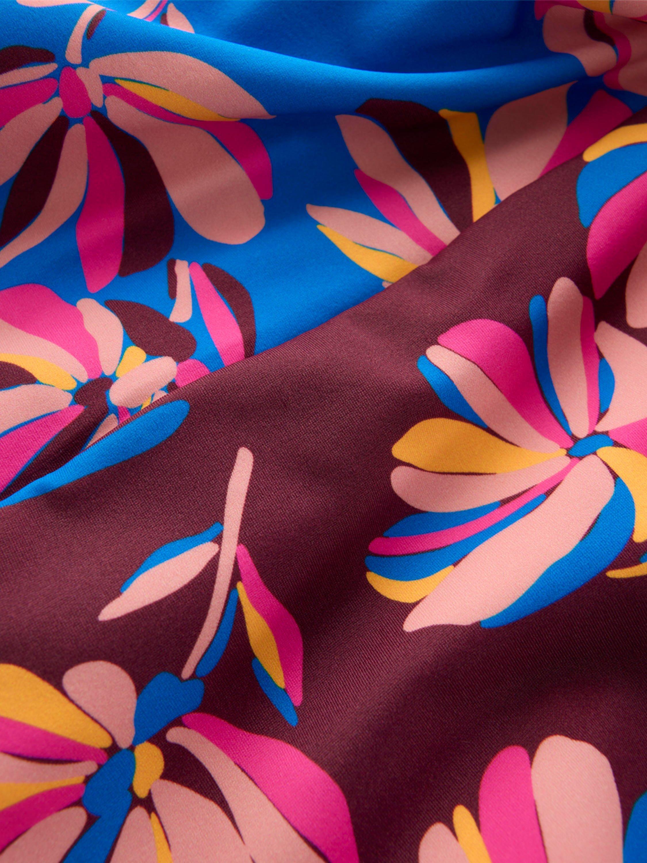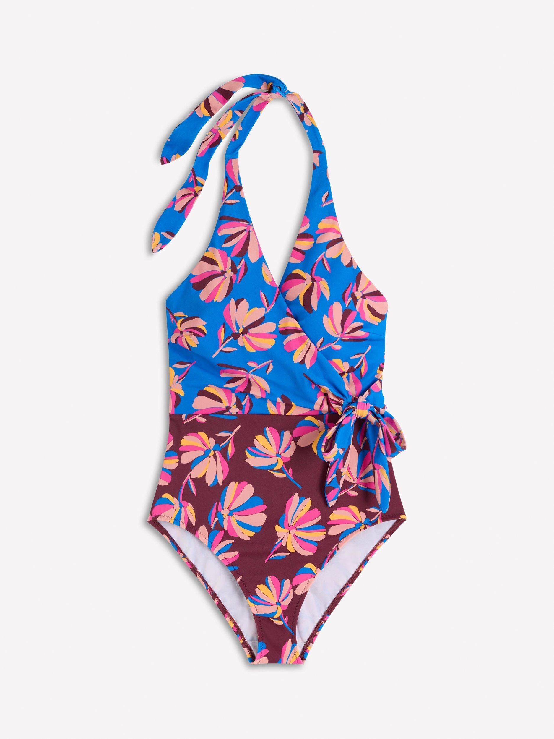 With its wraparound style, chic tie and bold print, this halterneck swimsuit has a touch of retro glamour. Just add giant sunglasses.