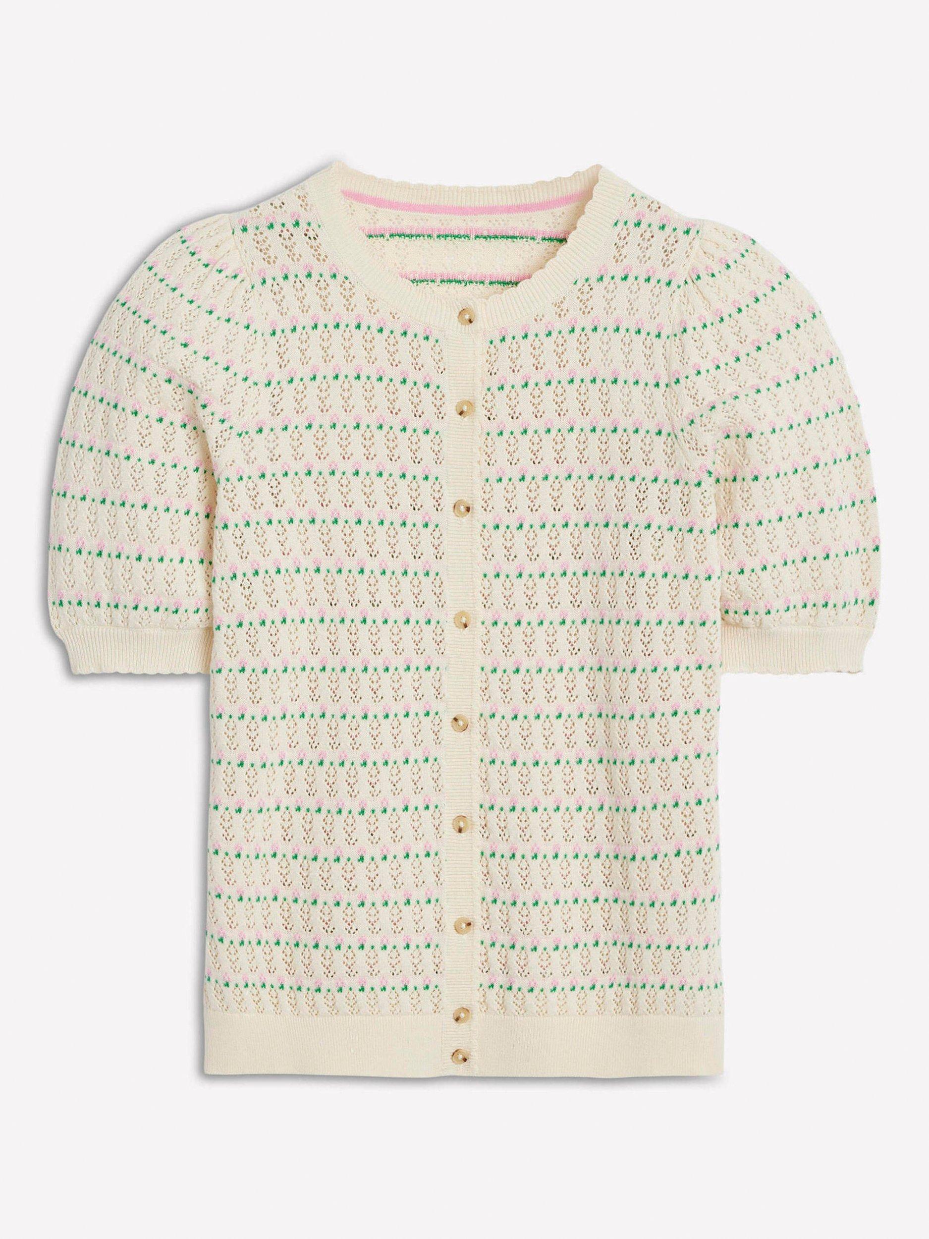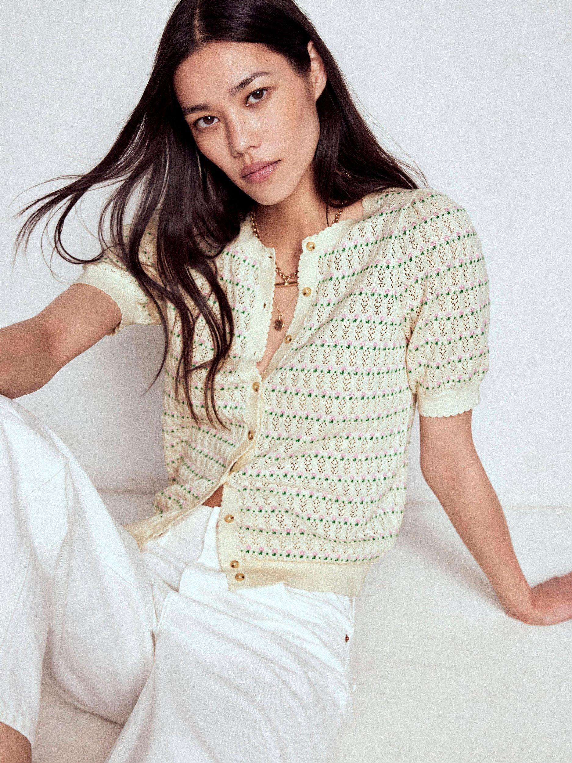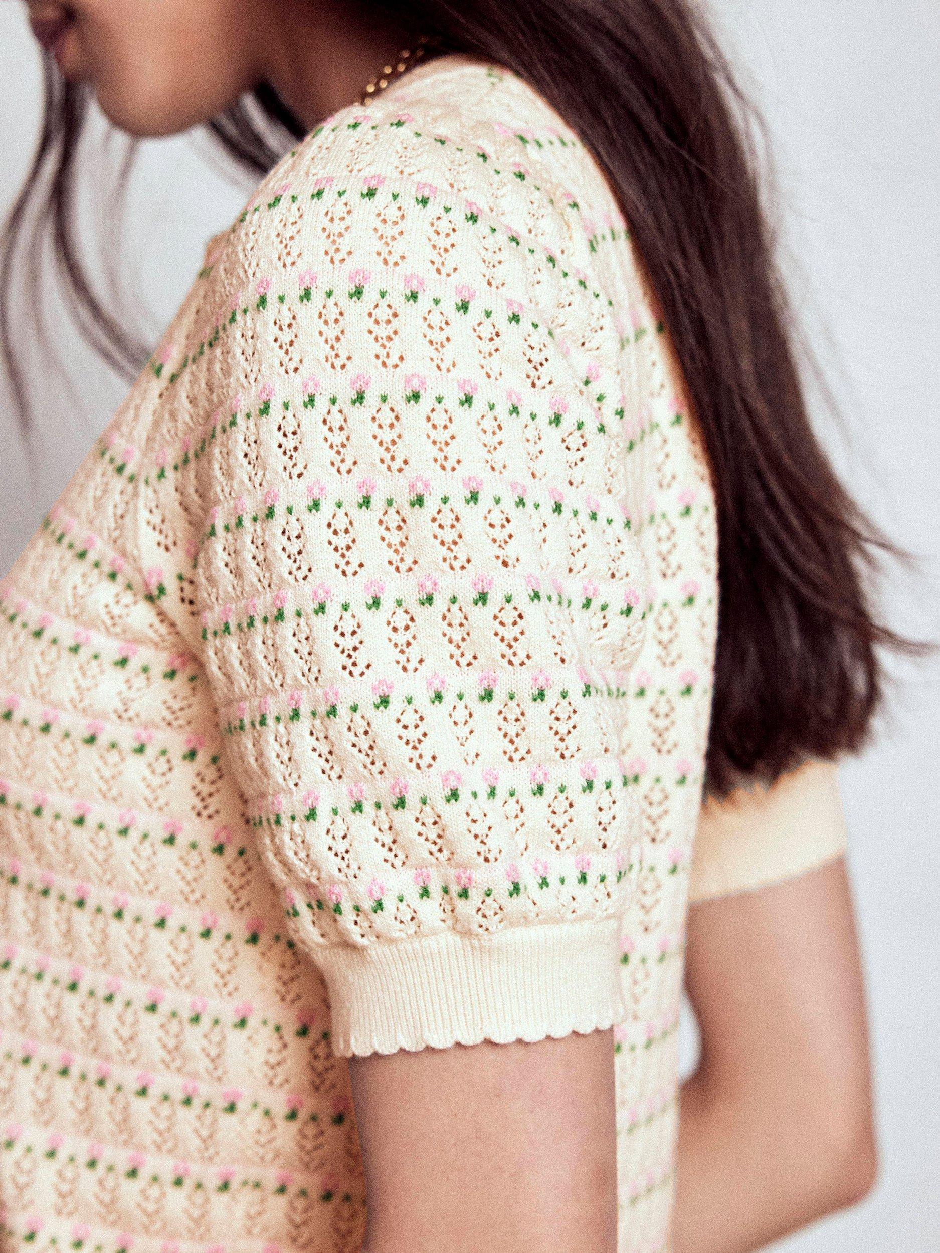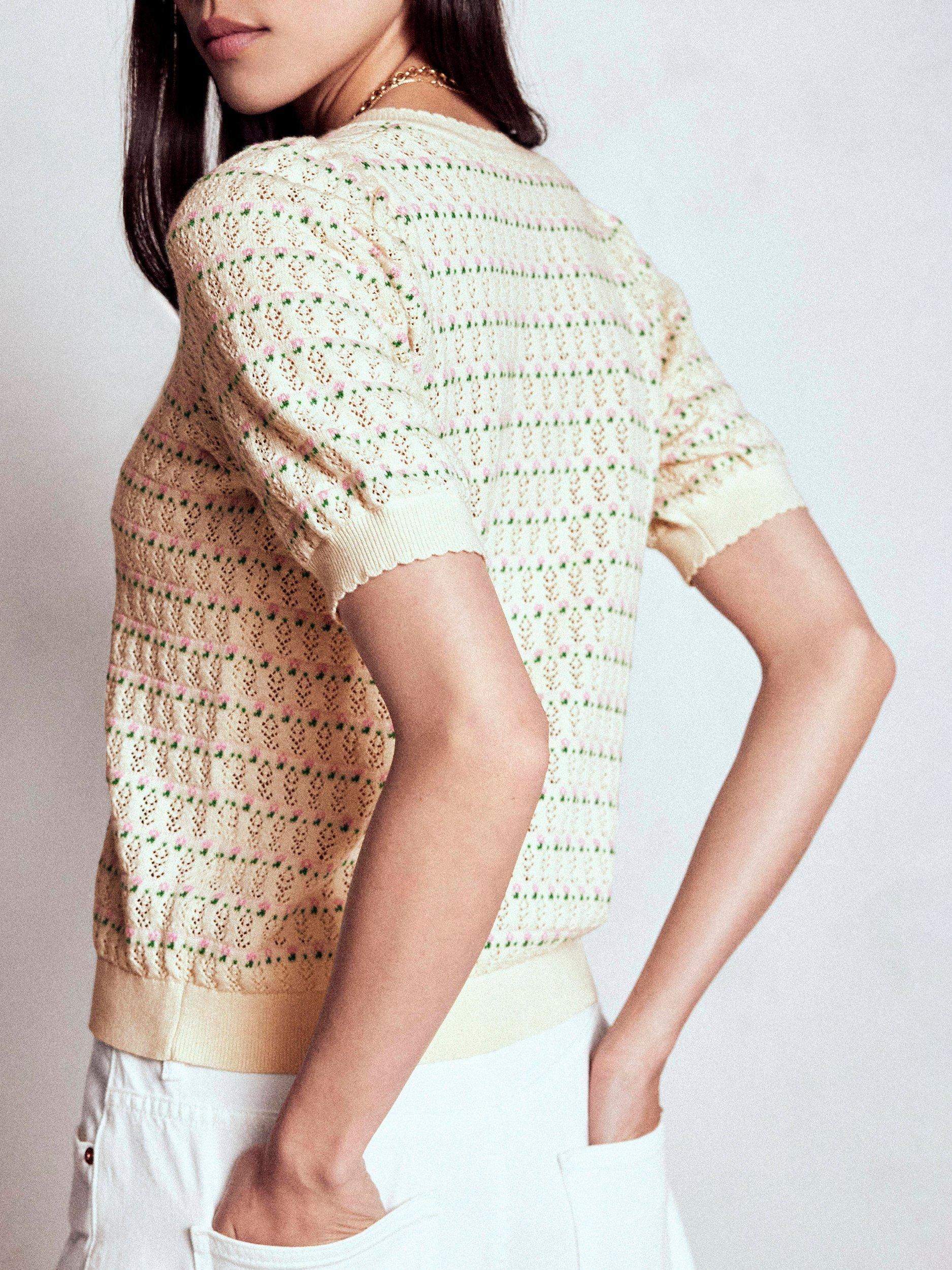 You can count on Dot to elevate your everyday look with delicate pointelle stitch, short puff sleeves and scalloped trim. Make this romantic layer your new go-to summer knit.