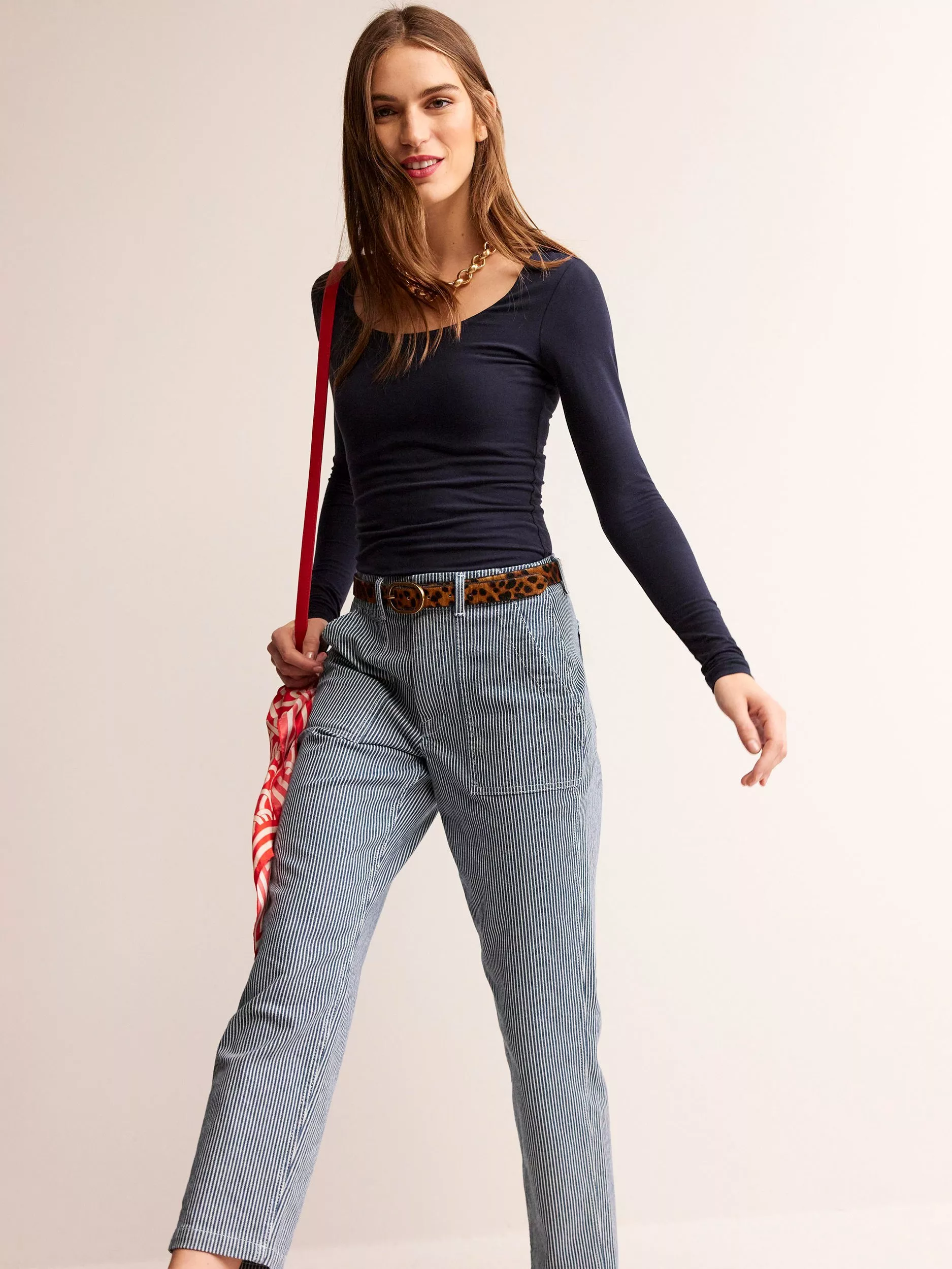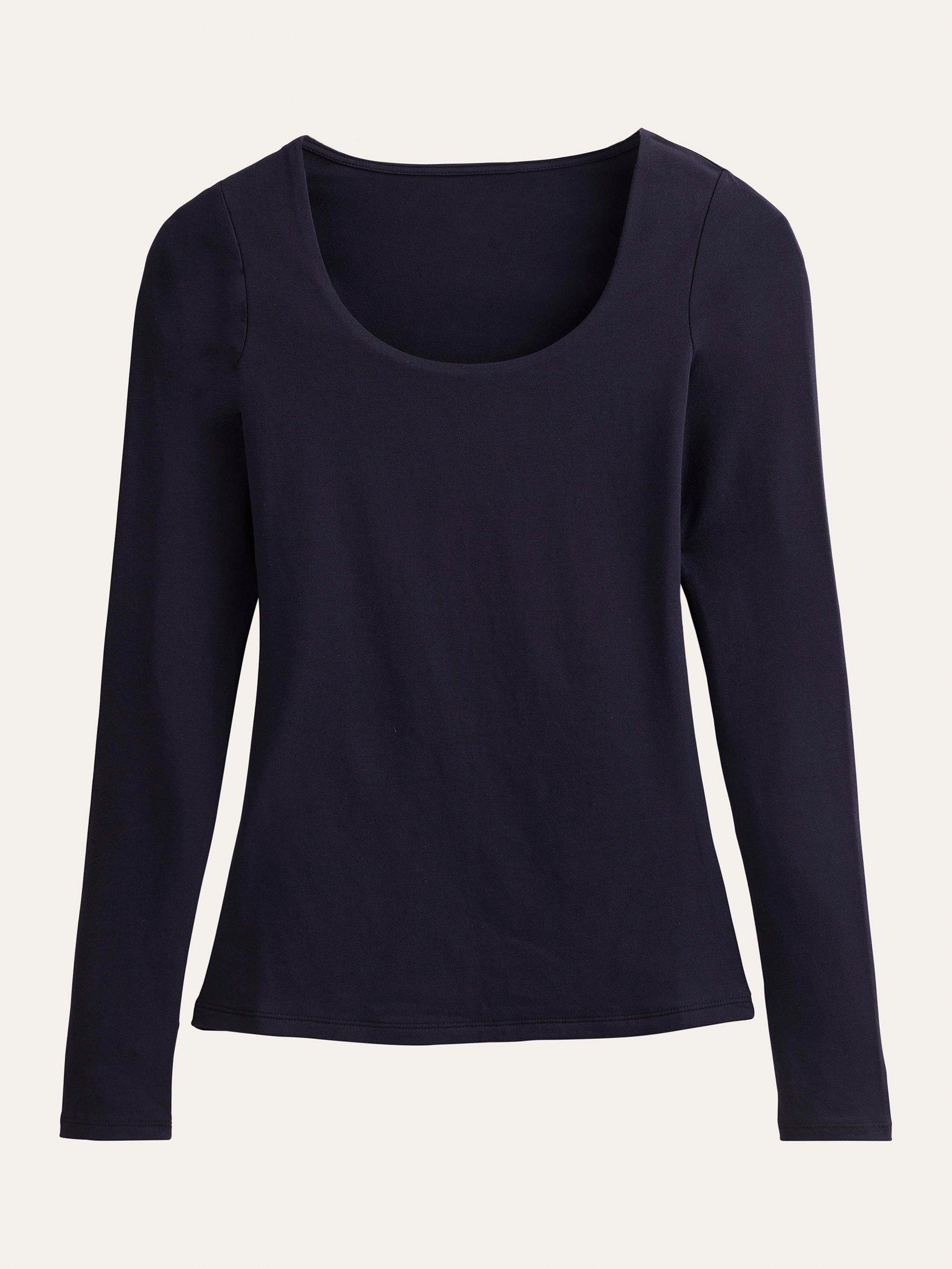 A wardrobe staple, this long-sleeve T-shirt has a scoop neck and is made using two layers of cotton with added stretch for a fitted look.