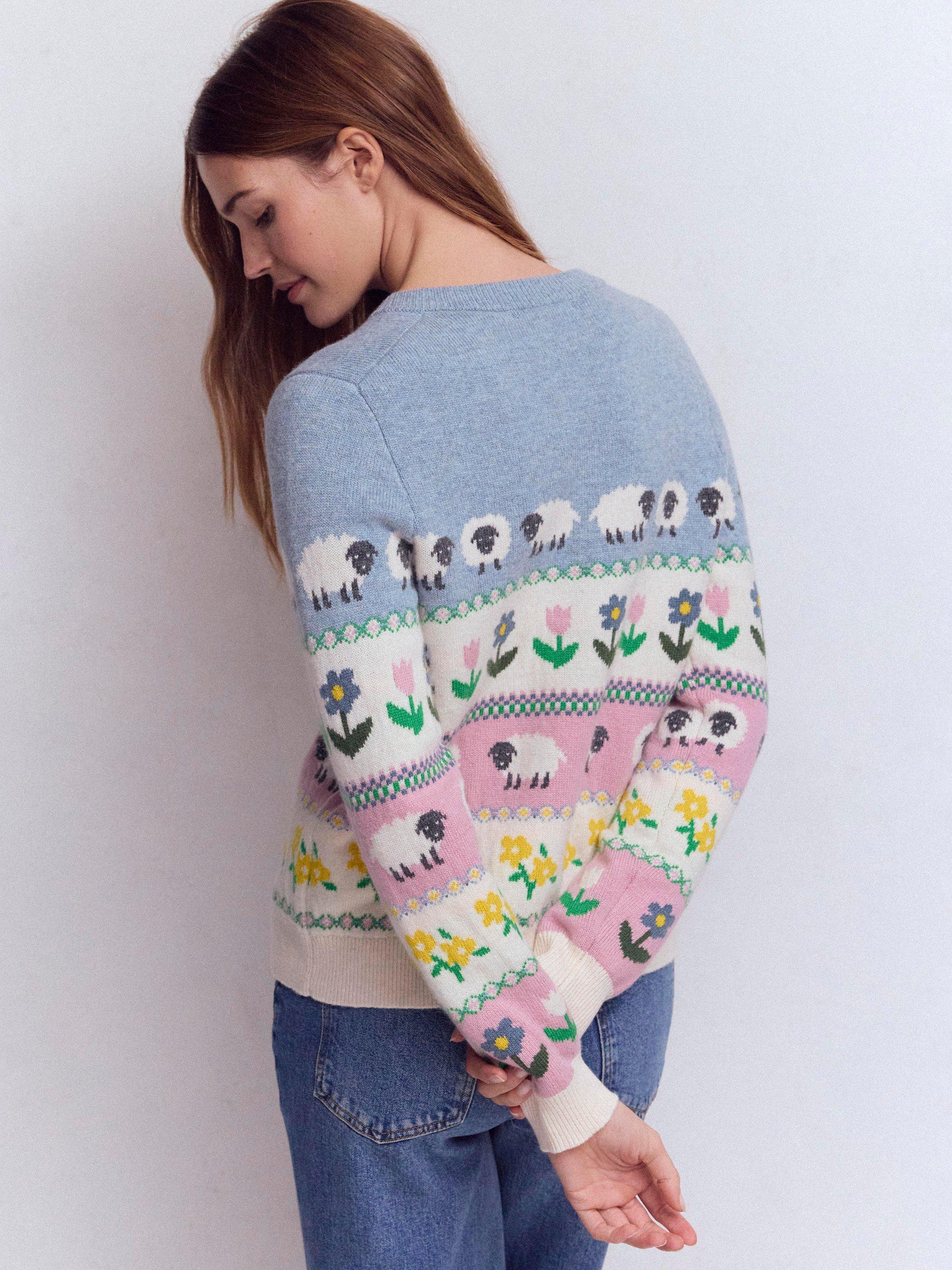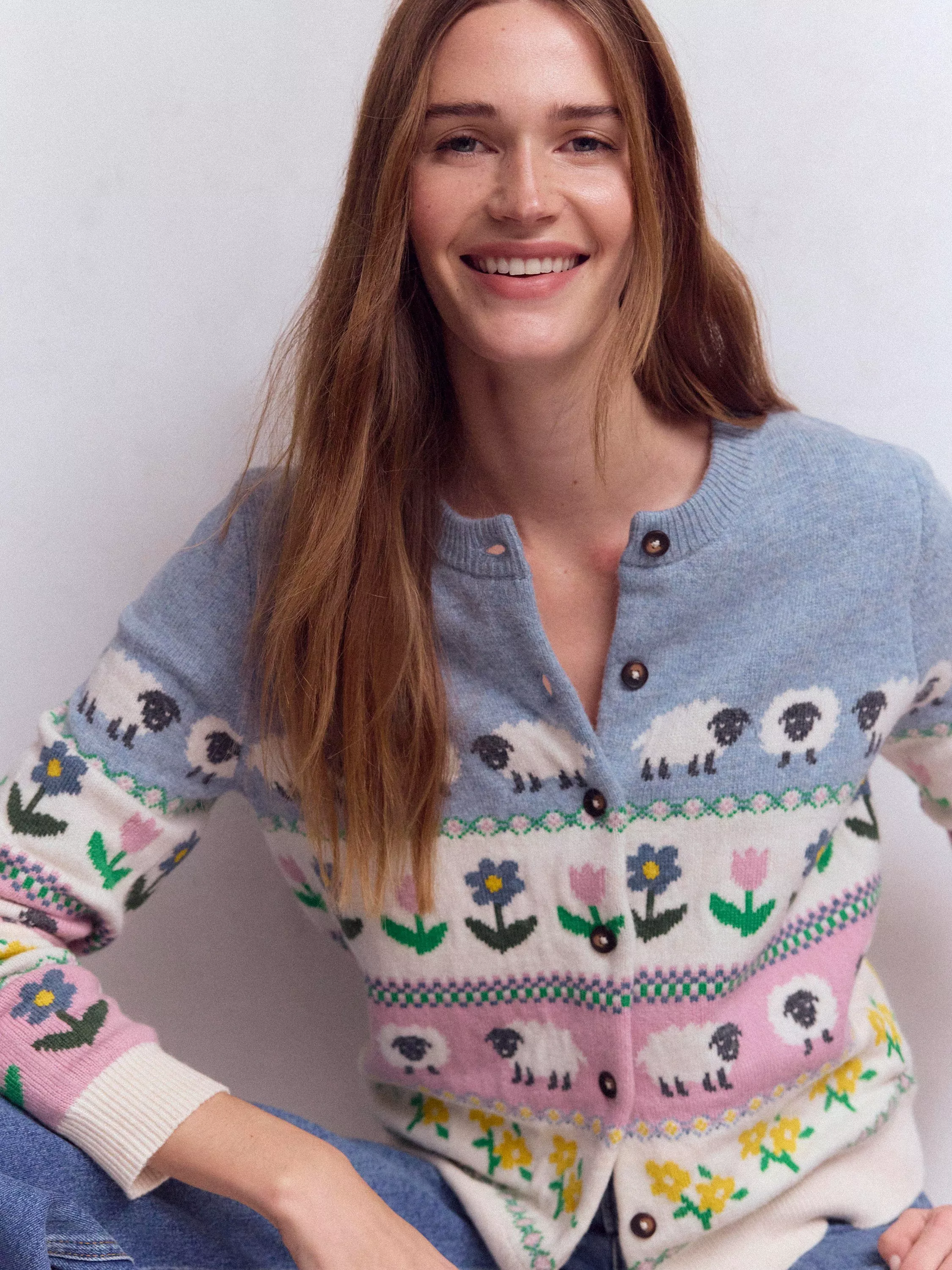 This cardigan is spun from a soft blend of wool and cotton and features a playful take on classic Fair Isle. The unique patterns are inspired by vintage knits in soft shades.