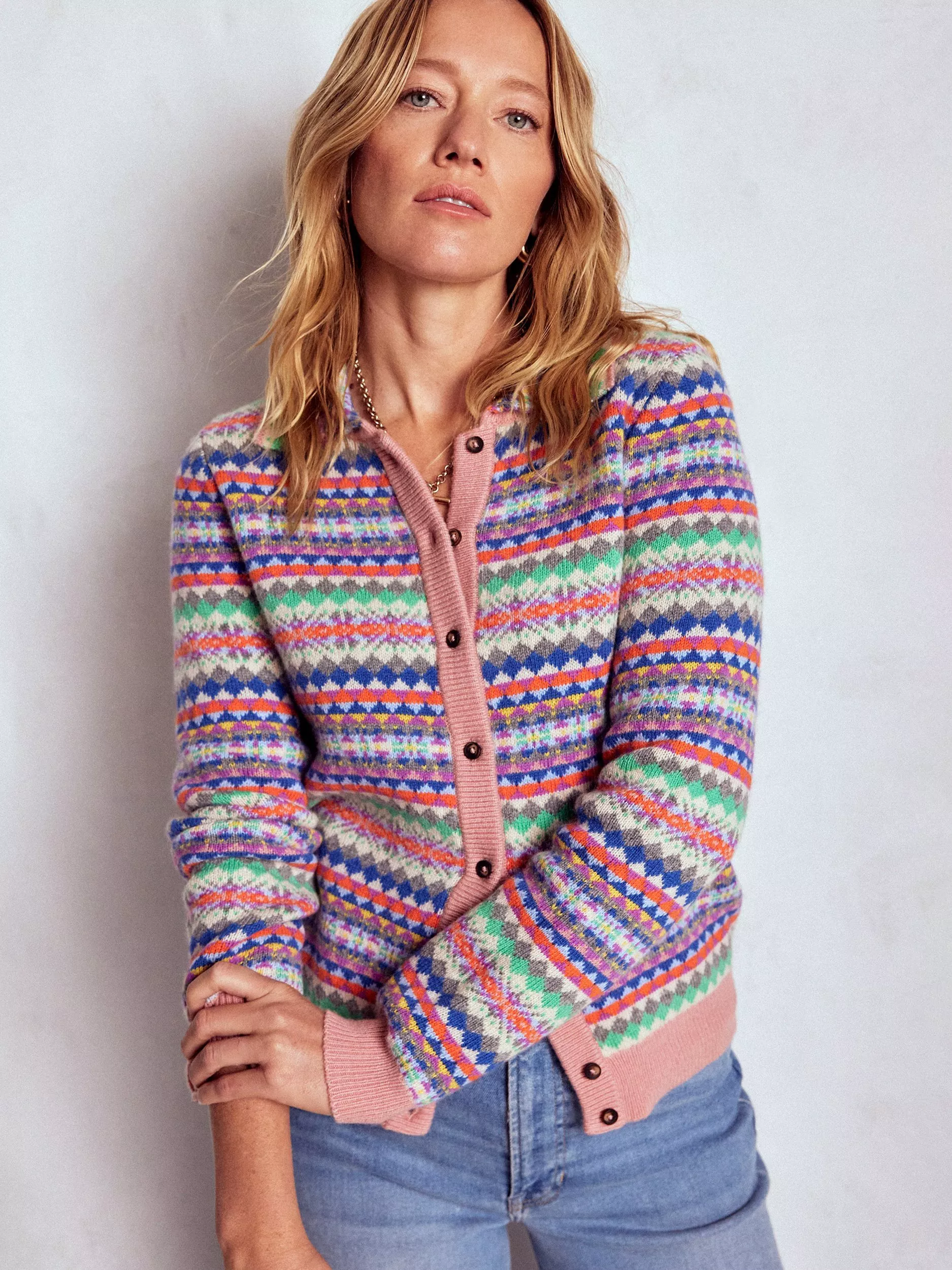 Who is the fairest of them all? This joyful knitted jacket. The latest addition to the Edie Fair Isle family is bursting with glorious colour. It'll lift your spirits on the coldest winter days and instantly brighten denim or cord ensembles.