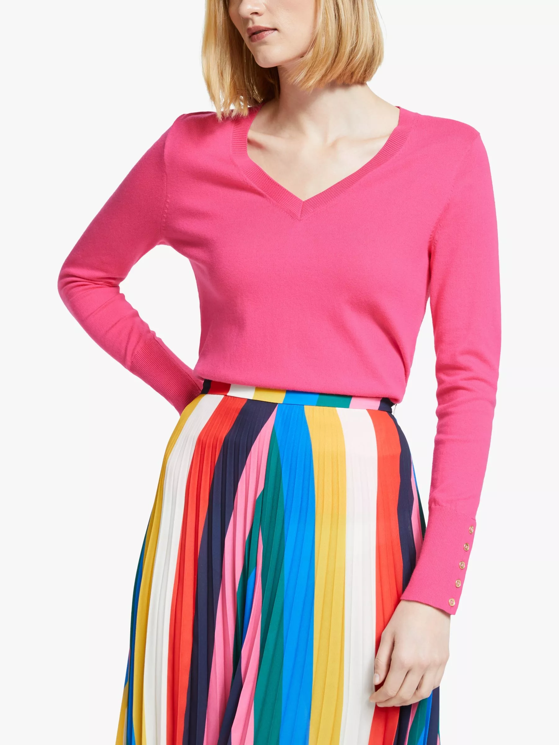 This versatile v-neck jumper from Boden is perfect for layering. It's made from a cotton-blend and with an easy-to-wear, semi-fitted shape, it's both office-worthy and weekend-ready. Buttons on the cuffs give an extra finishing detail.