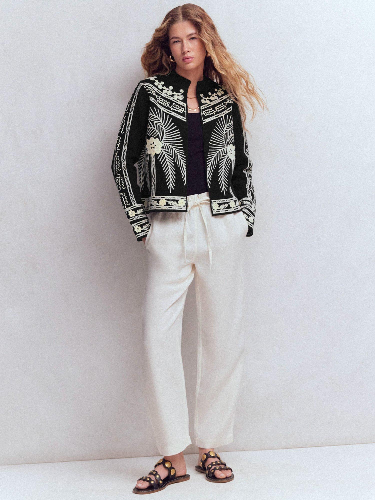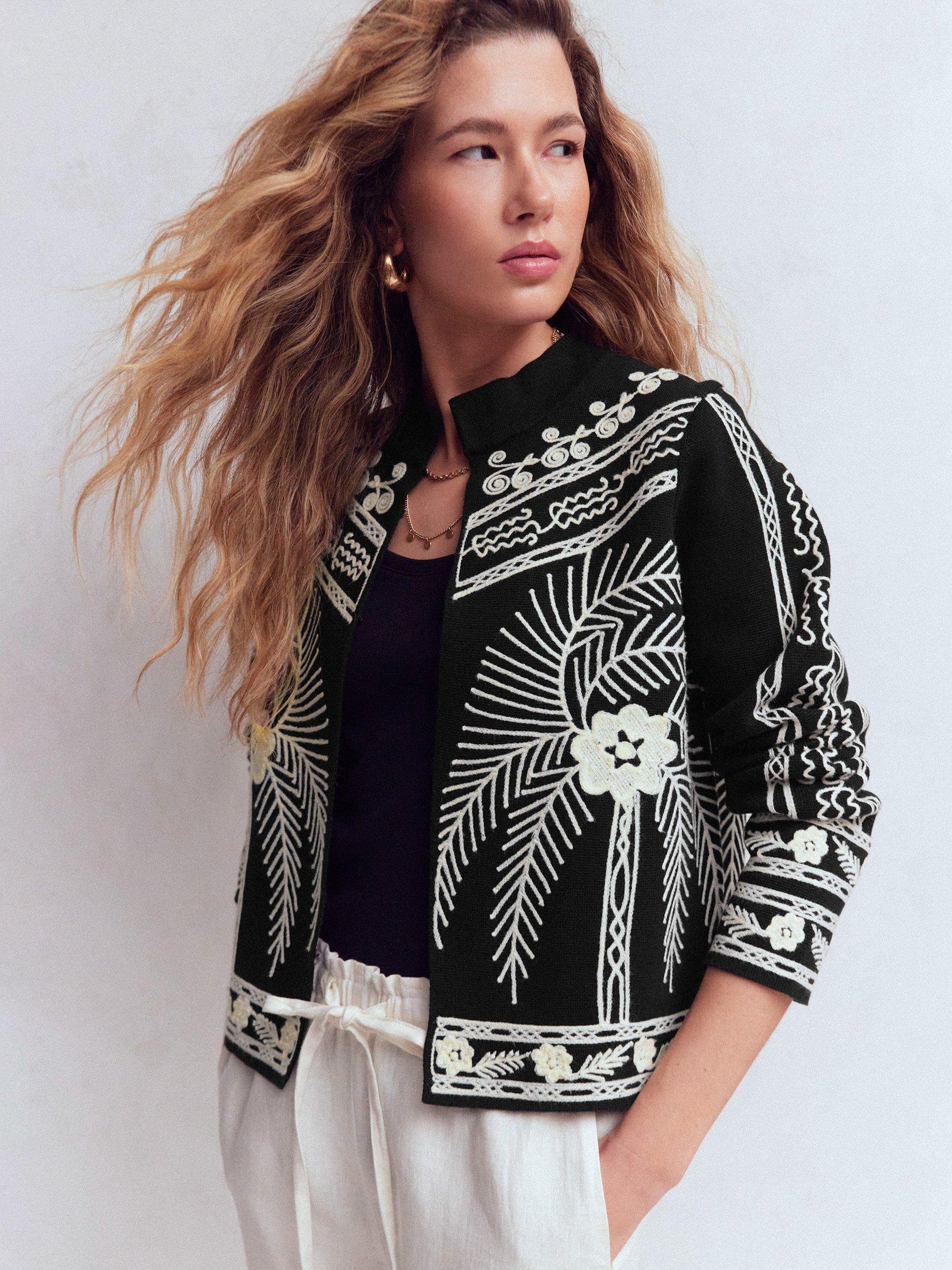 There is something uniquely elegant about a jacket with a stand collar. This tailored cotton style with Milano stitching and an open front is the perfect finishing touch to special occasion looks.