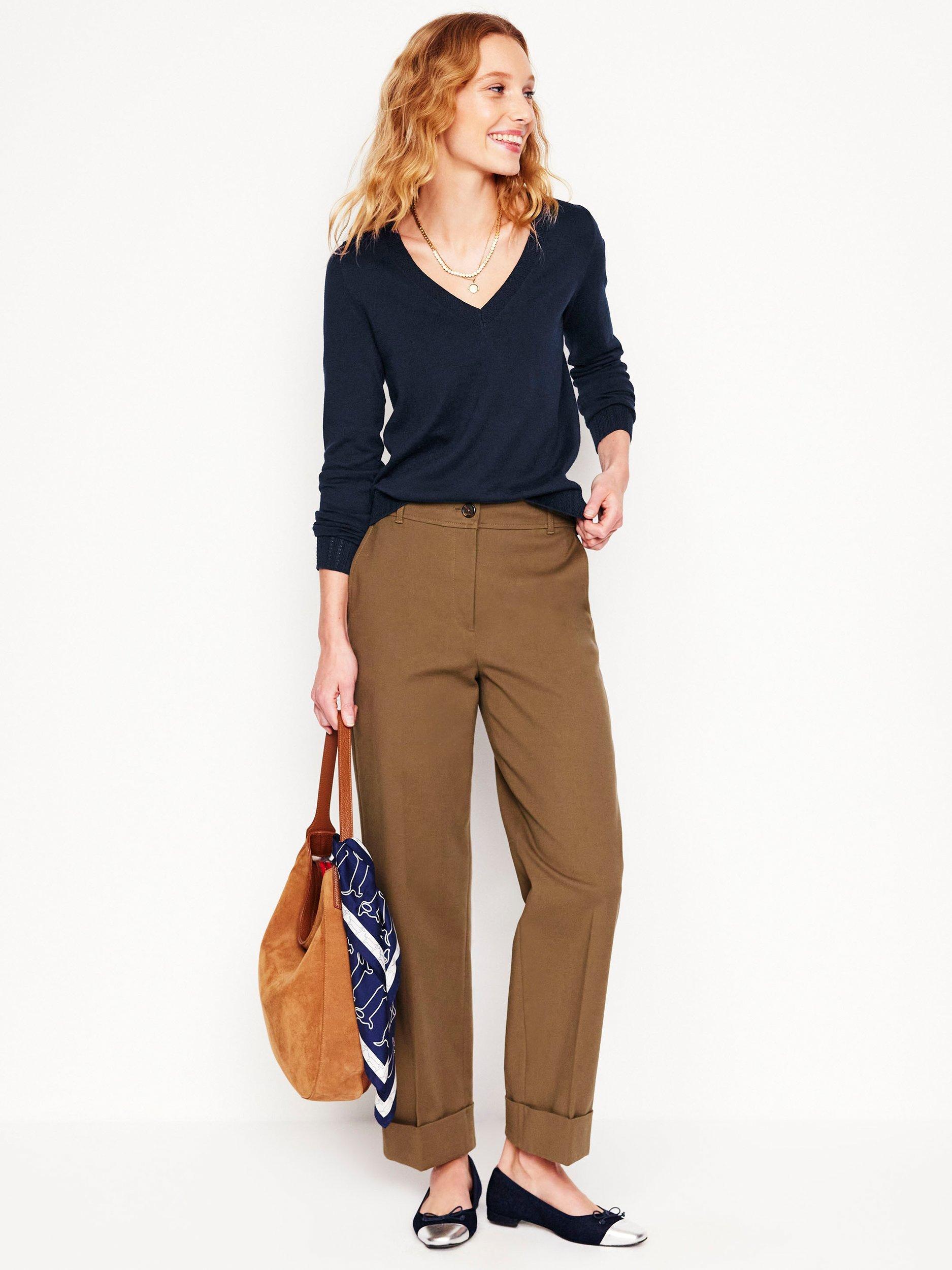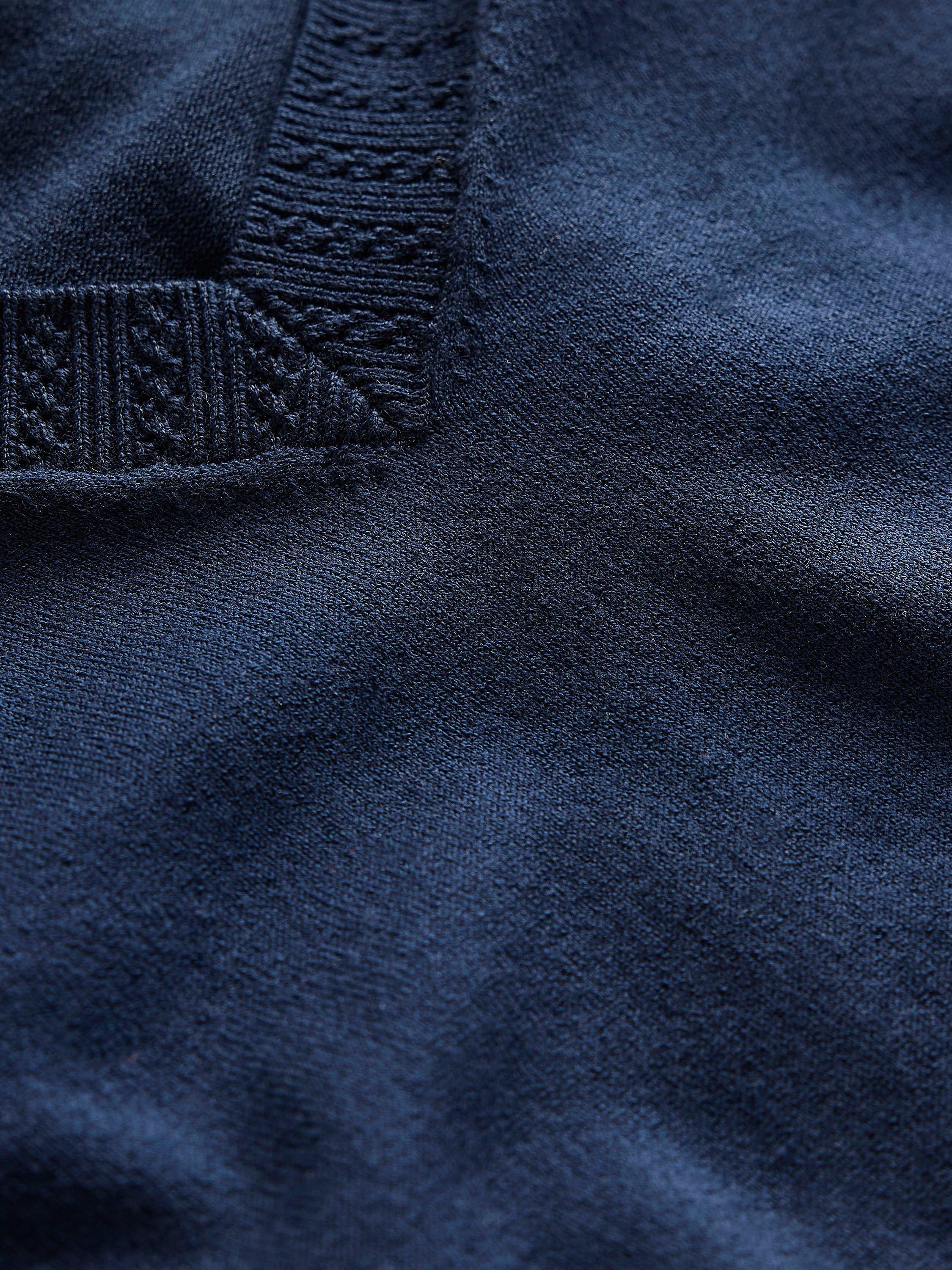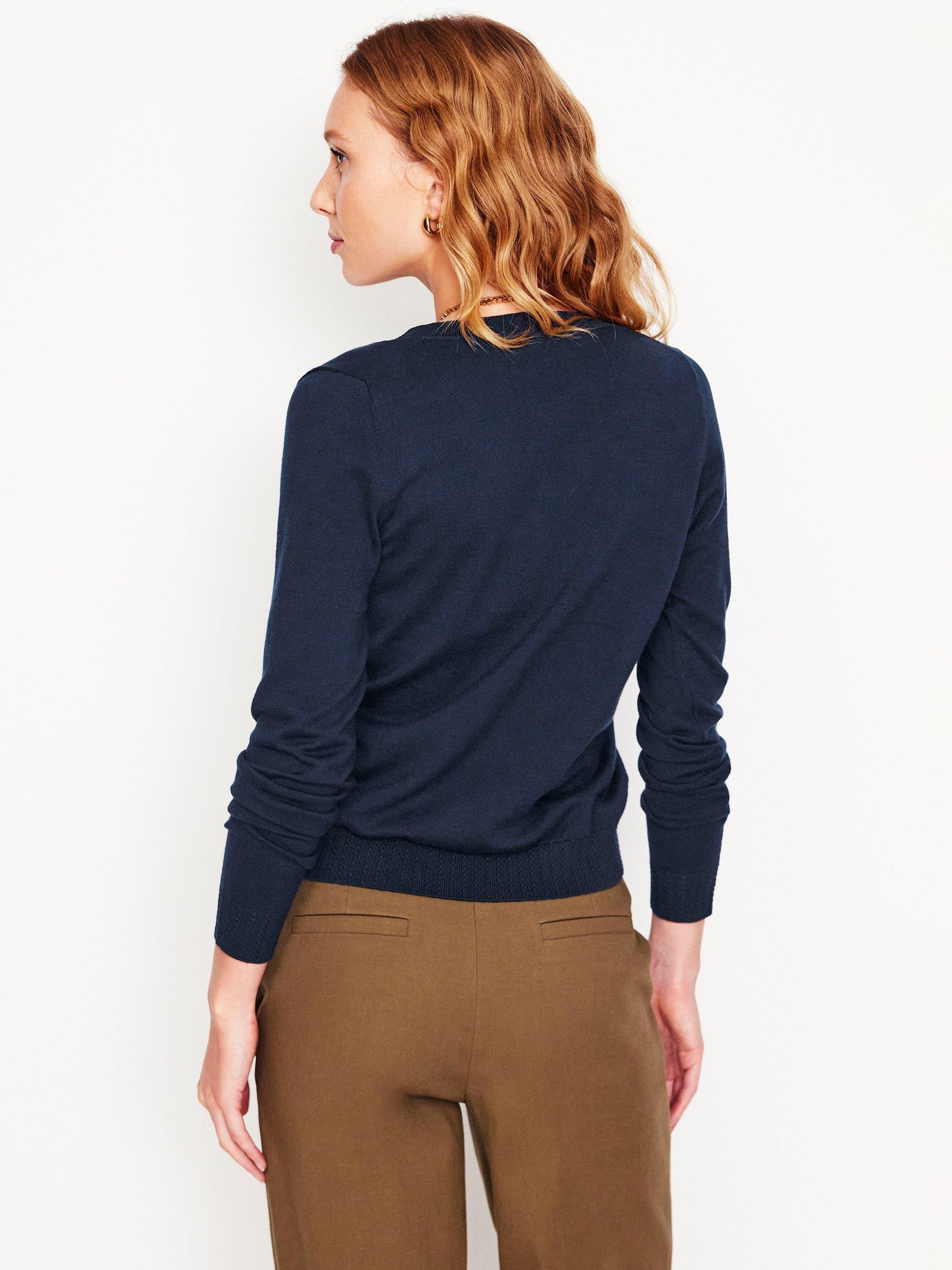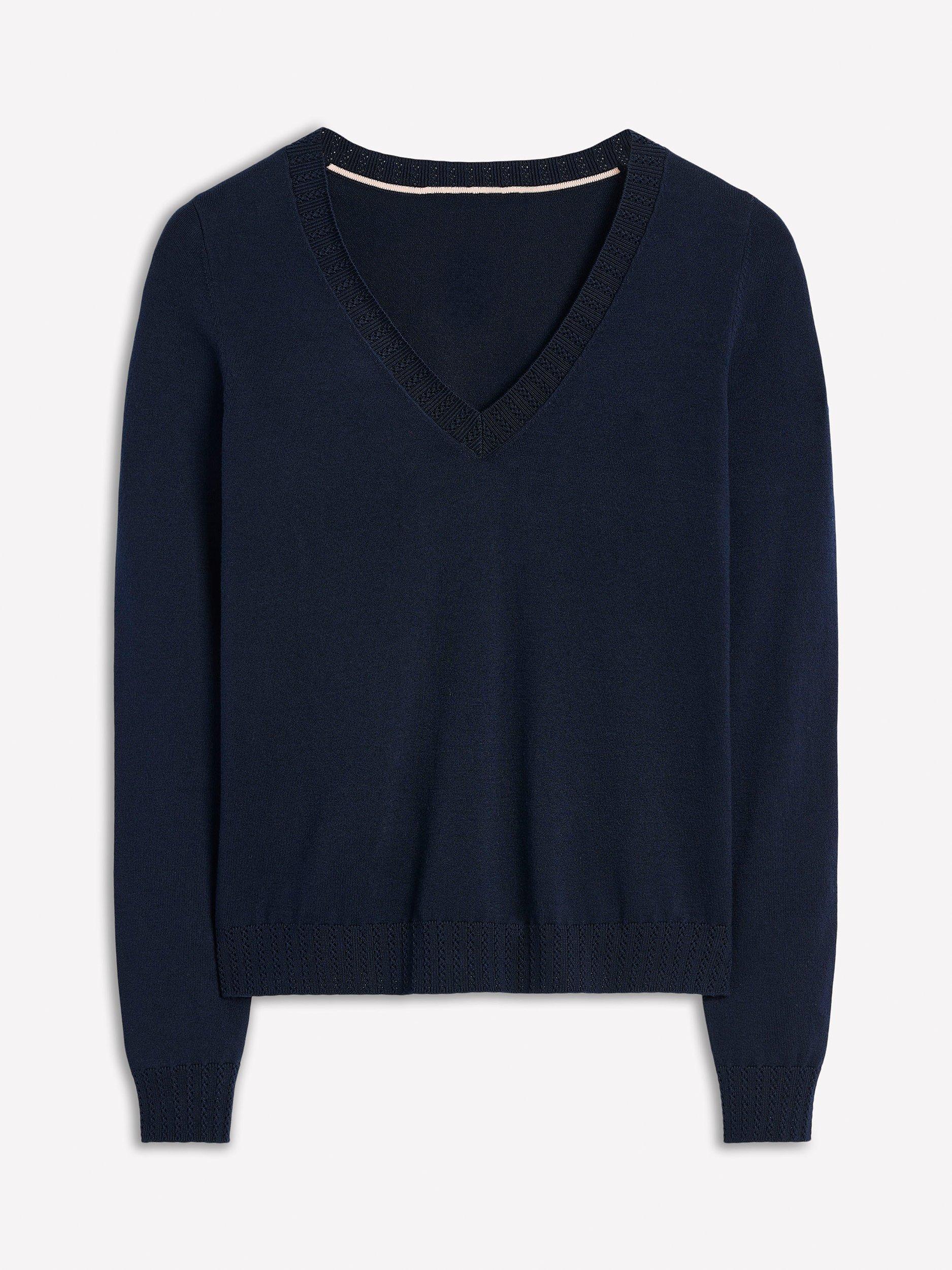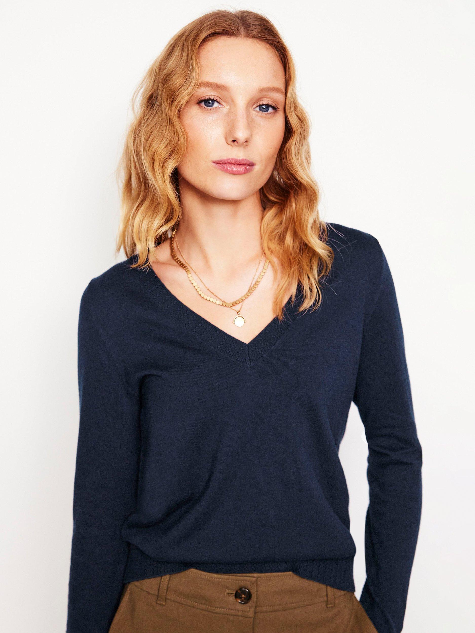 Introducing the Emilia V-neck jumper, complete with intricate knit detailing at the cuffs and neckline.