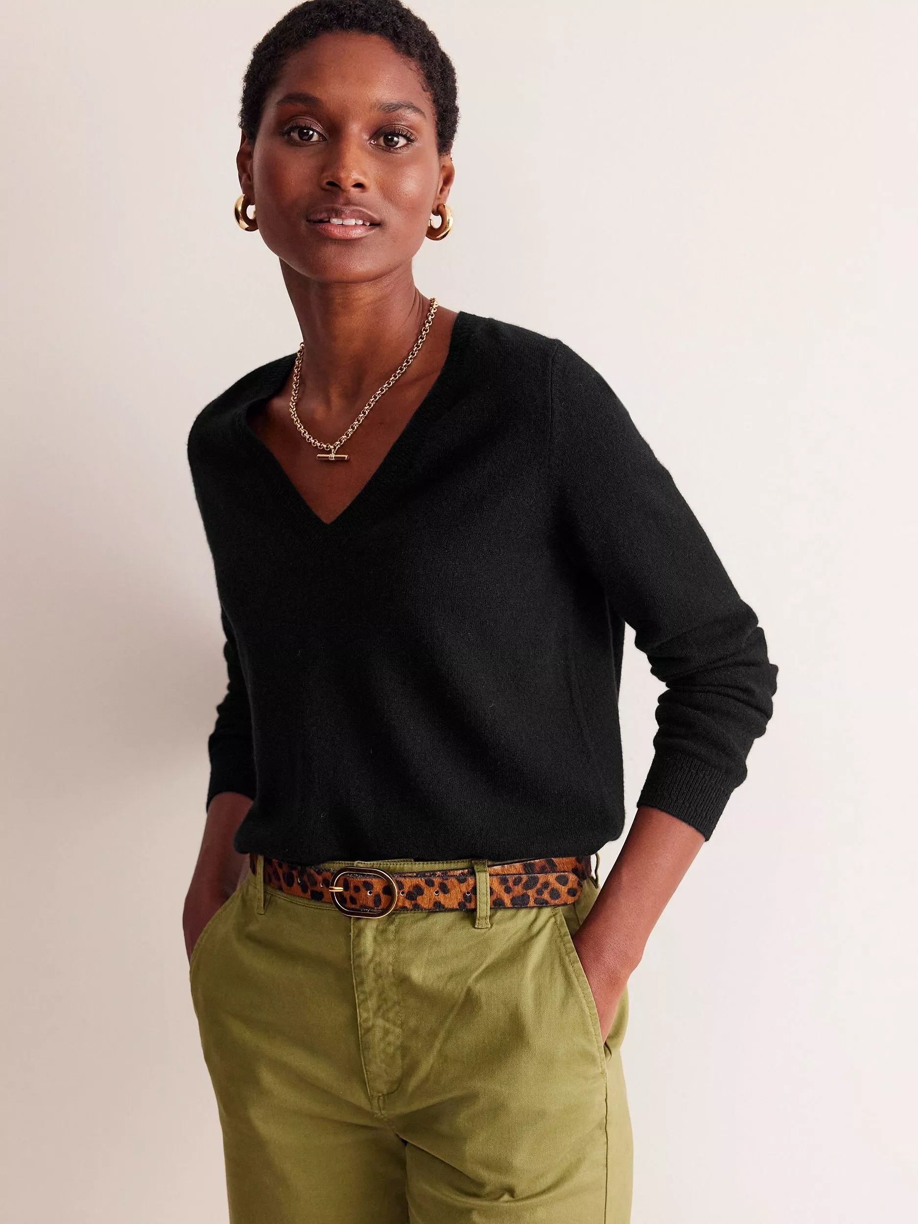 The relaxed-fitting Eva cashmere jumper has a V-neck for easy layering and a soft, cosy handle. It'ss the kind of heritage style you'll still be wearing in years to come.