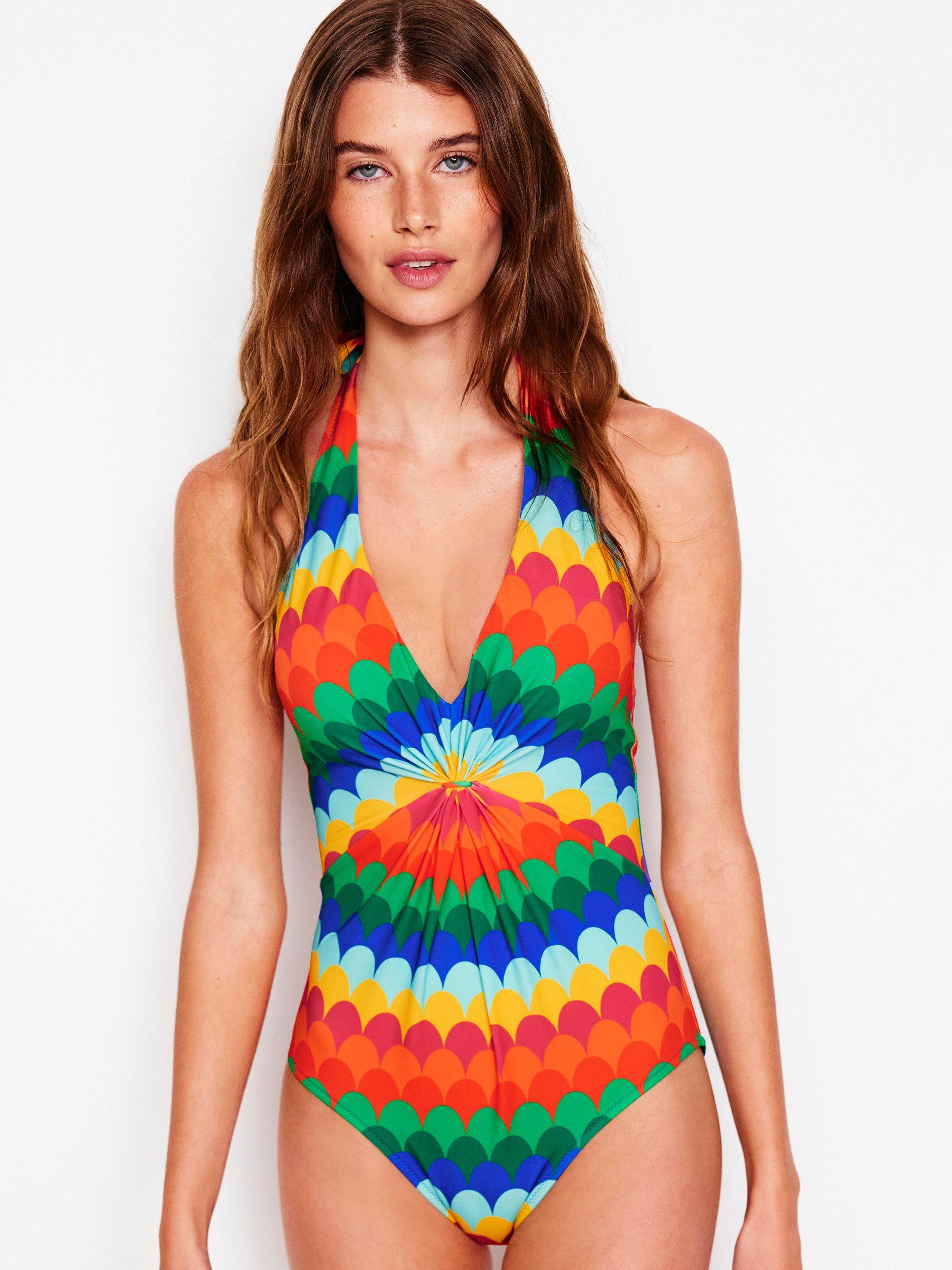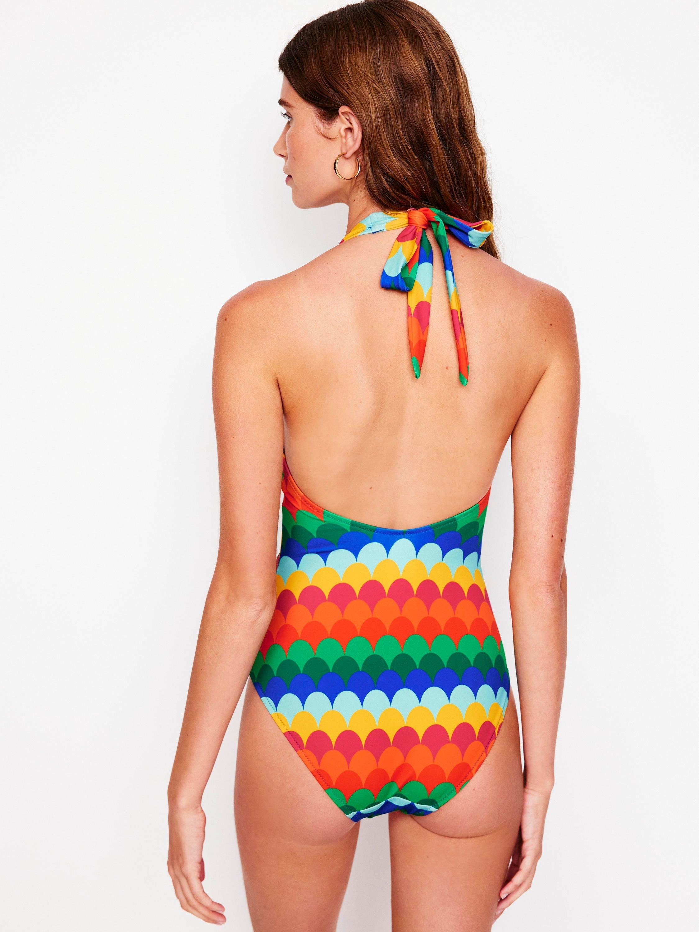 A colourful swimsuit from Boden. The halter-neck, ruching detail and flattering vertical stripes make this vintage-inspired swimsuit a real keeper for this season and many more to come.