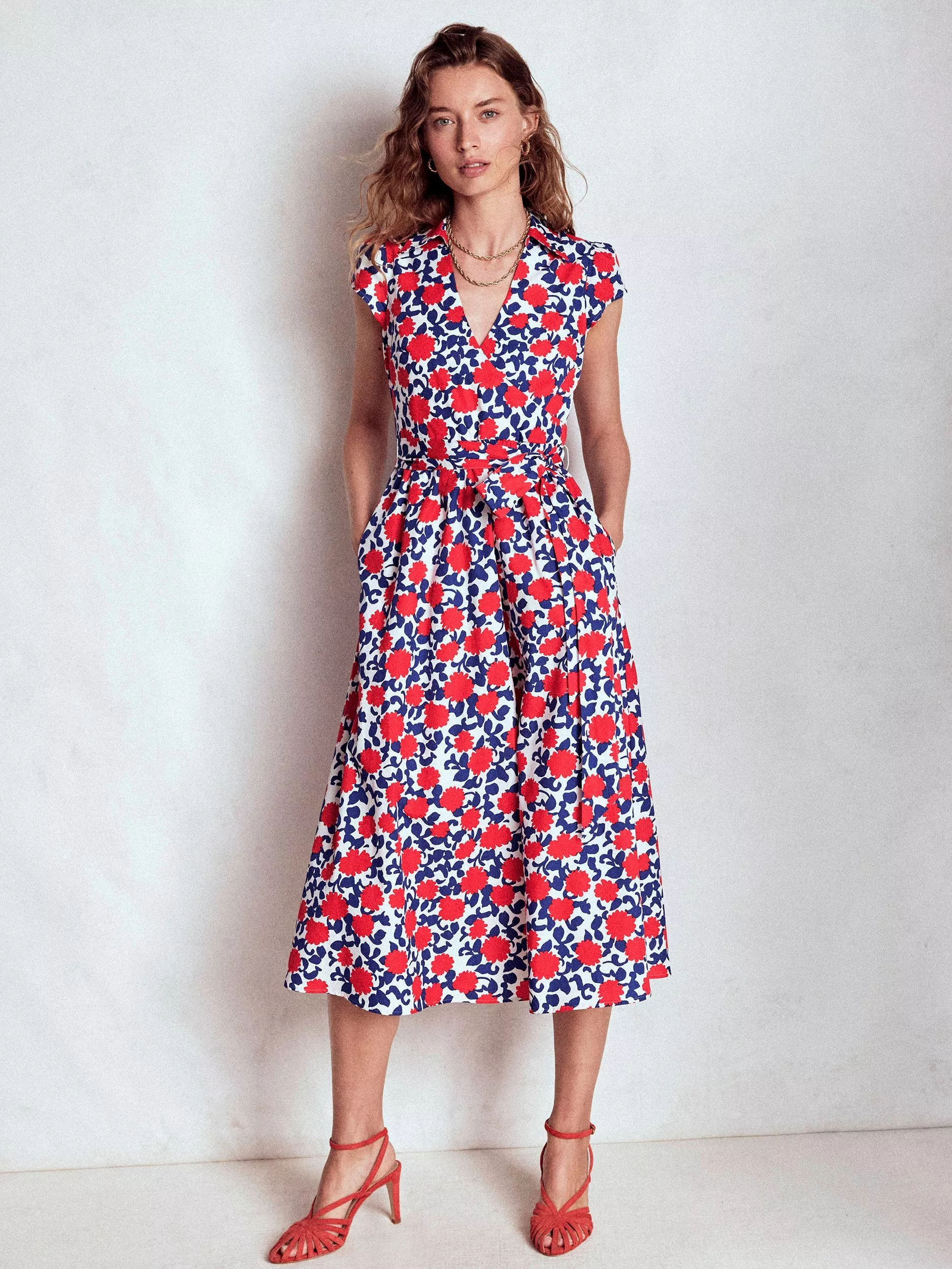 That's a wrap. This cap sleeved cotton midi dress by Boden is framed with a collar neckline and comes in a flourishing, floral print.