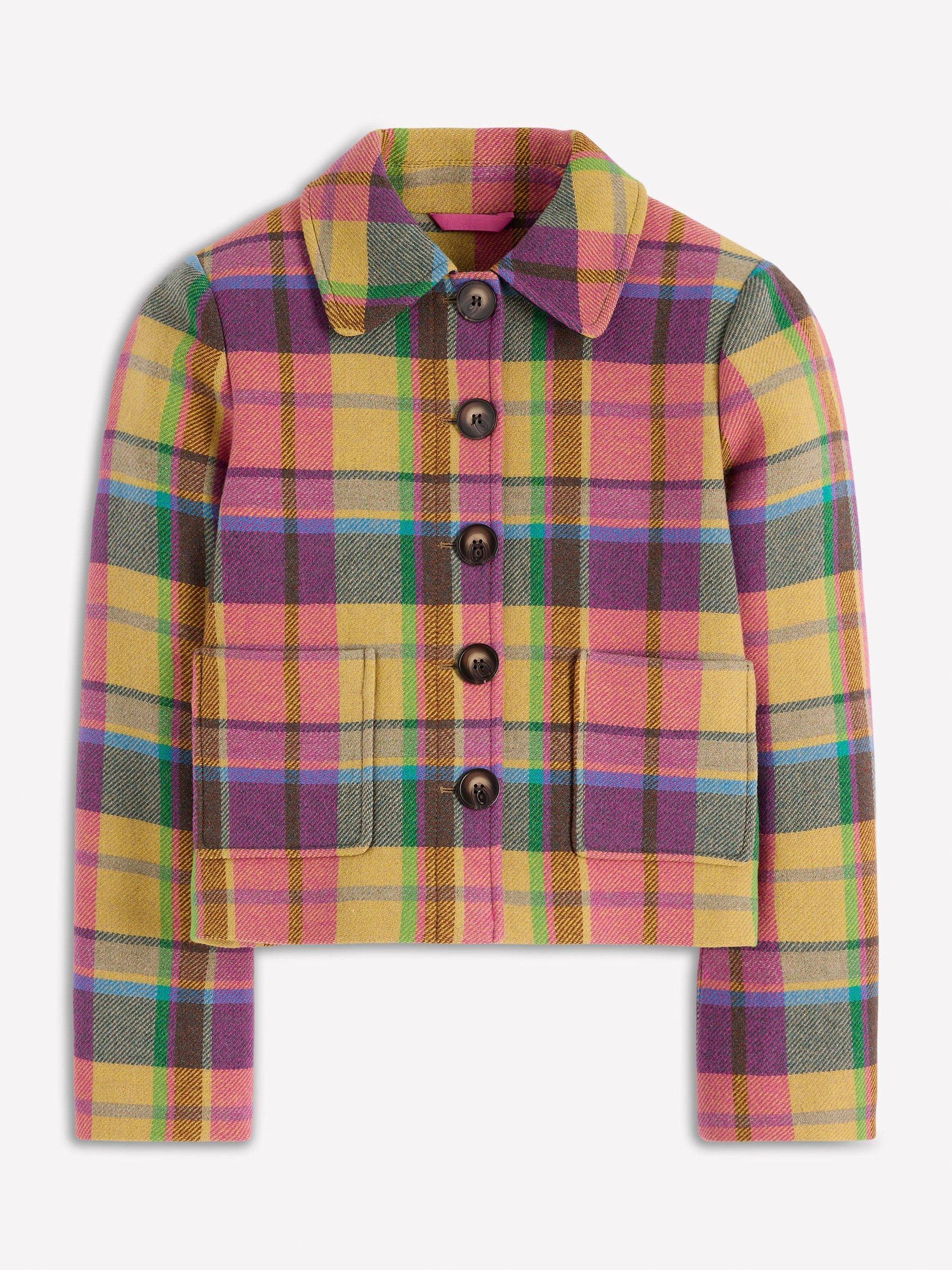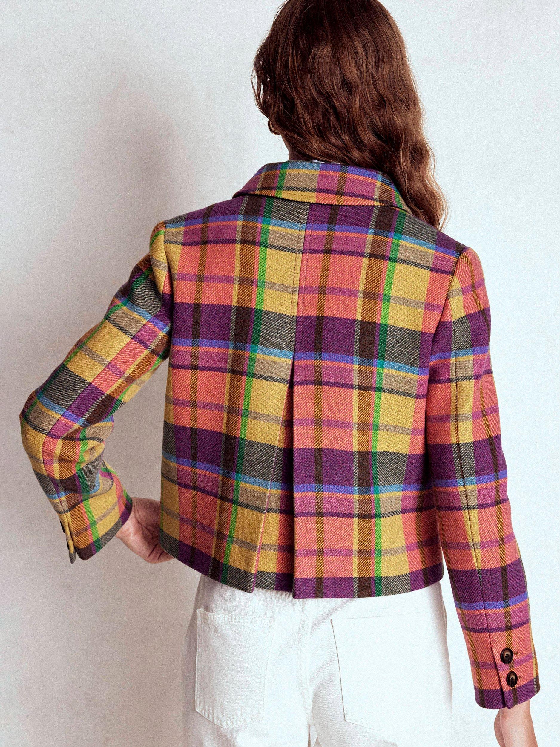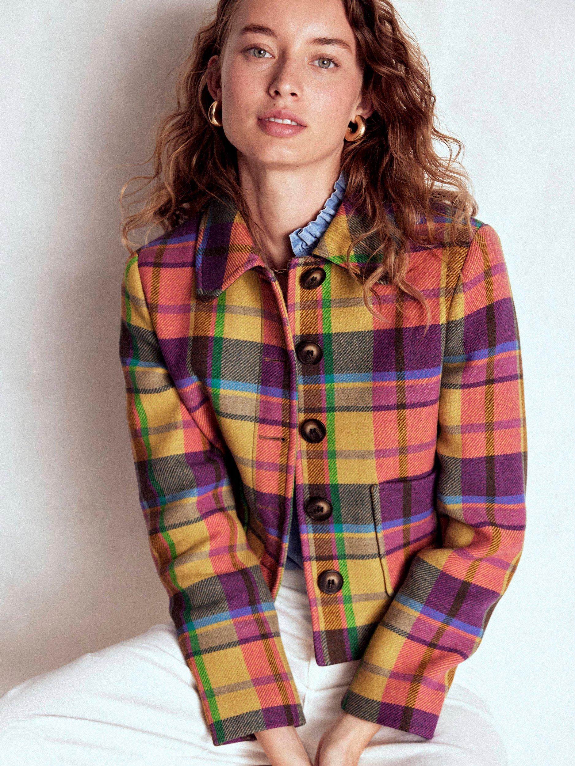 A smart wool-rich jacket with retro accents. The Knightsbridge style is cut in a versatile boxy shape, with front pockets and back box pleat (for ease of movement). A new season win.