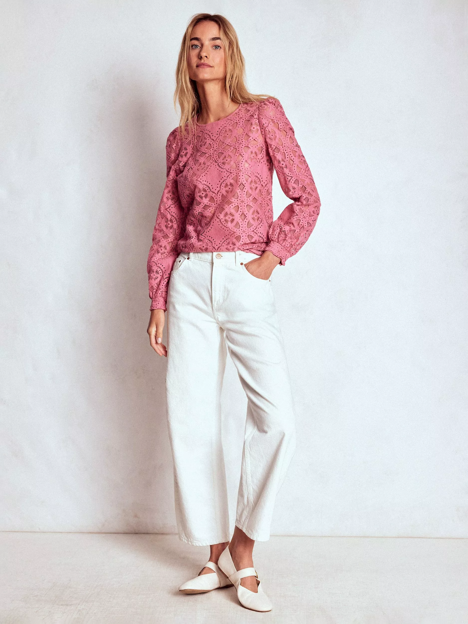 An easy-to-wear, yet elevated crew neck style with ever-so-slightly puffed sleeves and smock-backed cuffs. The sheer lace design makes it the perfect nice top to go with jeans. This will get you noticed in all the best ways.