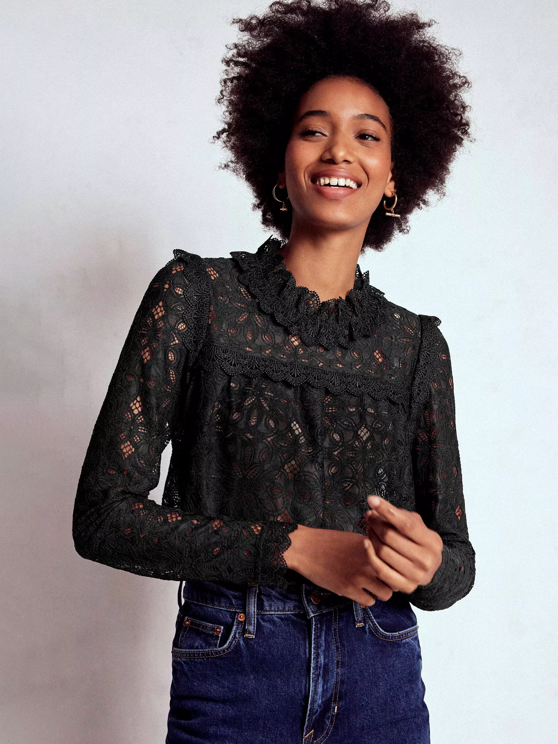 Boasting a lace trim, this blouse from Boden lengthens the profile with its high neckline and long sleeves.