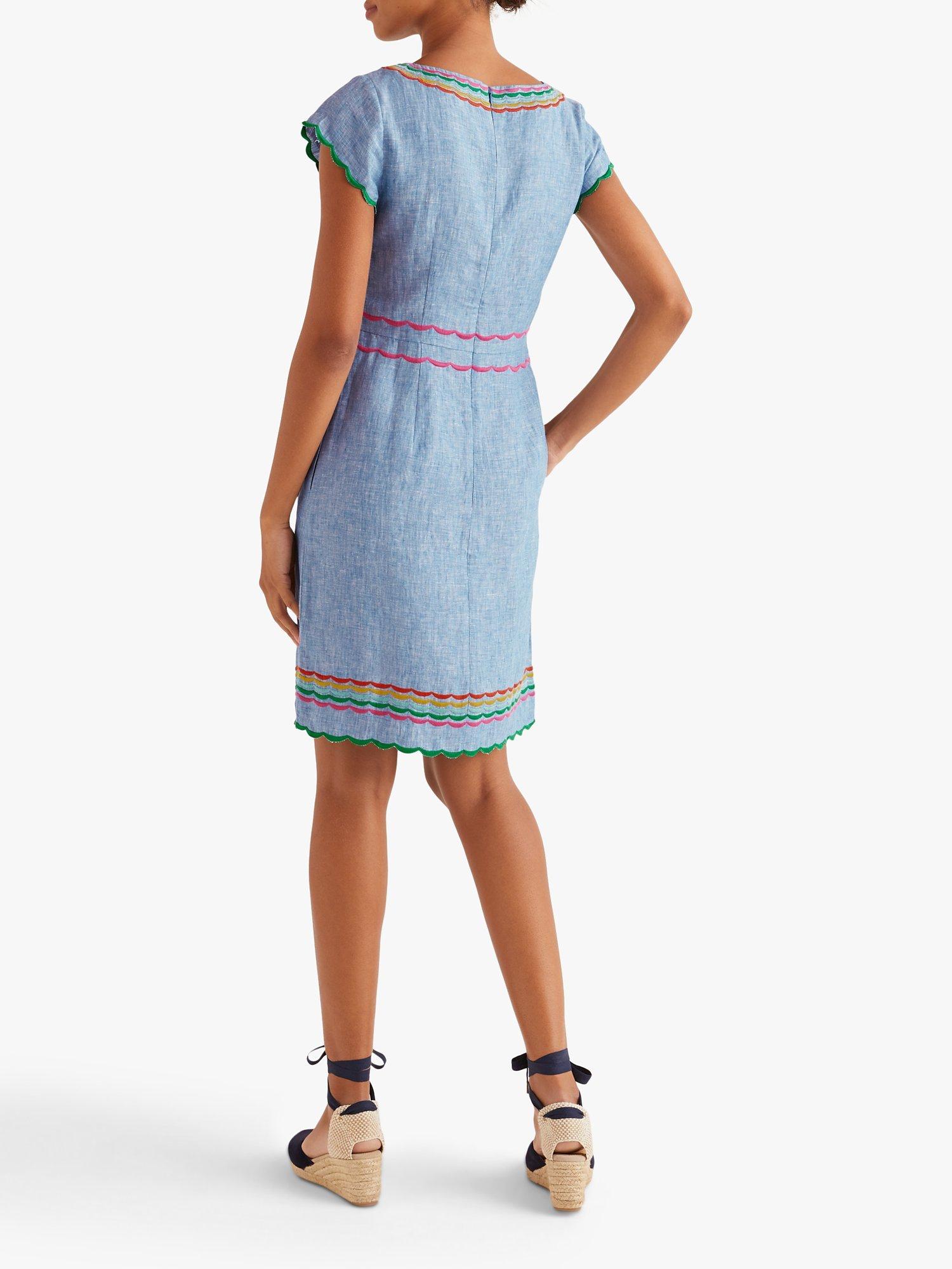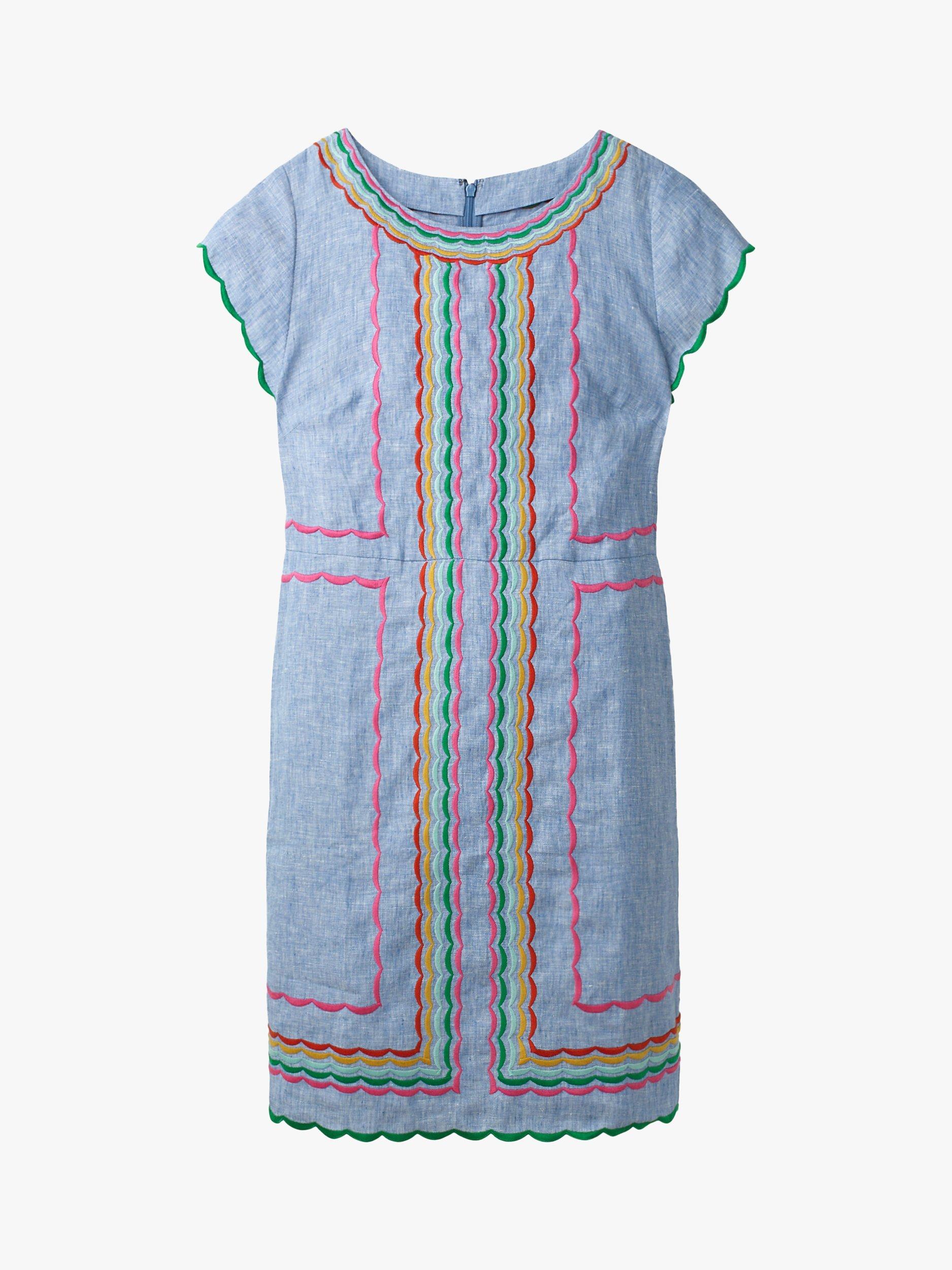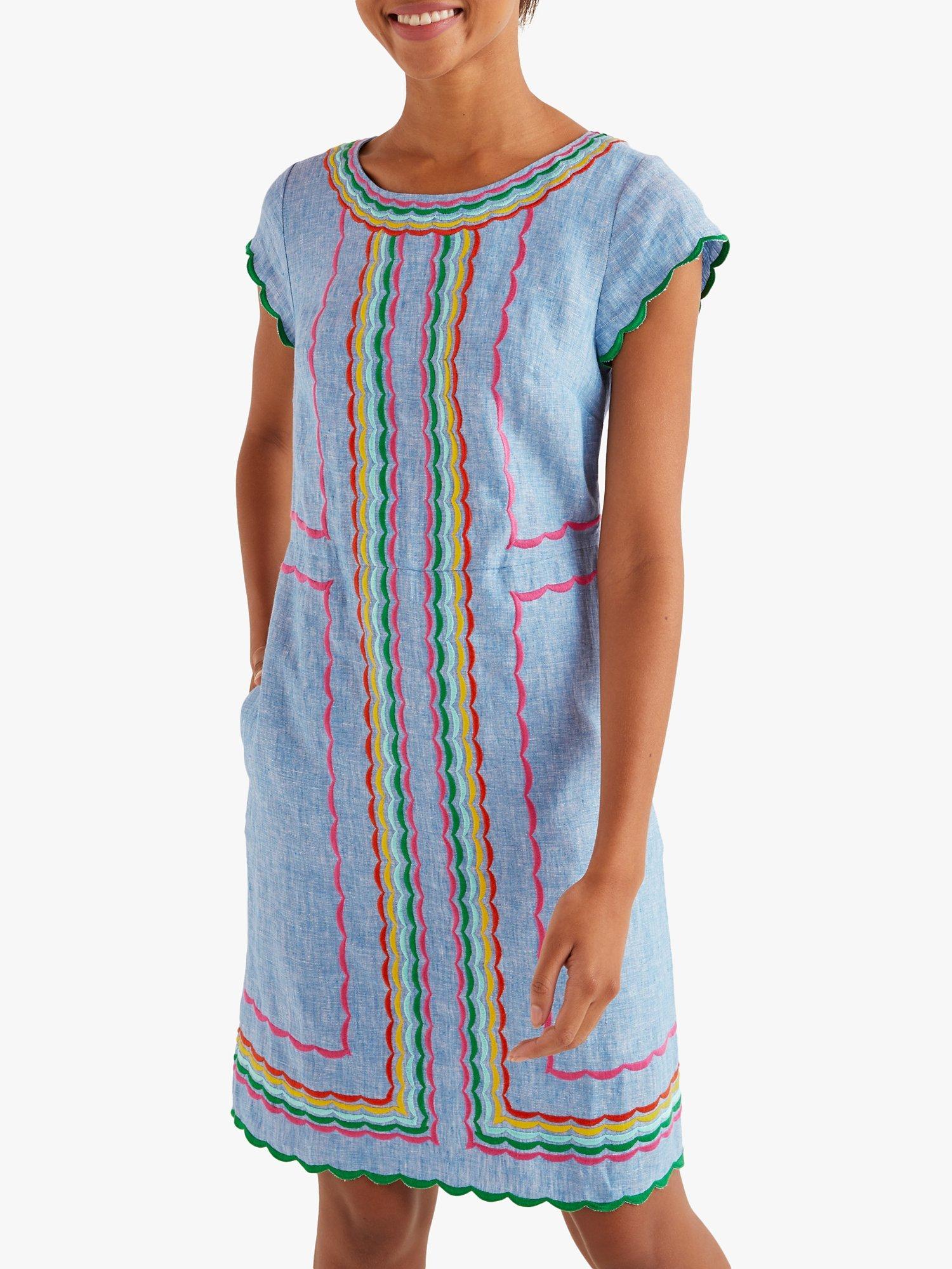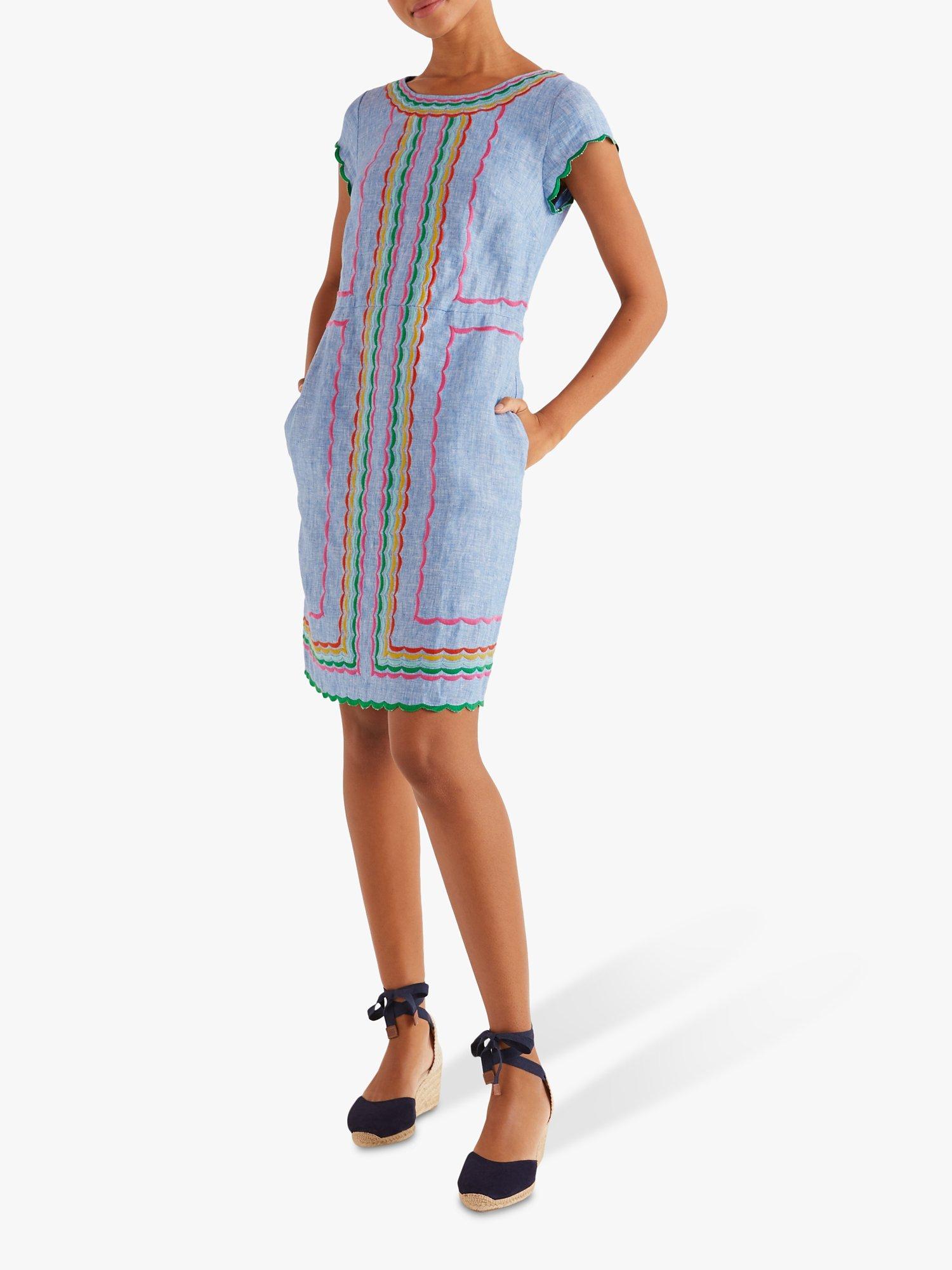 Stand out with Boden's Laura dress featuring colourful embroidery for cheerful charm. Made from linen to keep you comfortably cool, its crew neckline and cap sleeves are flattering, and the relaxed, gently shaped cut gives it a casual feel. To keep the finish neat, pockets are hidden in the side seams and the back zip is invisible.
