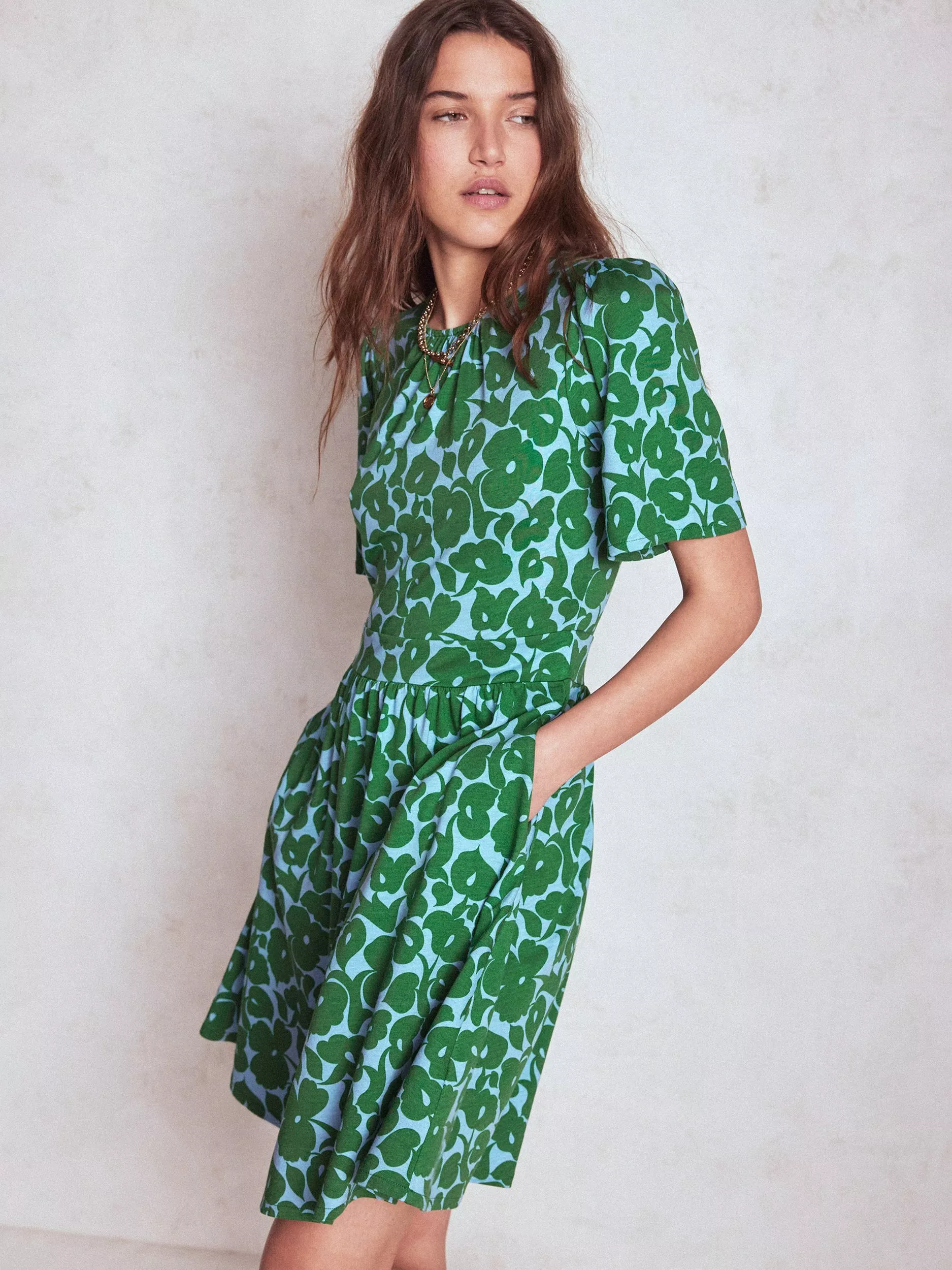 The Louisa dress is crafted from crease-free jersey with gathered angel sleeves, a nipped-in waist and knee-grazing floaty skirt. Swap sandals for boots and it will live on into Autumn too.