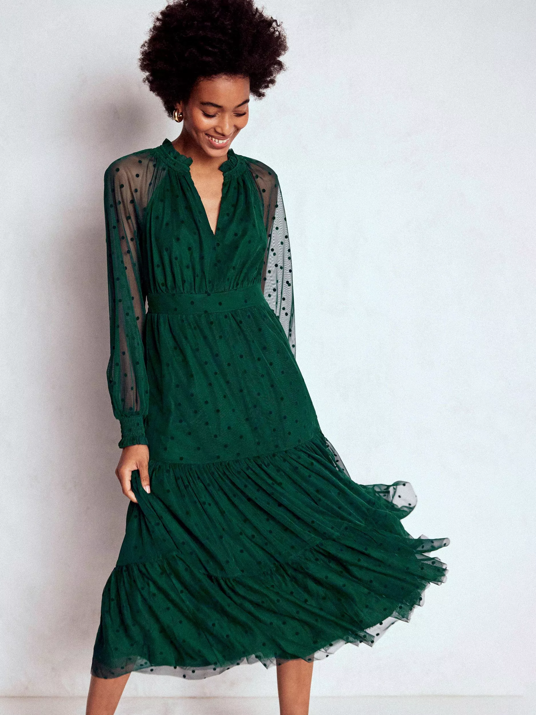 This long sleeve midi dress from Boden is framed with a V-neckline and has a tulle fabric that evokes a vintage feel.