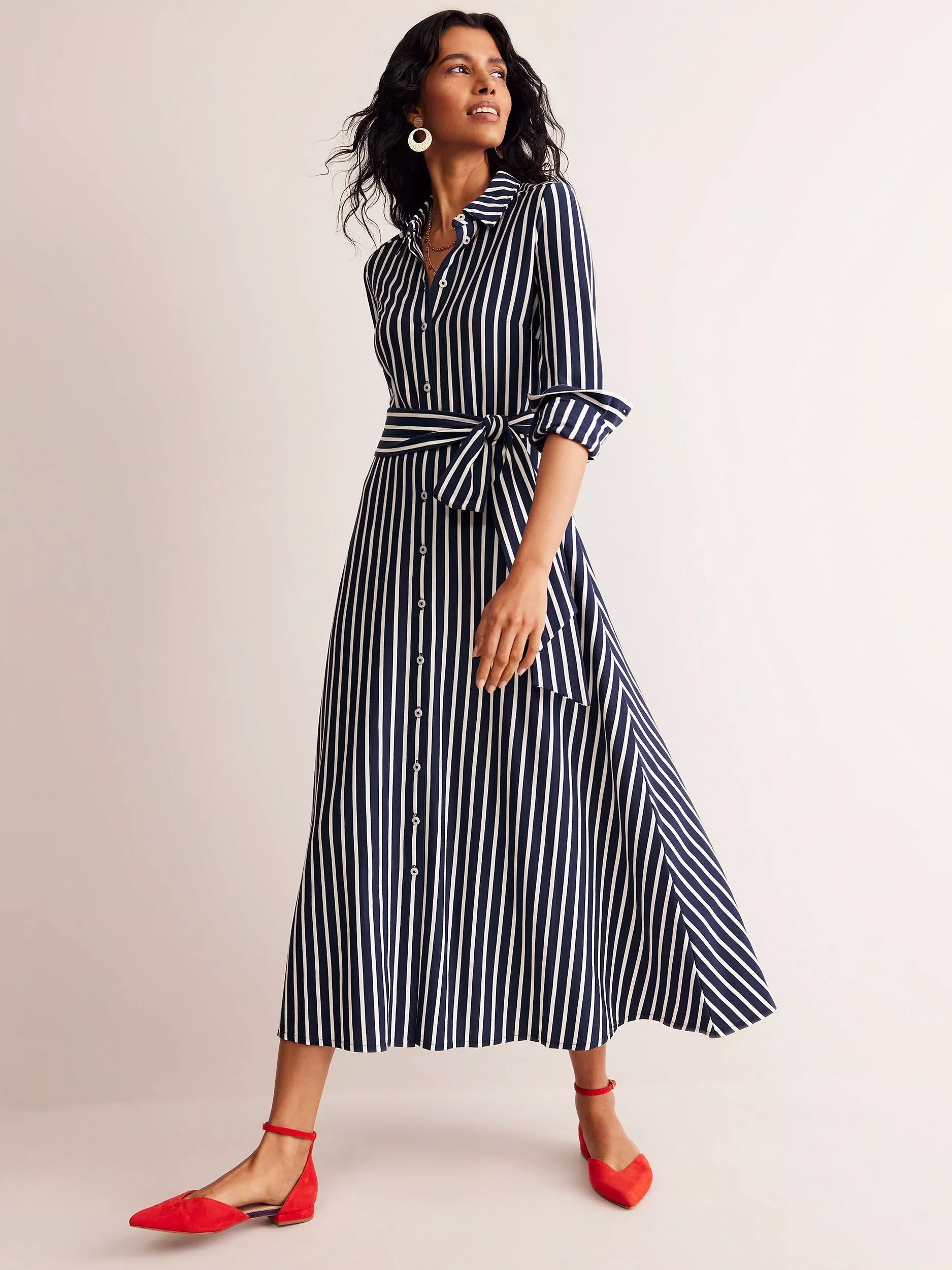 Cut from jersey, the Marcia midi dress is comfortable and flattering, but the classic shirt dress shape and waist-defining belt say you mean business.