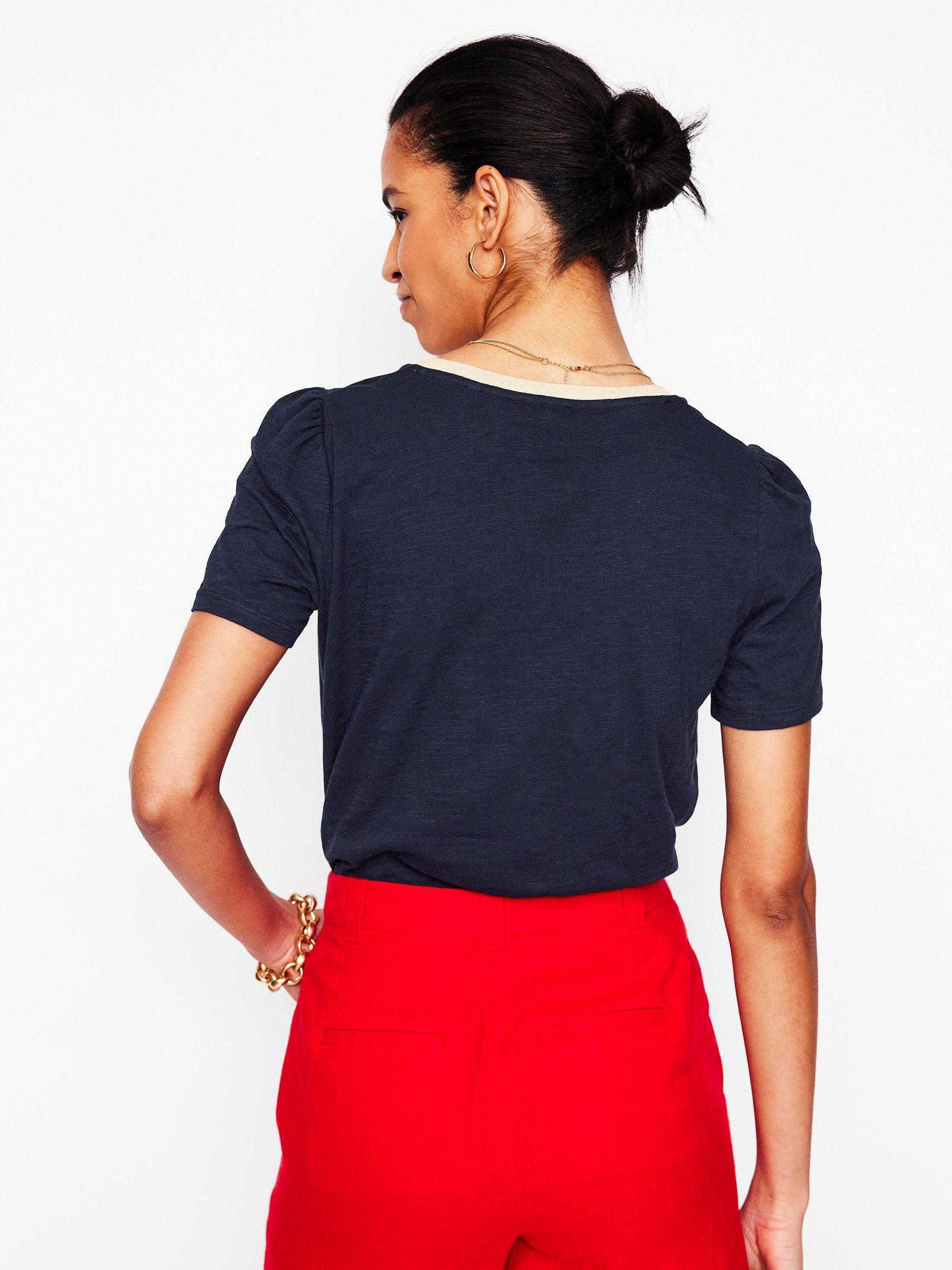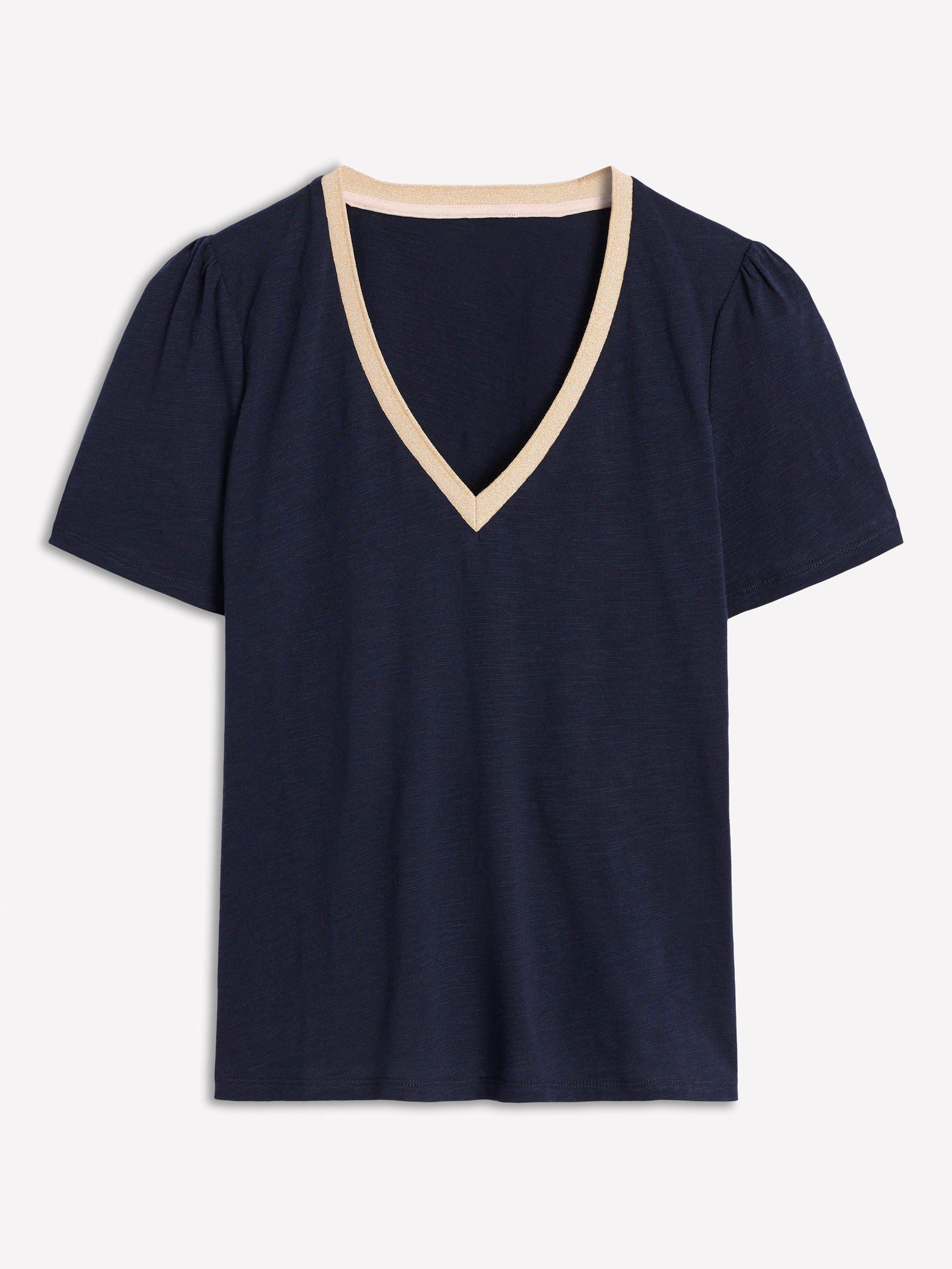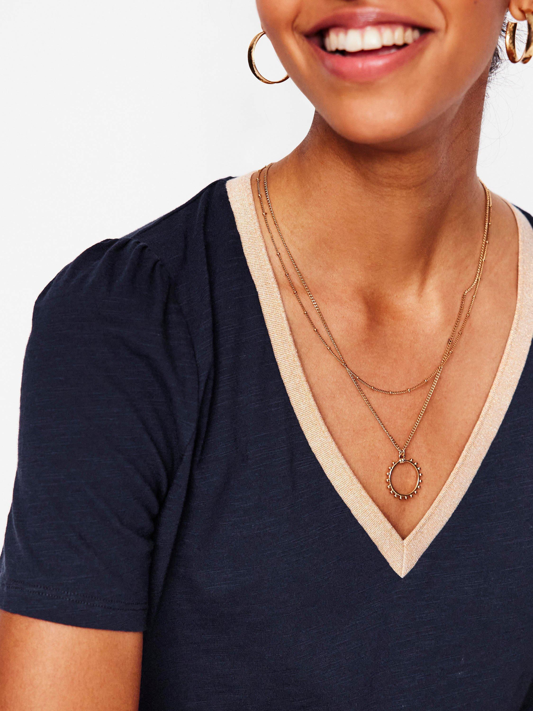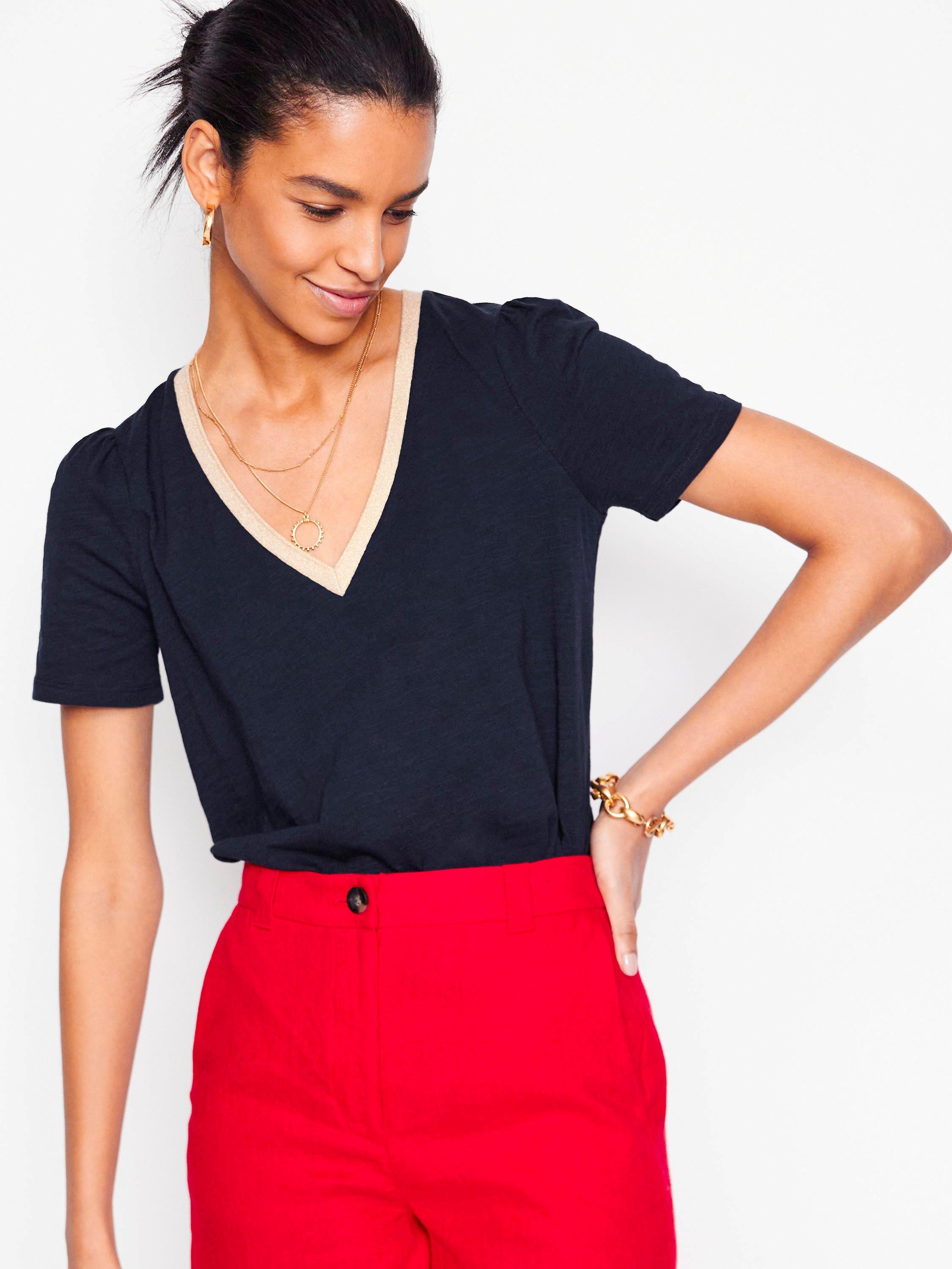 Basics needn't be boring. This simple tee has been jazzed up with a fancy metallic trim around the neckline.