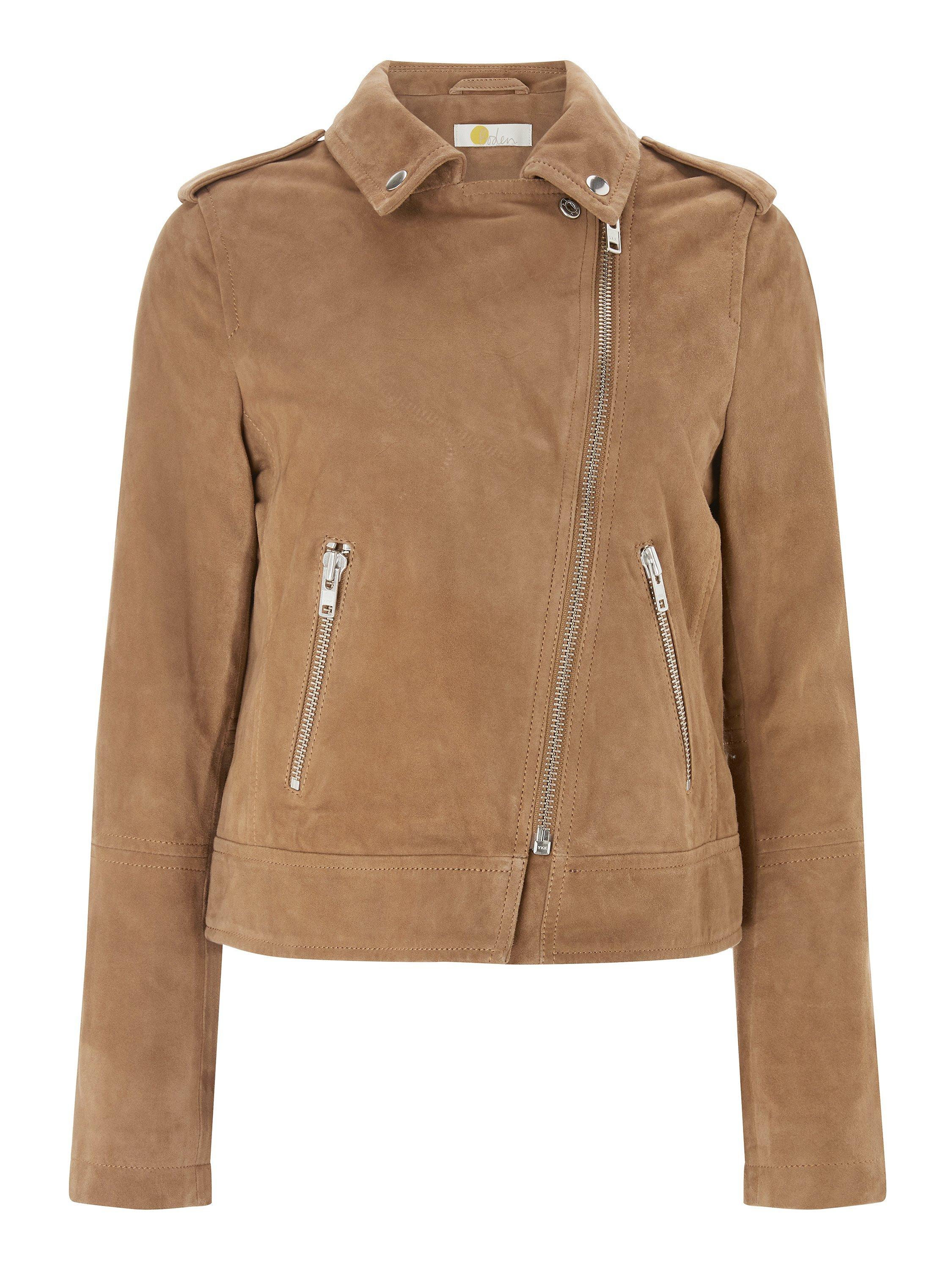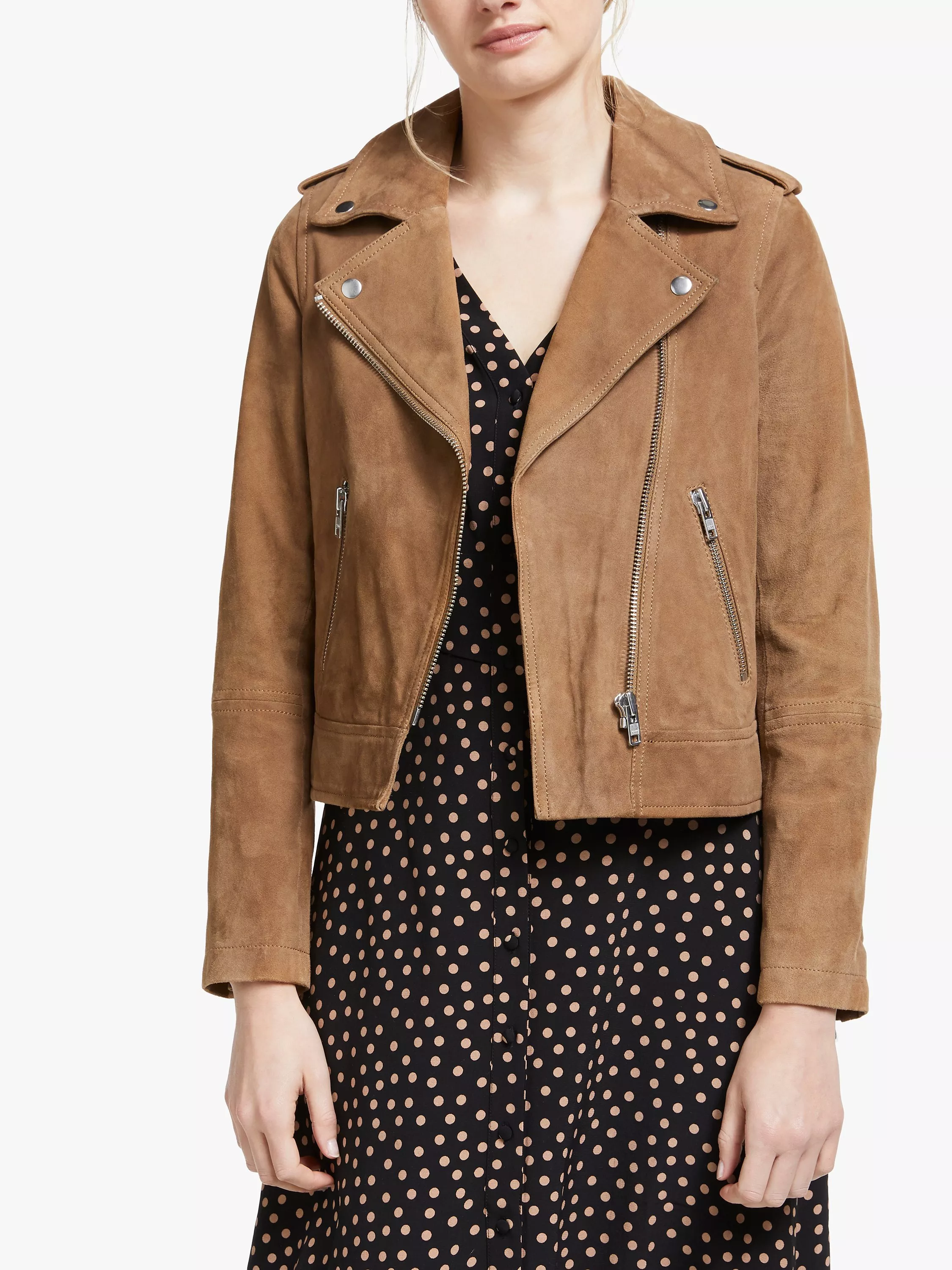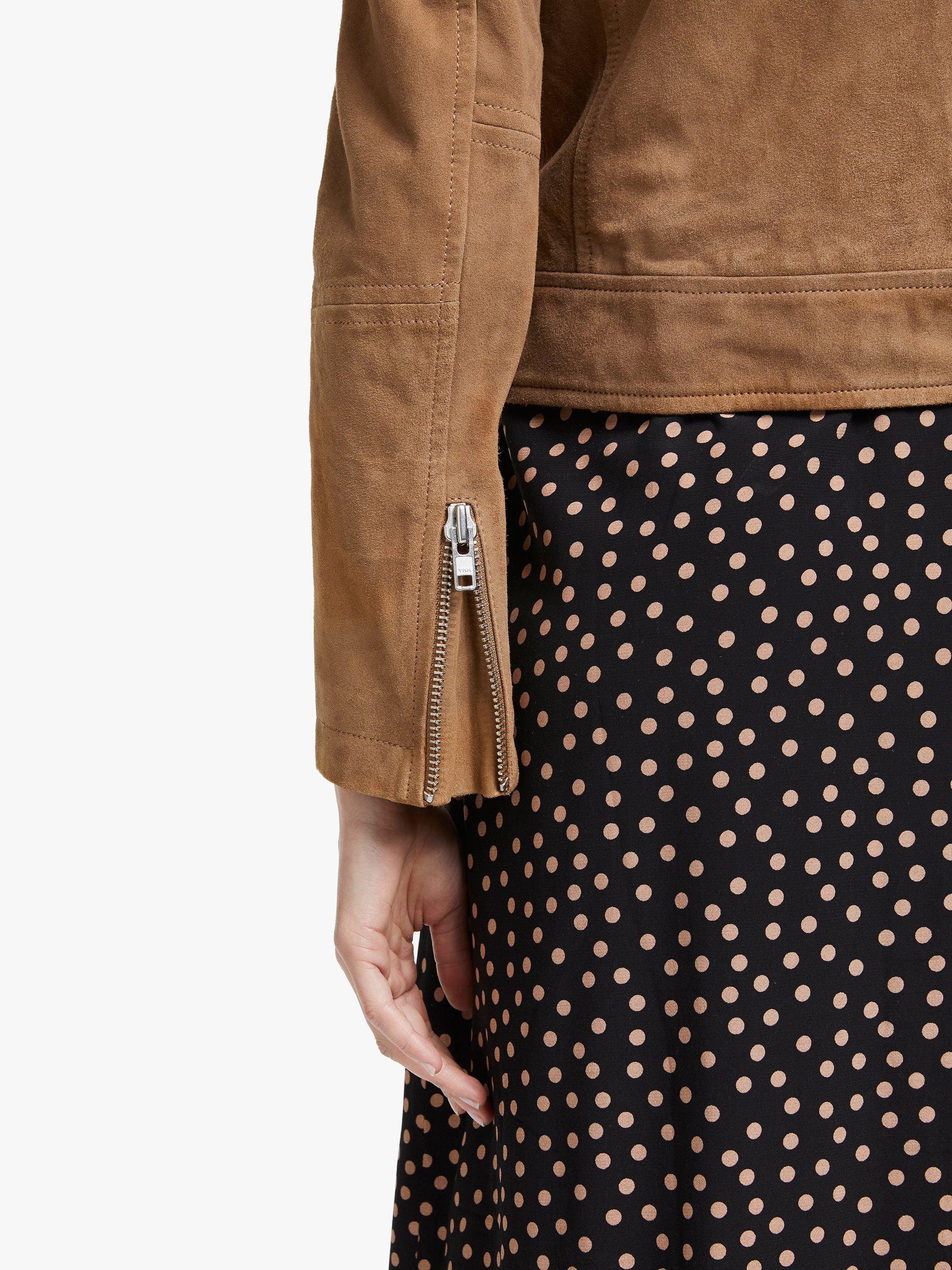 Take one classic style, add an asymmetric zip and heaps of attitude and you've got this take on the leather jacket. This cropped classic is made from the softest suede, which sits perfectly alongside the chunky silver trimmings. Punchy details including: epaulettes, zip pulls and metal press studs that really make a statement. Wear over a floaty dress for a bit of boho chic or with black jeans for a sharp look.
