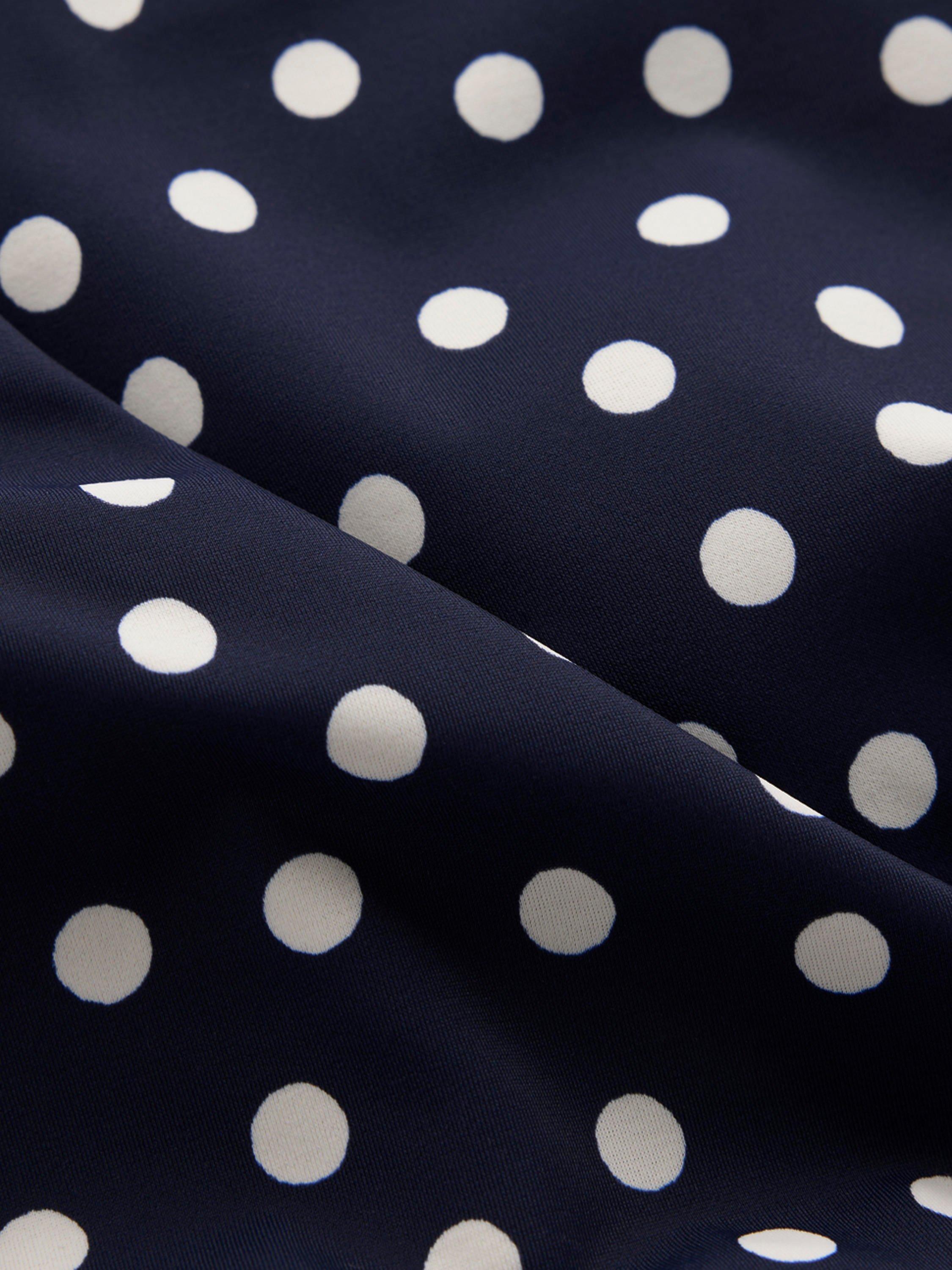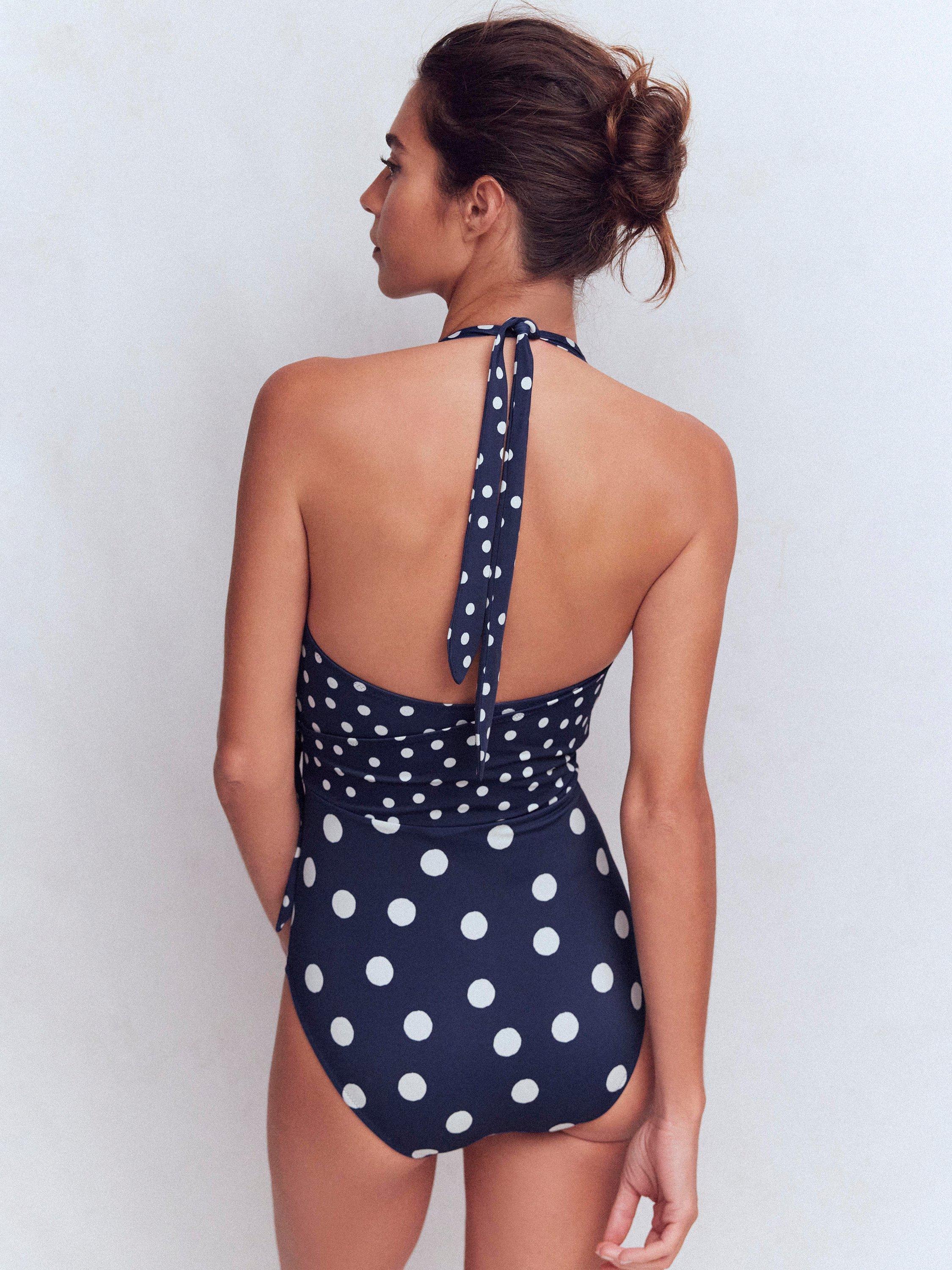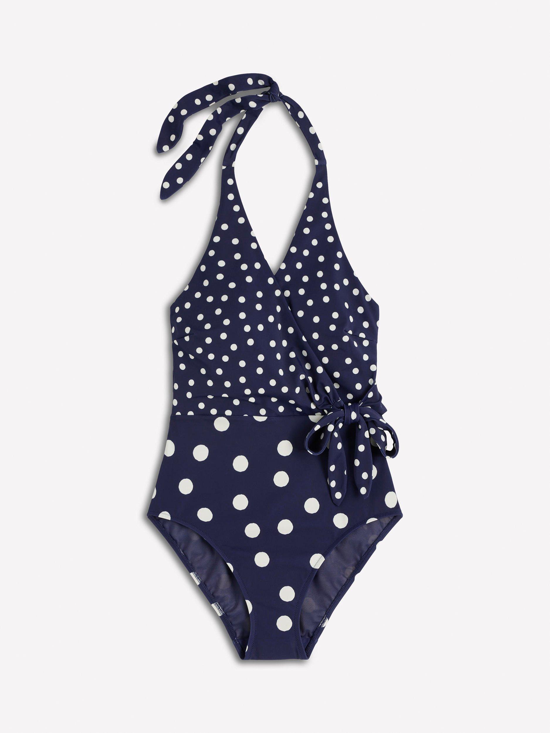 With its wraparound style, chic tie and bold print, this halterneck swimsuit has a touch of retro glamour (especially the polka dot). Just add giant sunglasses.