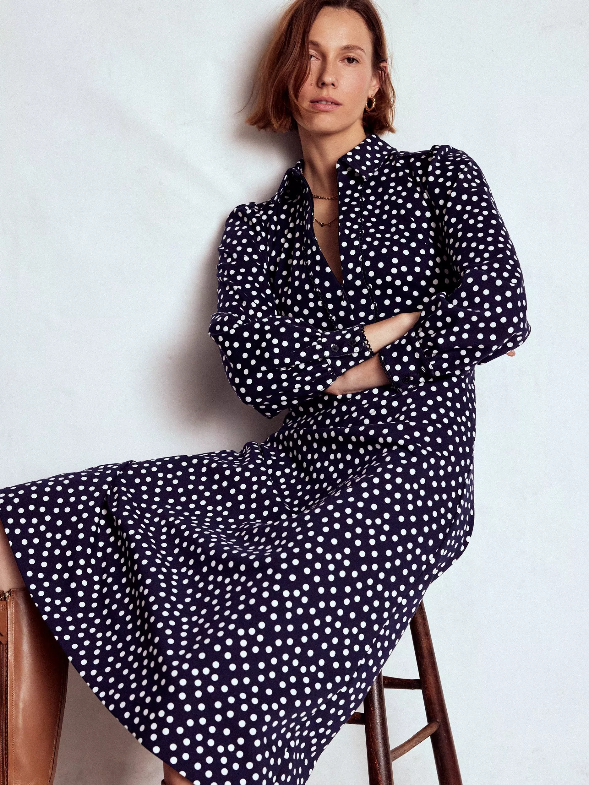 Button up. This long sleeved cotton mix midi dress from Boden is framed with a collar neckline and a pattern worthy of being spotted in.