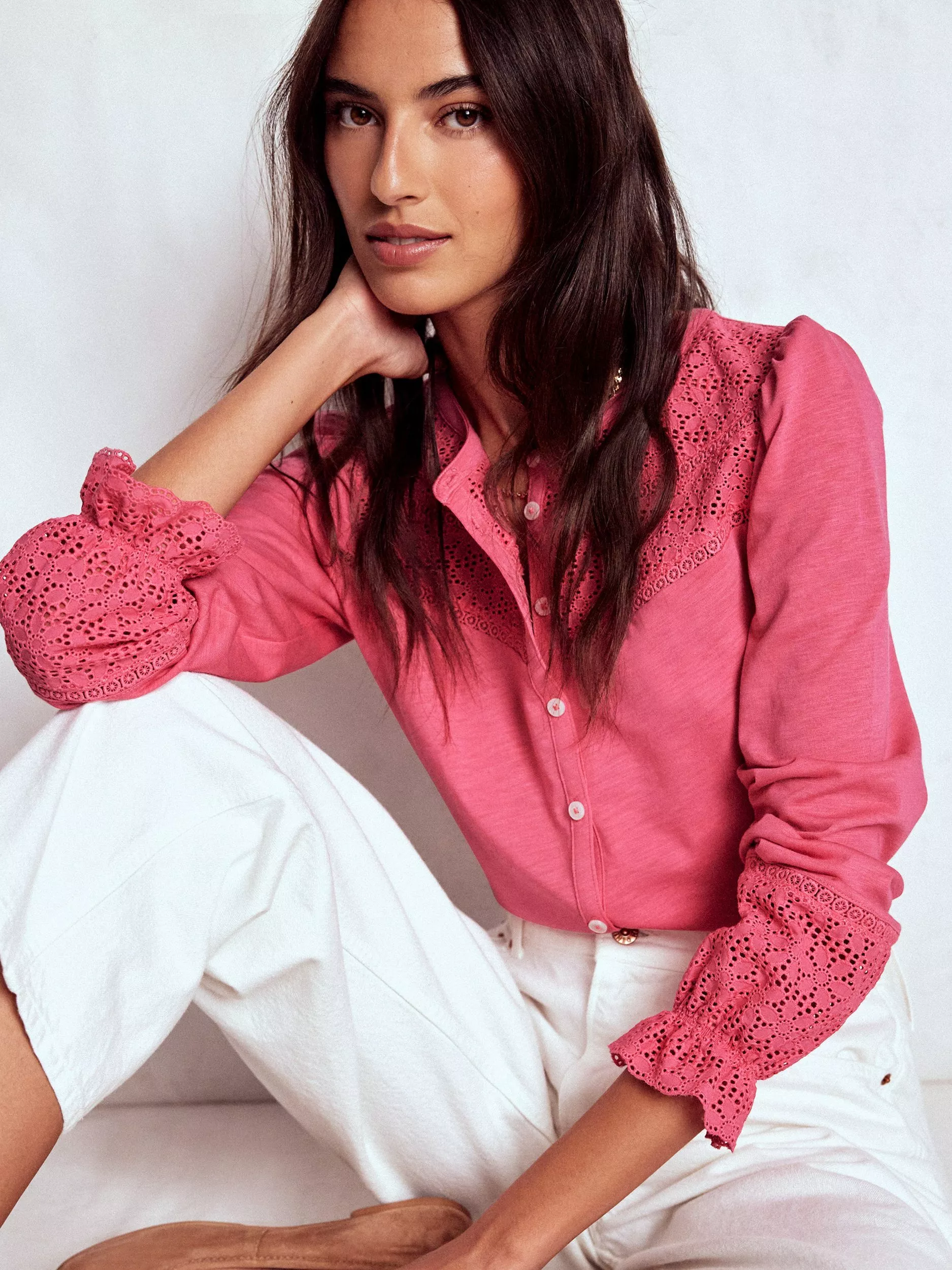 A lightweight cotton jersey top full of feminine touches from broderie detail to blouson sleeves and frilled cuffs. Move through the day with ease collecting compliments as you go.