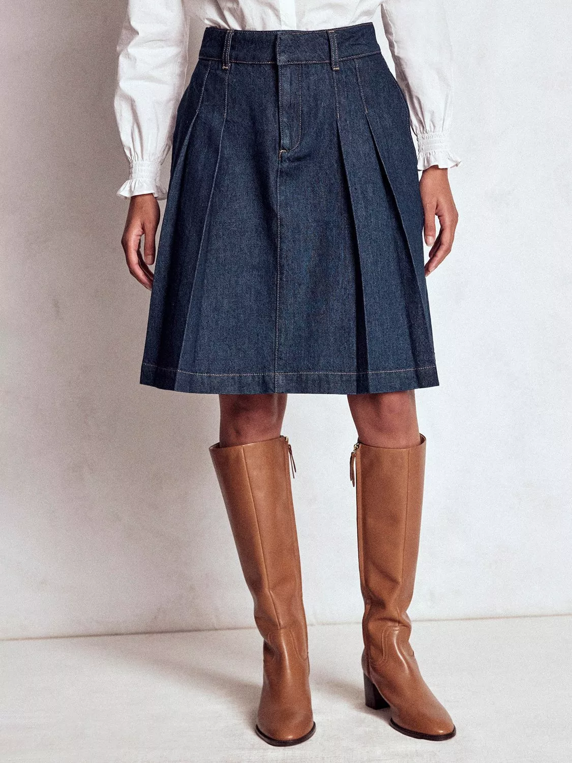 How to enjoy easy outfit building? Add plenty of pleats (works every time). Flattering and cool, this denim skirt will make you want to show off your good mood in twirls.