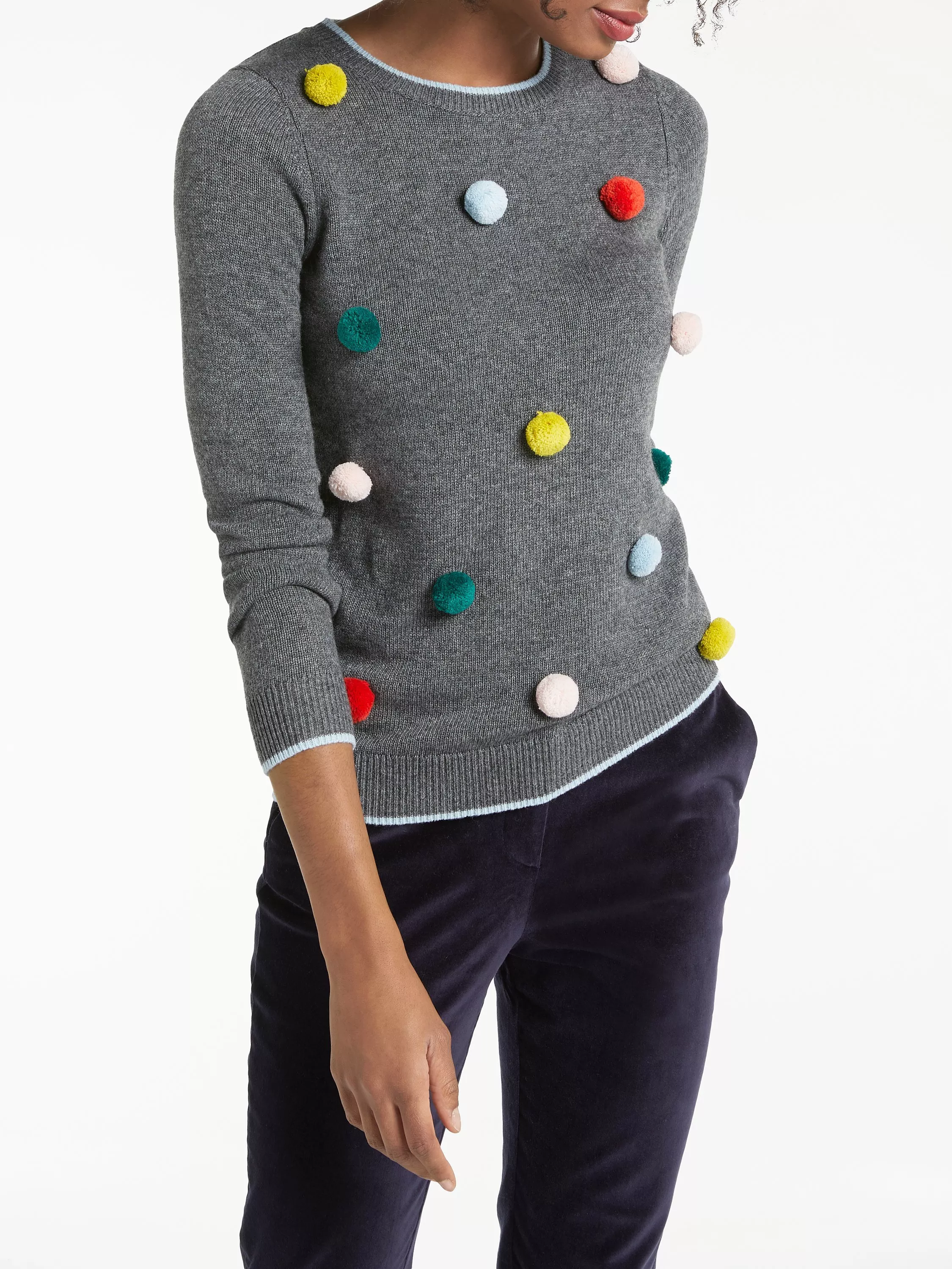 Covered in playful pom poms, it features a rounded neckline, long sleeves with ribbed cuffs, hemline and neck for a cosy fit. The figure hugging style combines novelty with a touch of luxury with cashmere and wool mixed into the fabric for a soft feel.