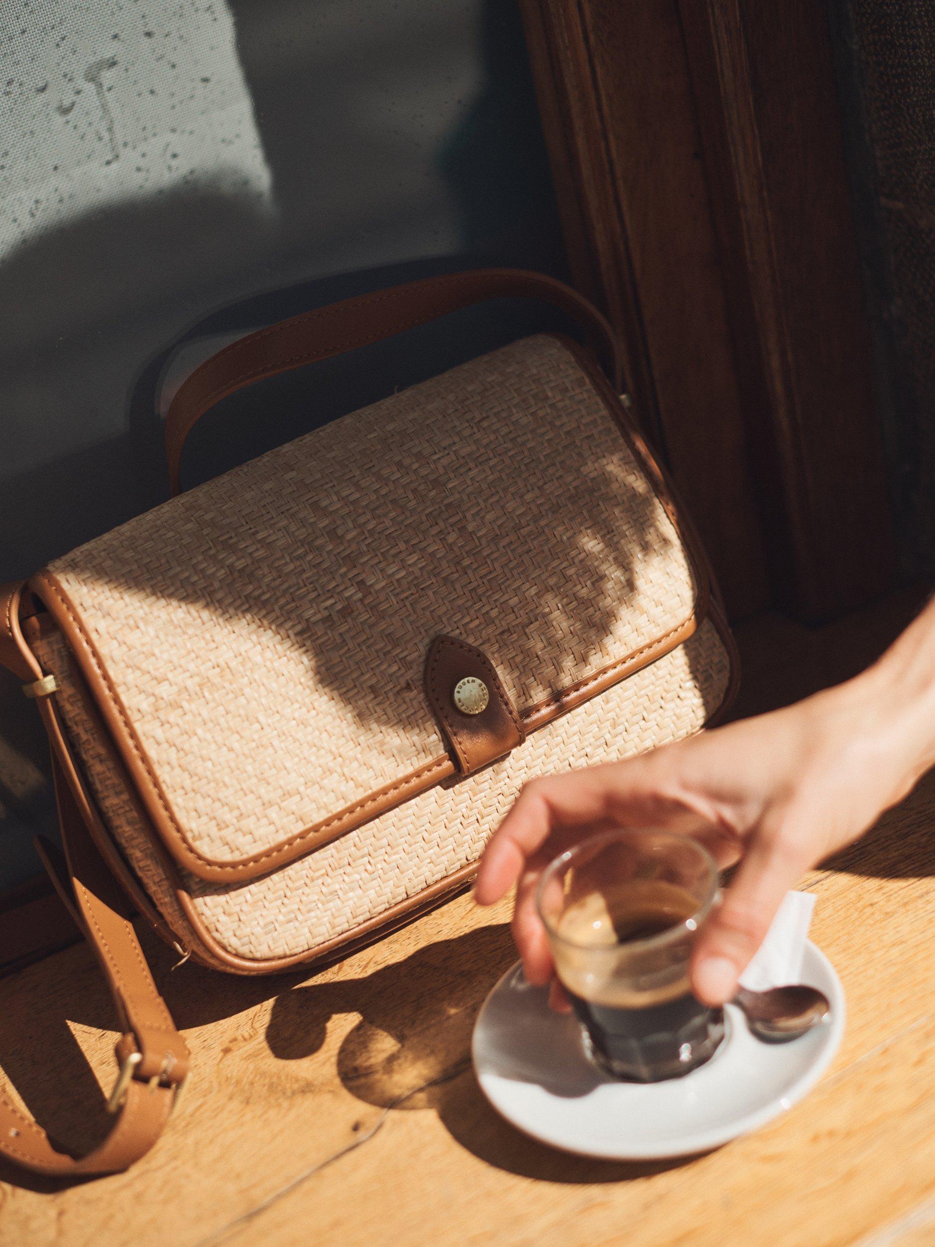 Reworked with natural straw for the summer and with an adjustable strap, it's fastens with a simple clasp and boasts an exterior slip pocket allowing for easy access things you use again and again.