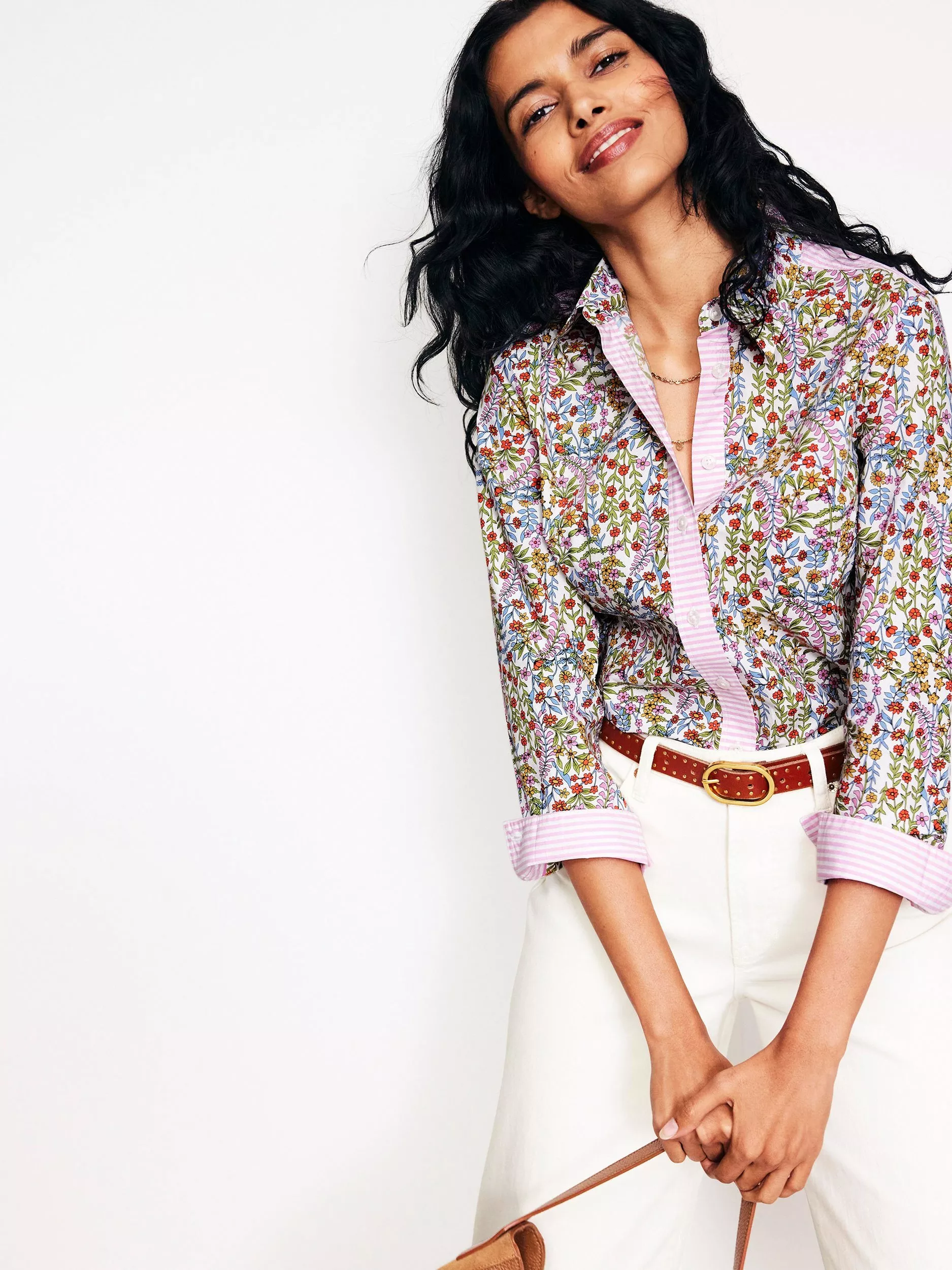 Crisp cotton keeps the straight-fitting shape of our Sienna shirt. It has a curved hem at the back for easy layering.