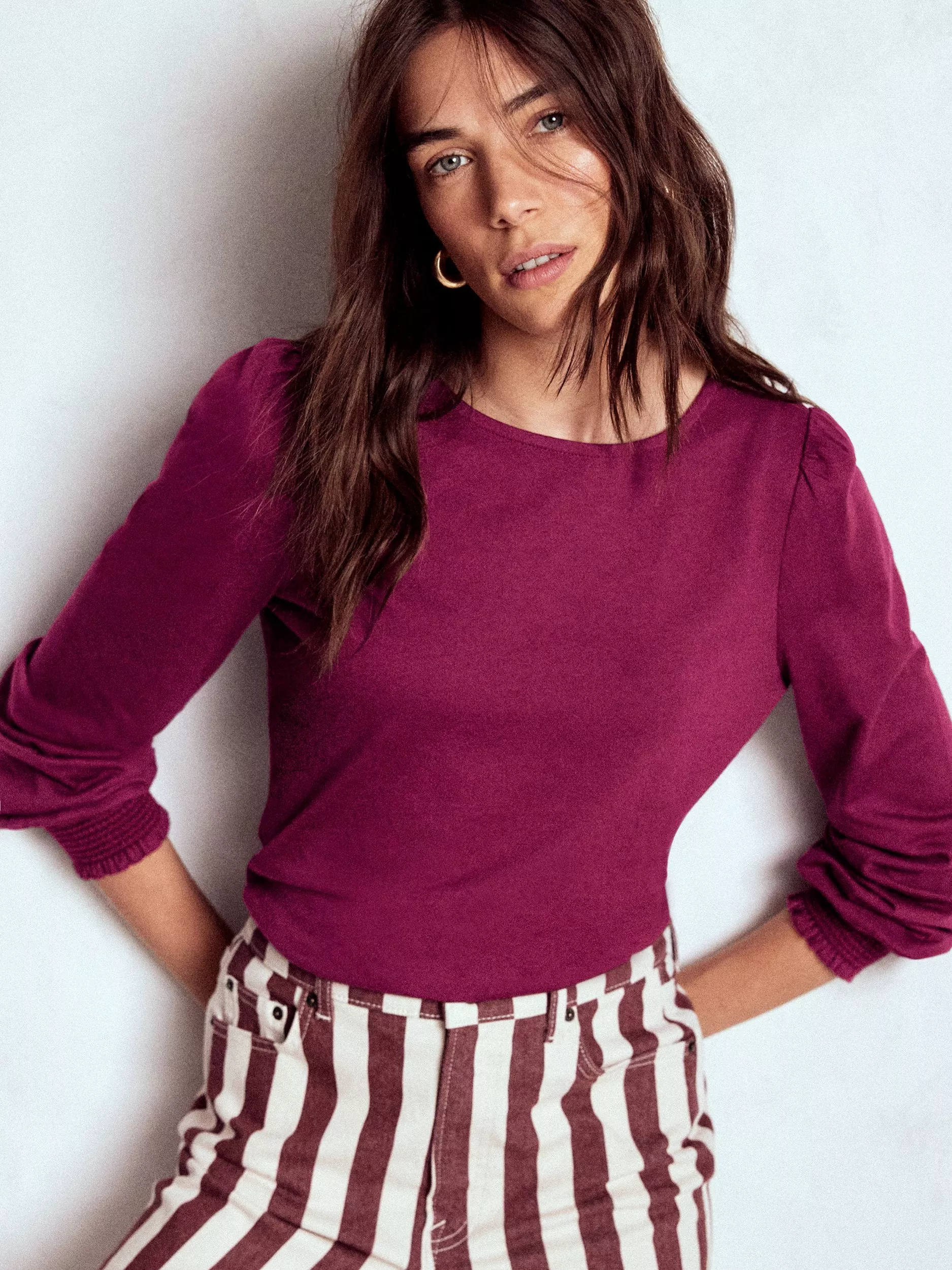 Smocked cuffs give this easy long-sleeve top a point of difference. Show it off layered under a knitted tank or wear it on its own tucked into high-rise jeans.
