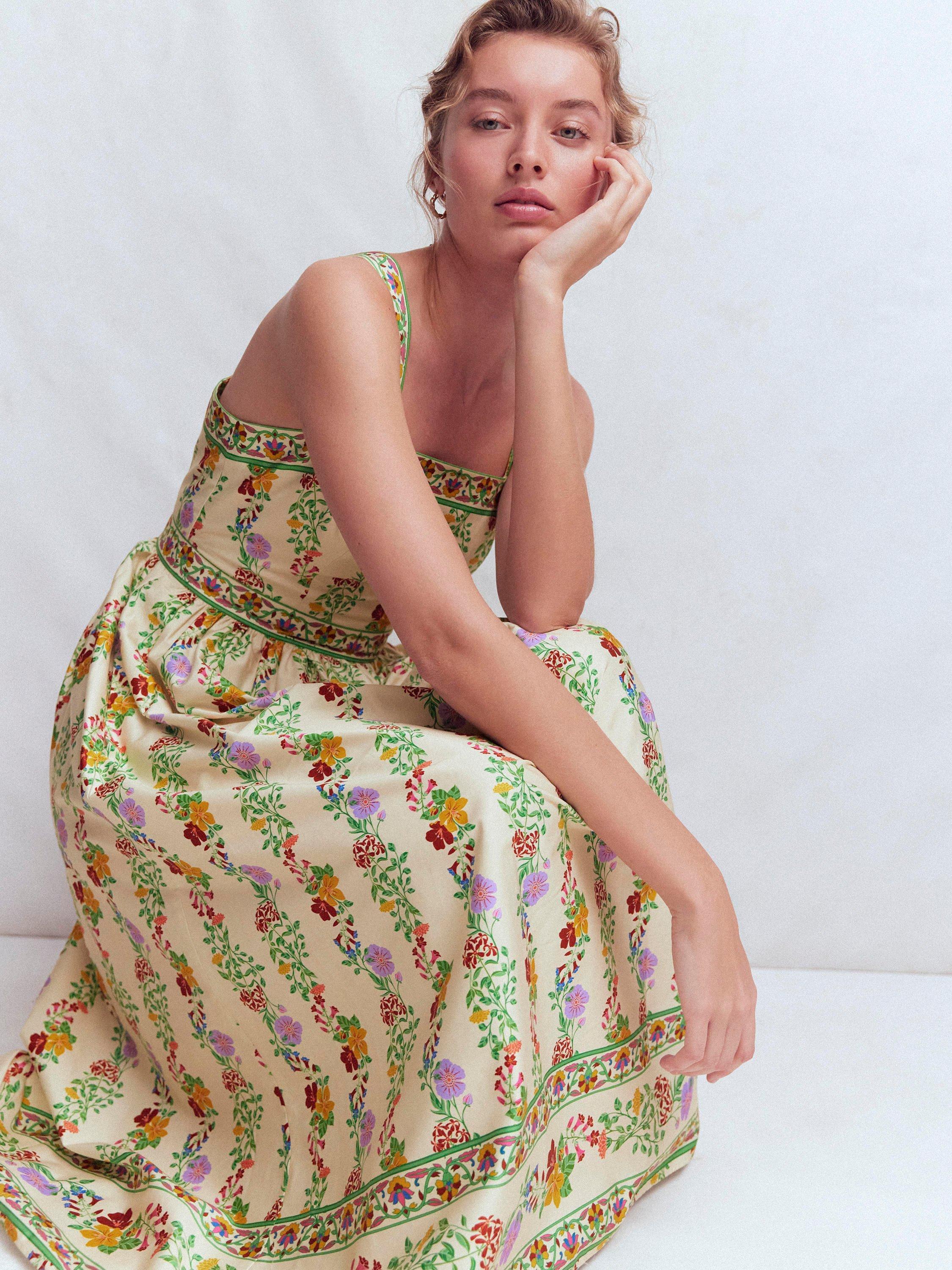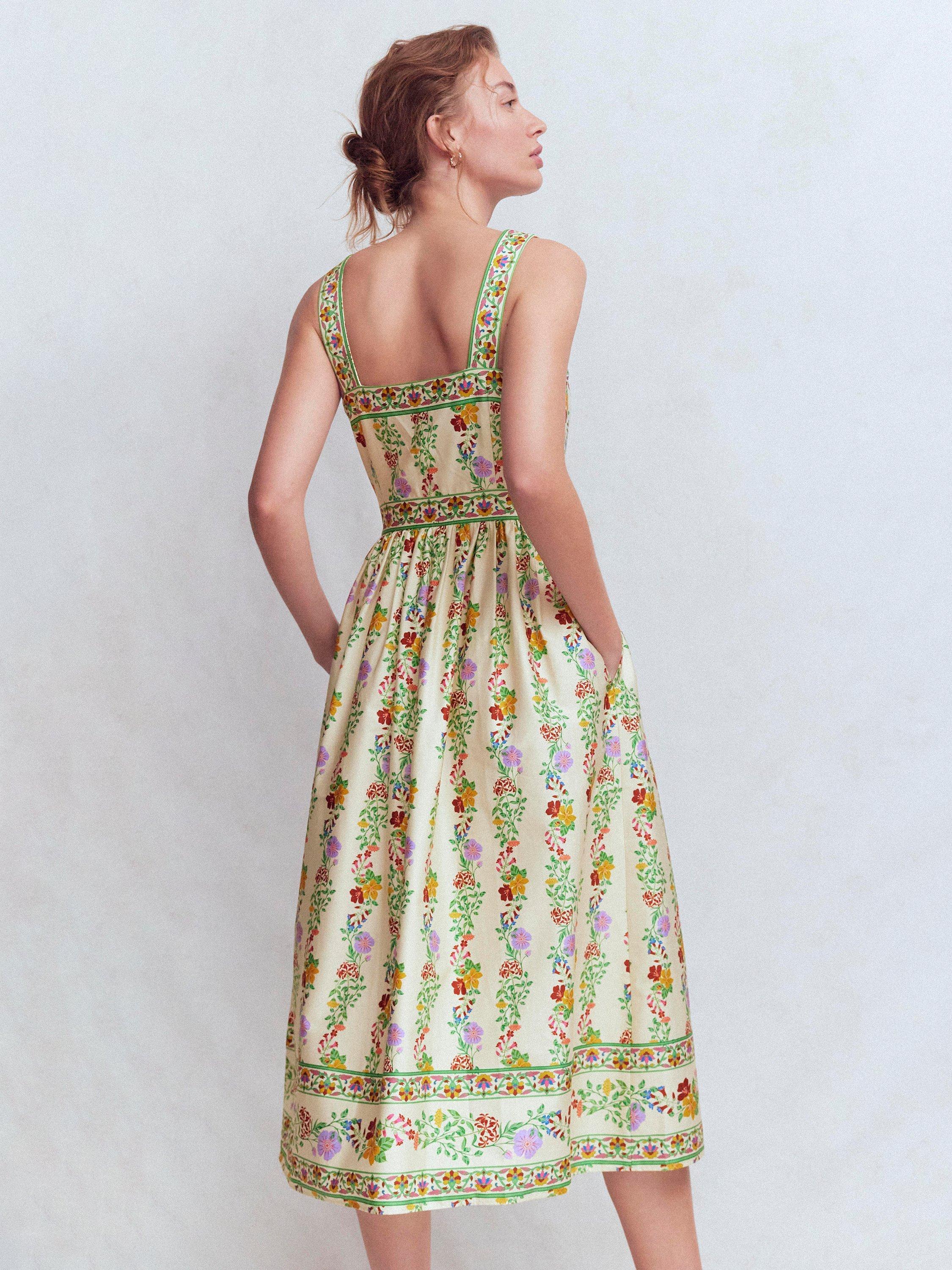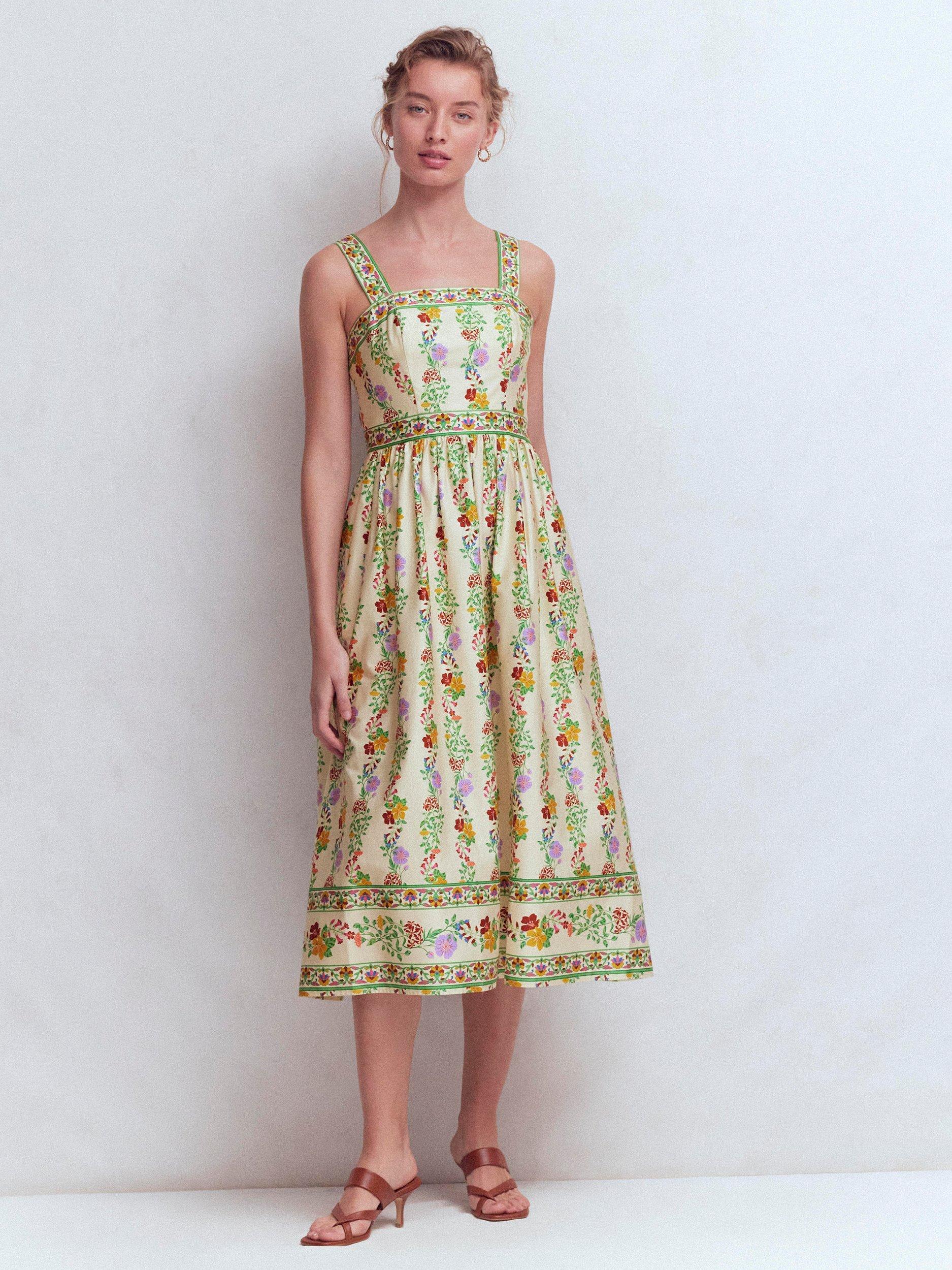 A lightweight fit dress with simple, clean lines and a defined waistband. The square neck bodice, thick straps and swishy skirt is crafted in cotton with a little stretch while the floral print is made for river path walks and long mid-summer dinners.