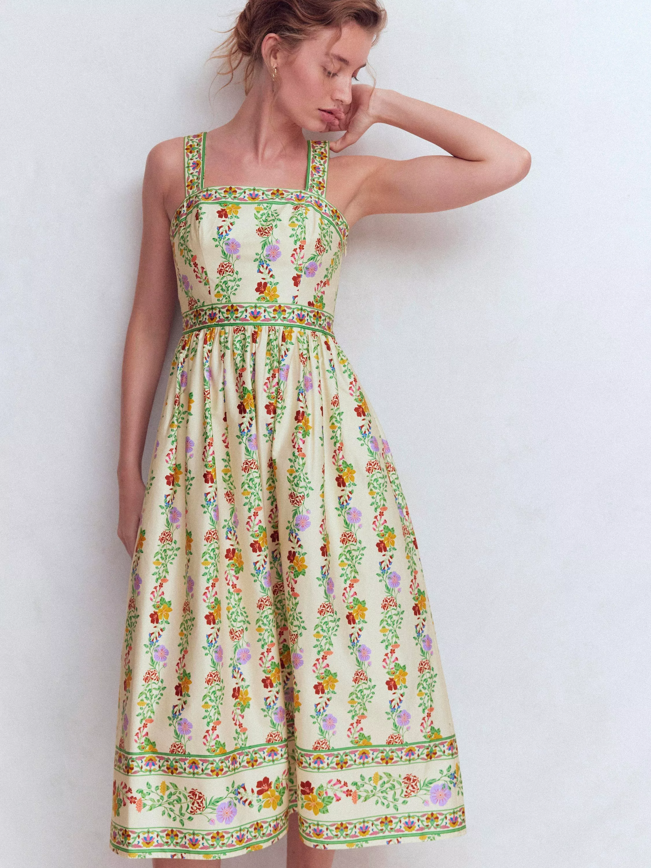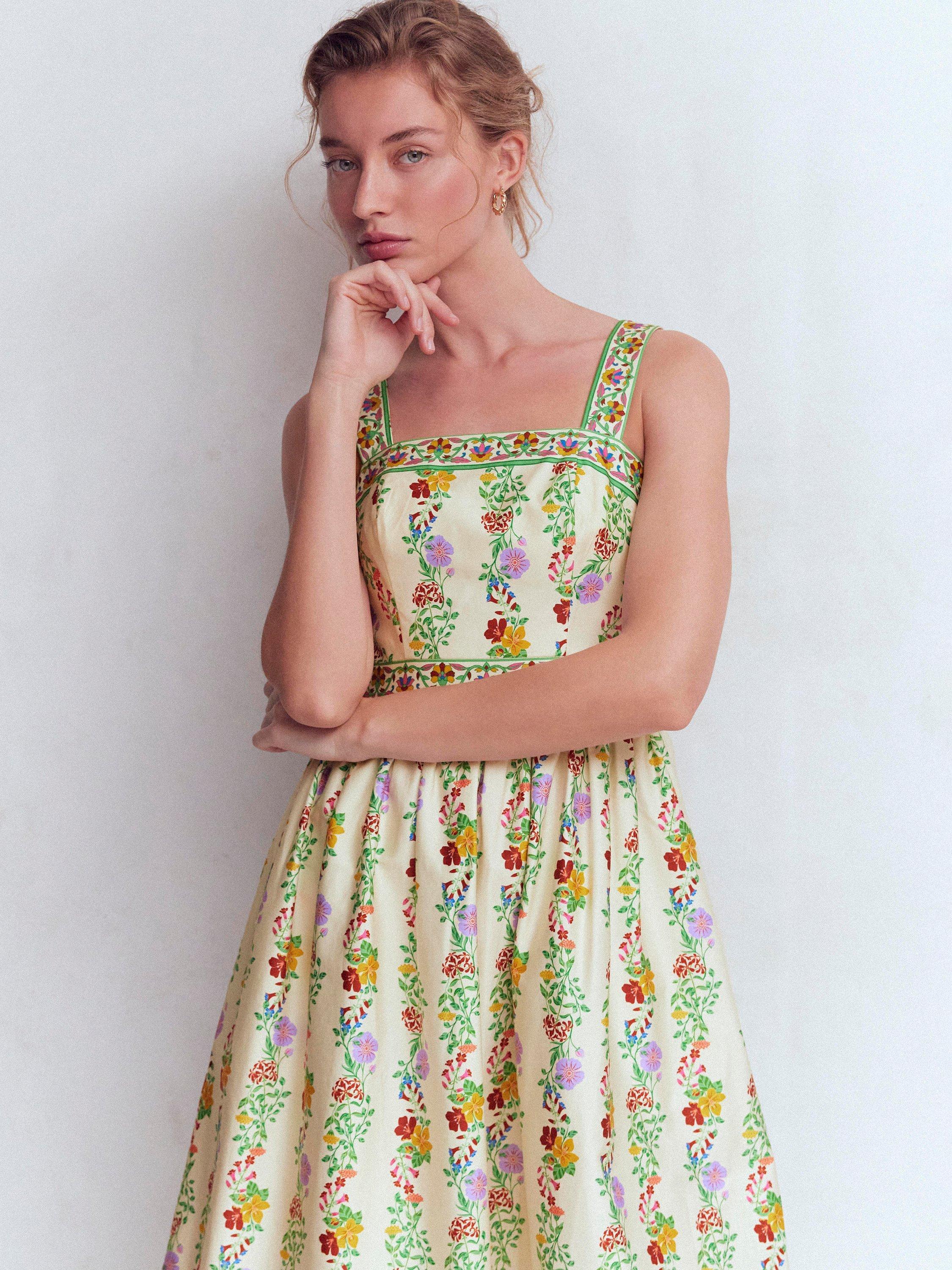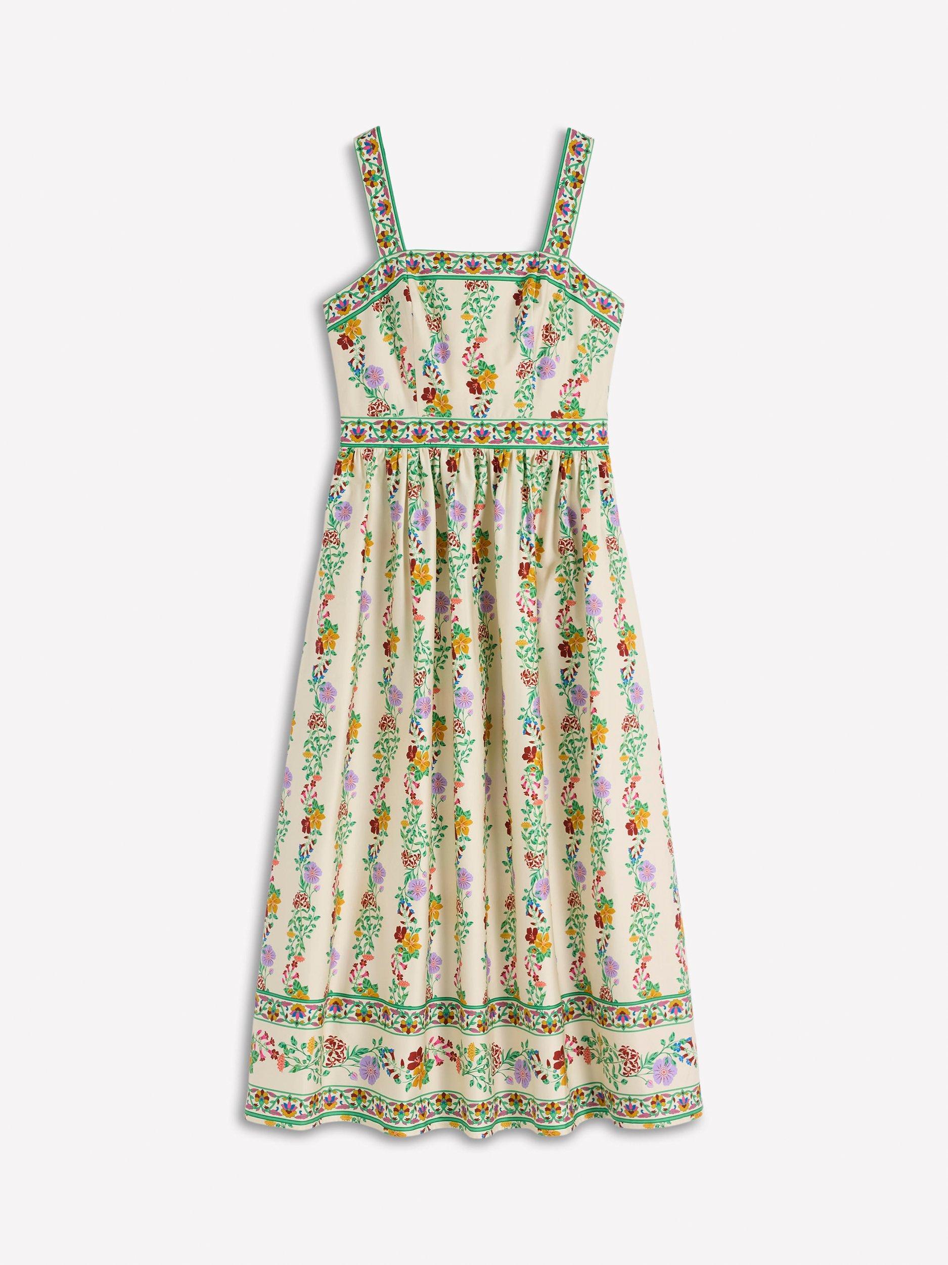 A lightweight fit dress with simple, clean lines and a defined waistband. The square neck bodice, thick straps and swishy skirt is crafted in cotton with a little stretch while the floral print is made for river path walks and long mid-summer dinners.