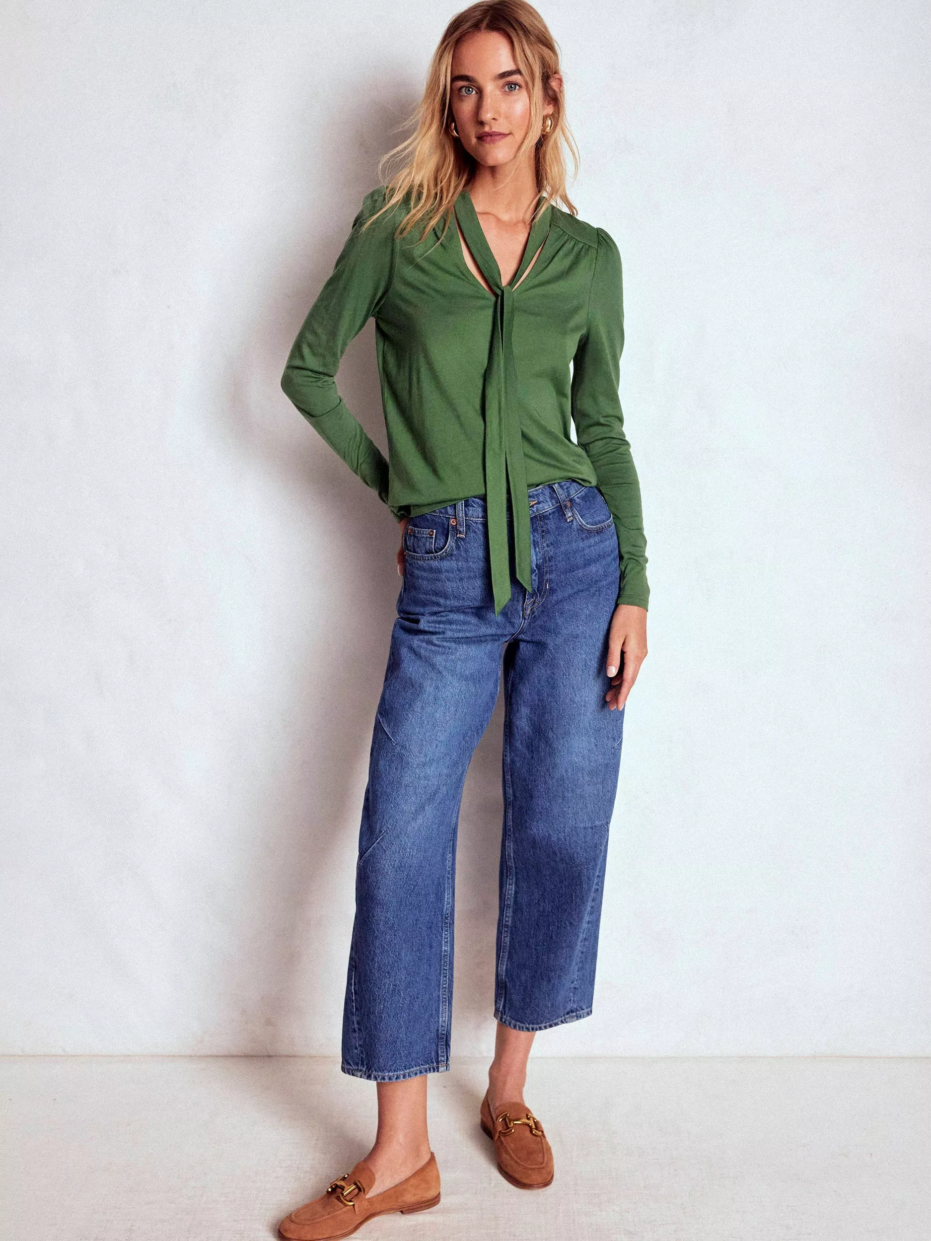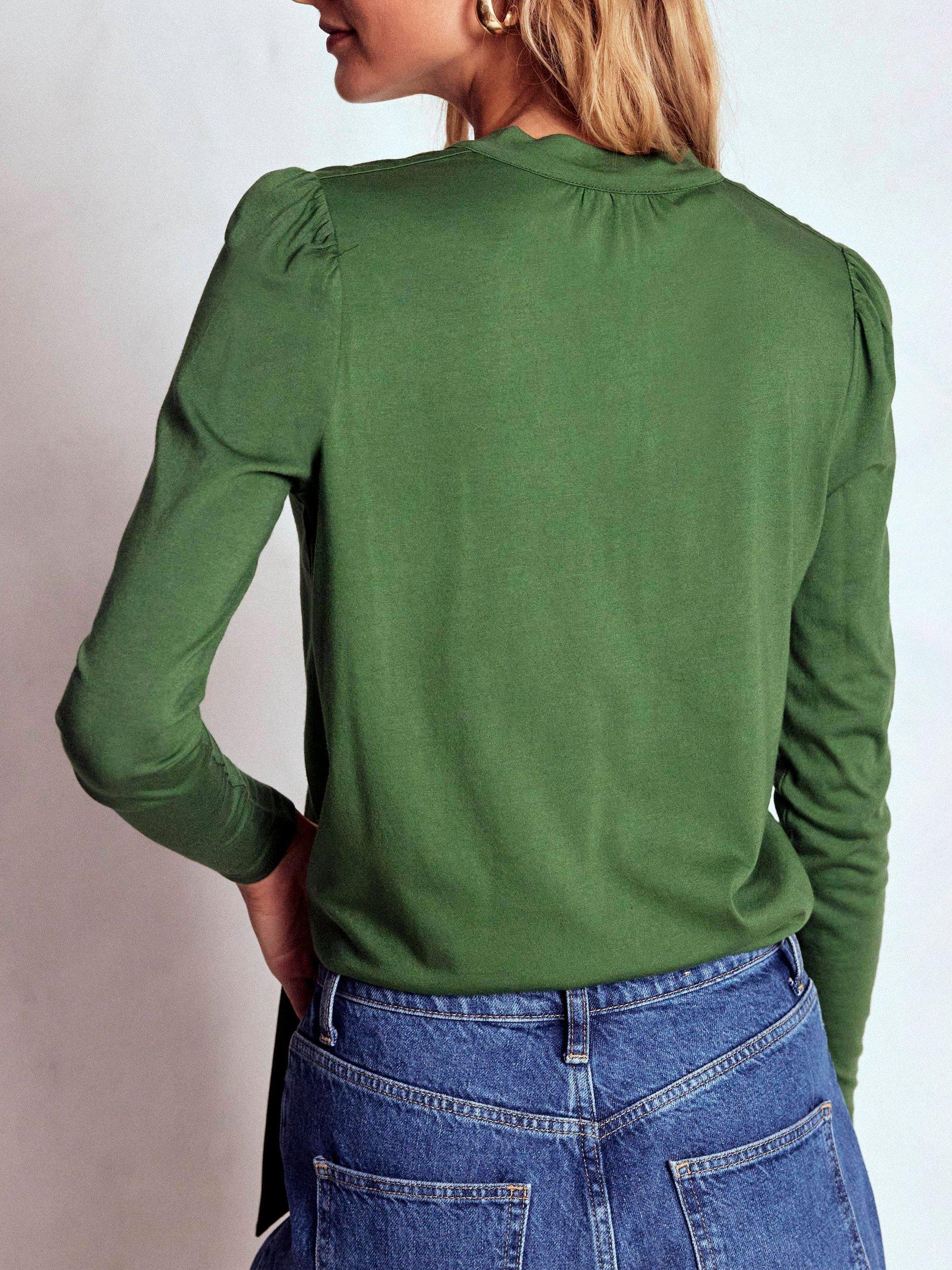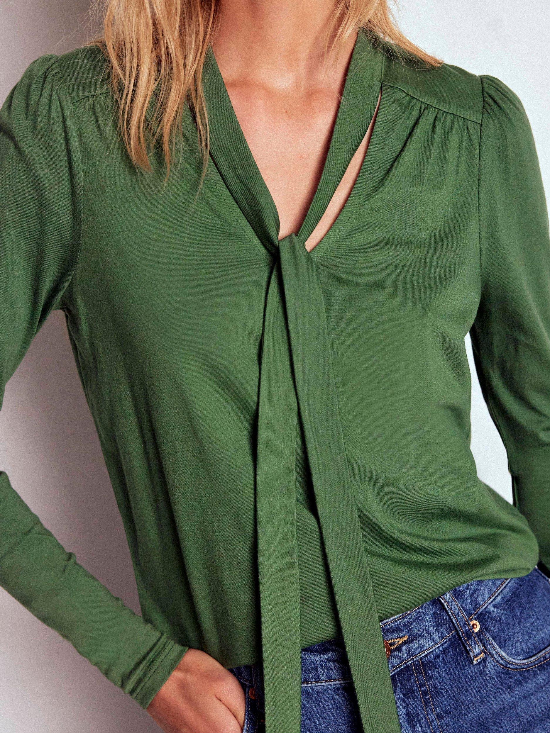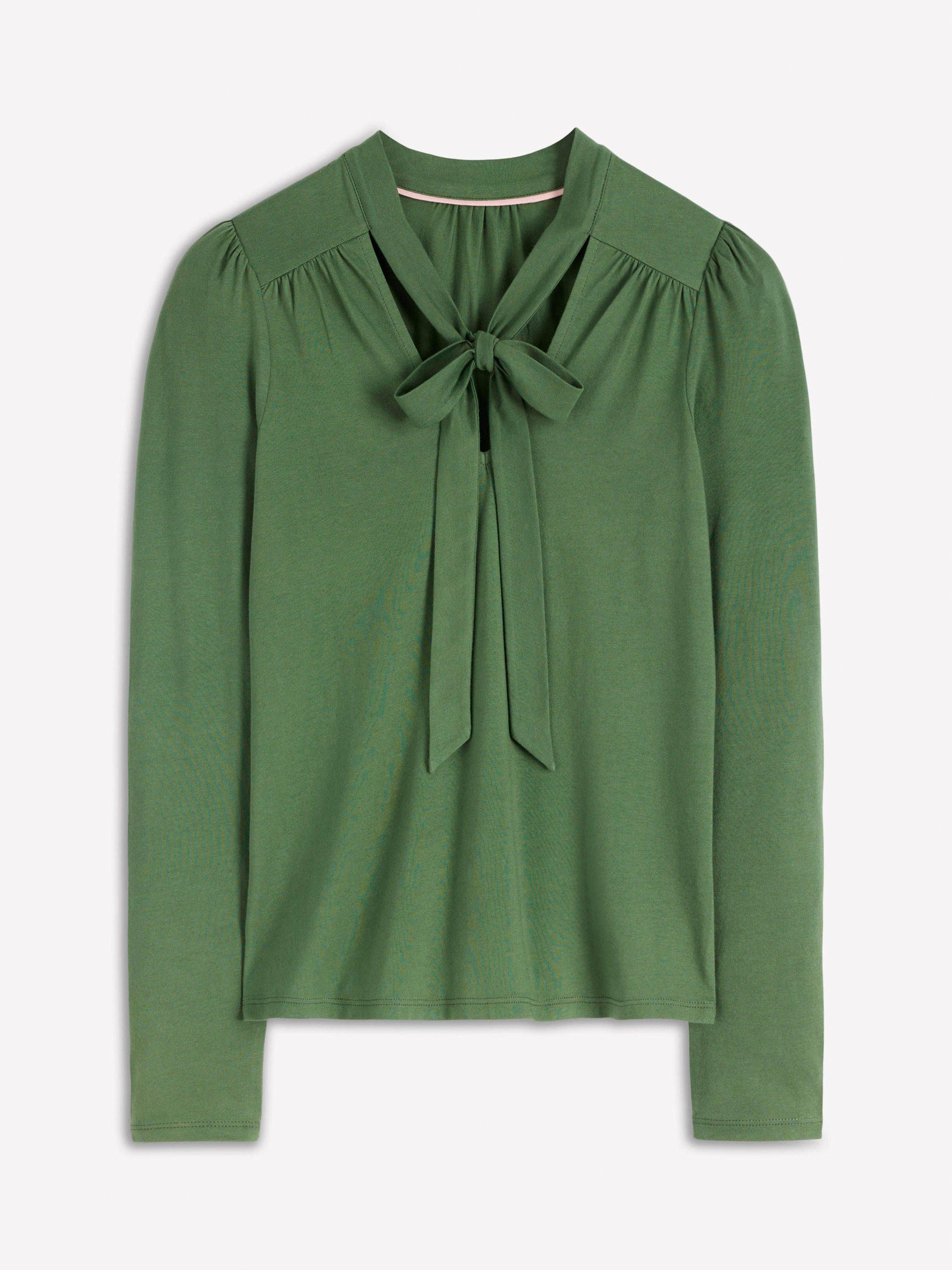 With its gentle gathers and pretty bow (like built in accessory) this supersoft top is a cut above your plain long sleeve tees – but just as comfortable. Time to line up those plans to show it off.