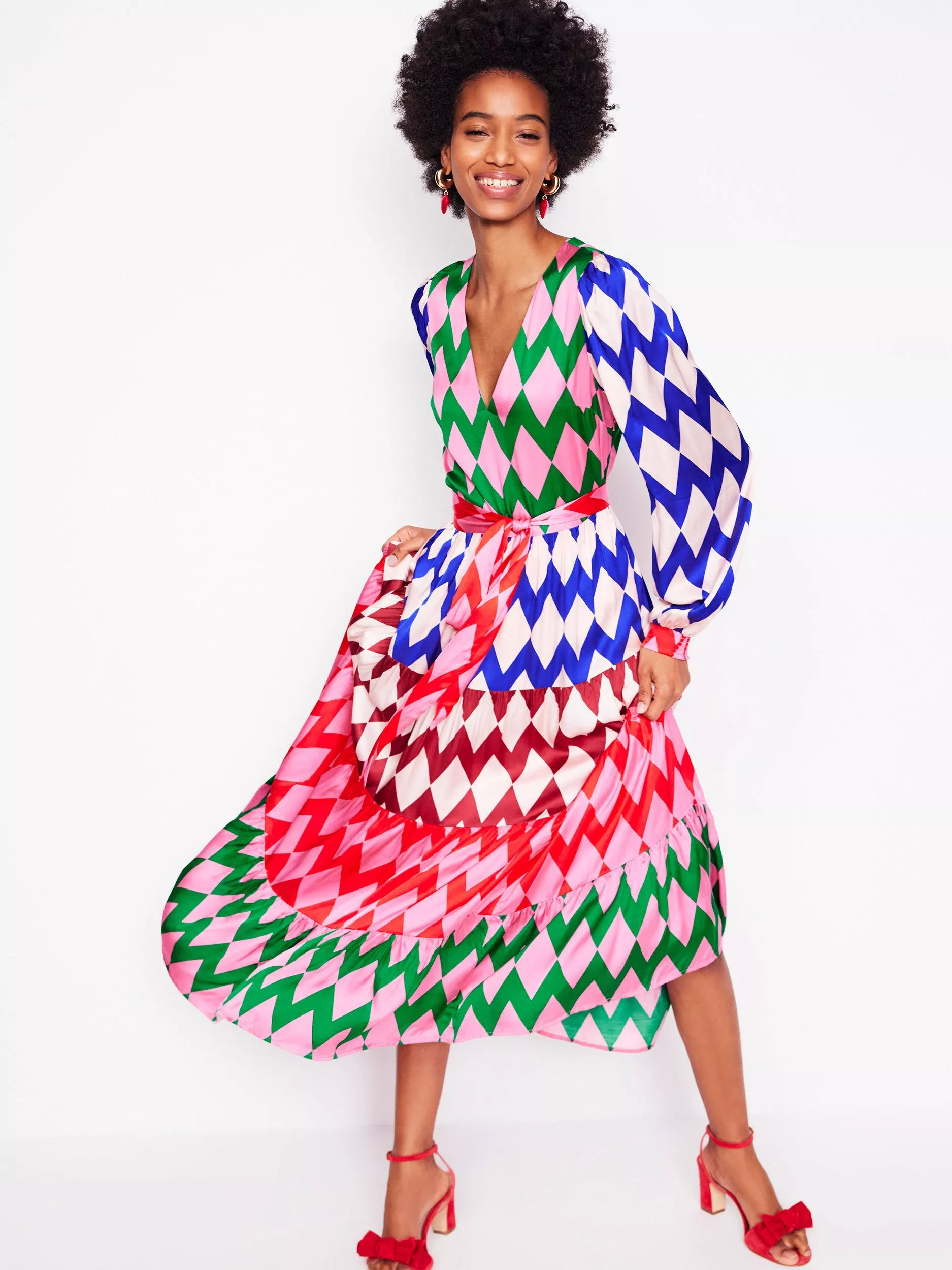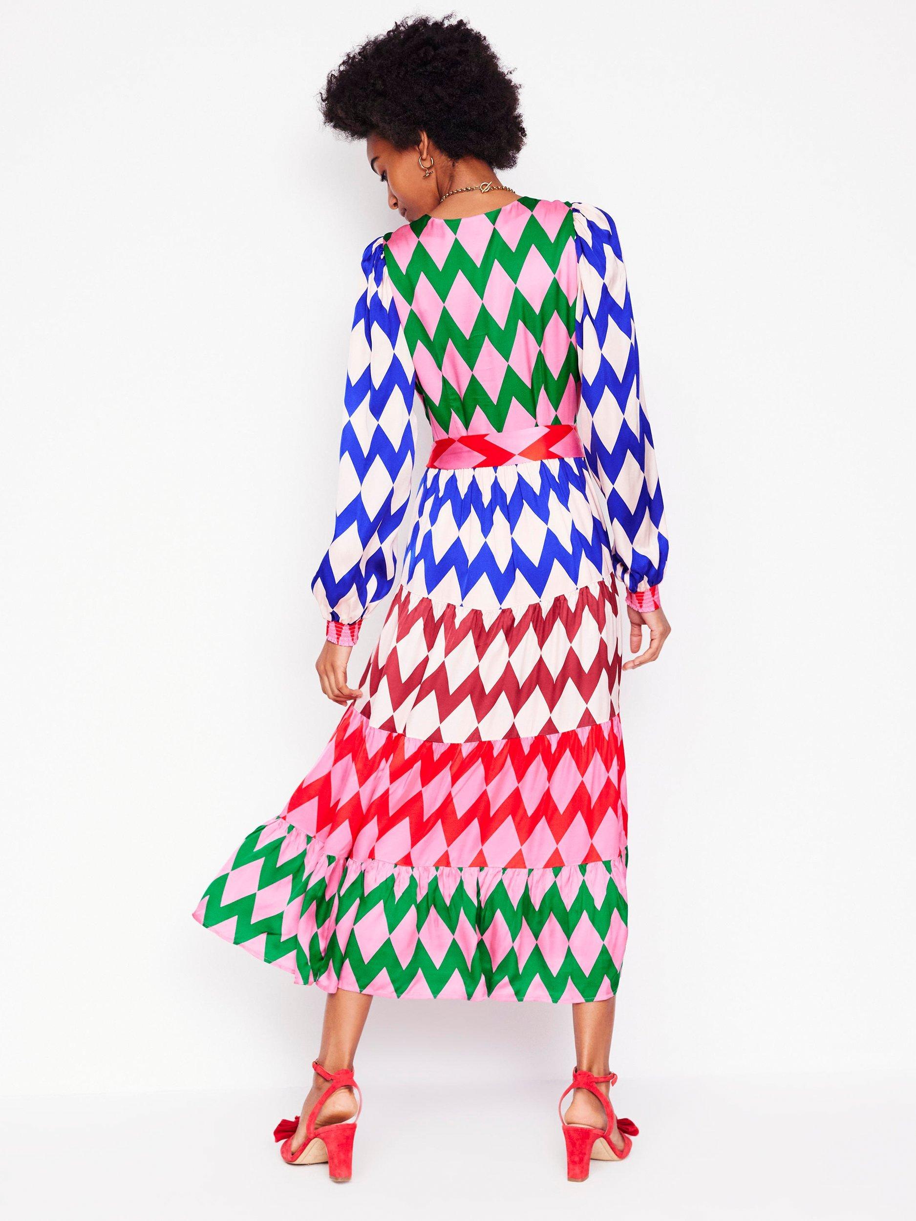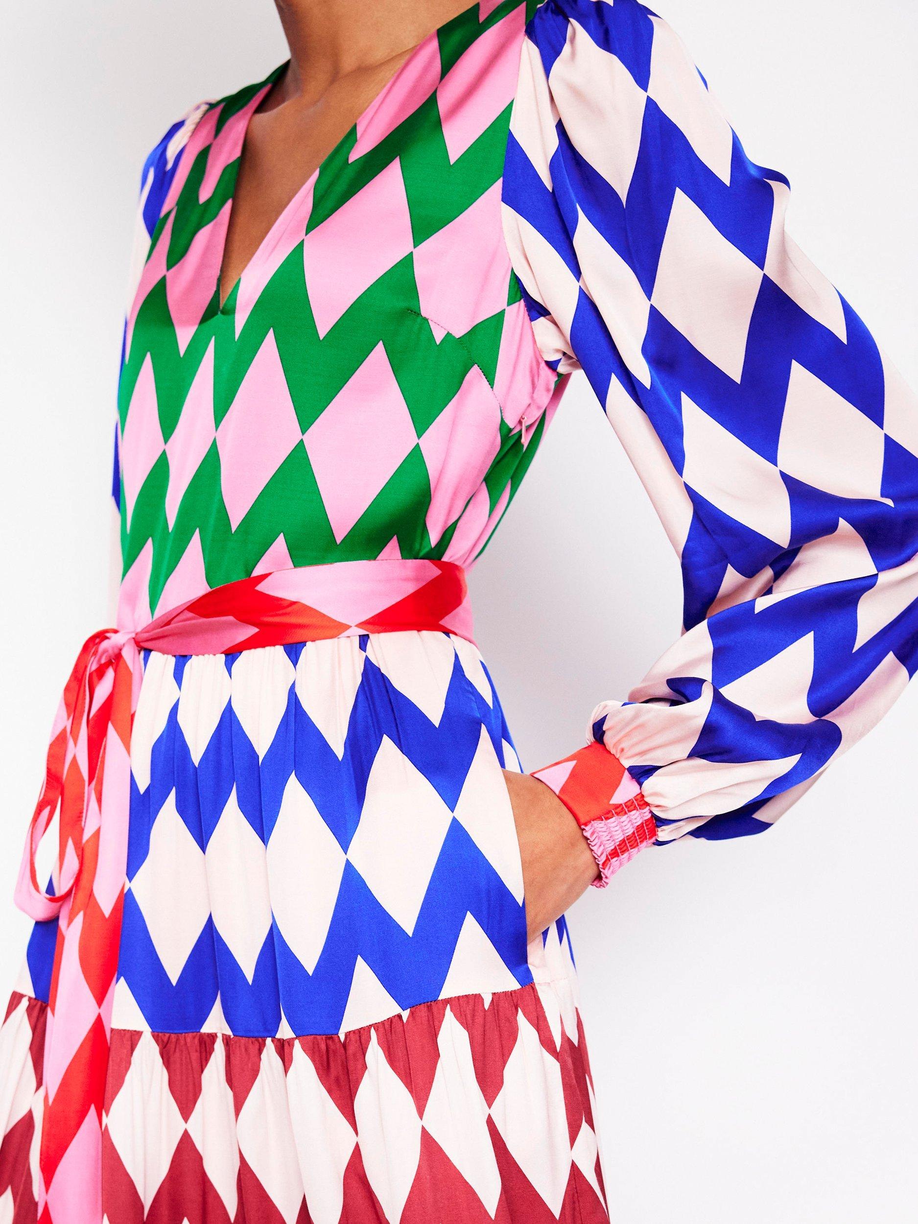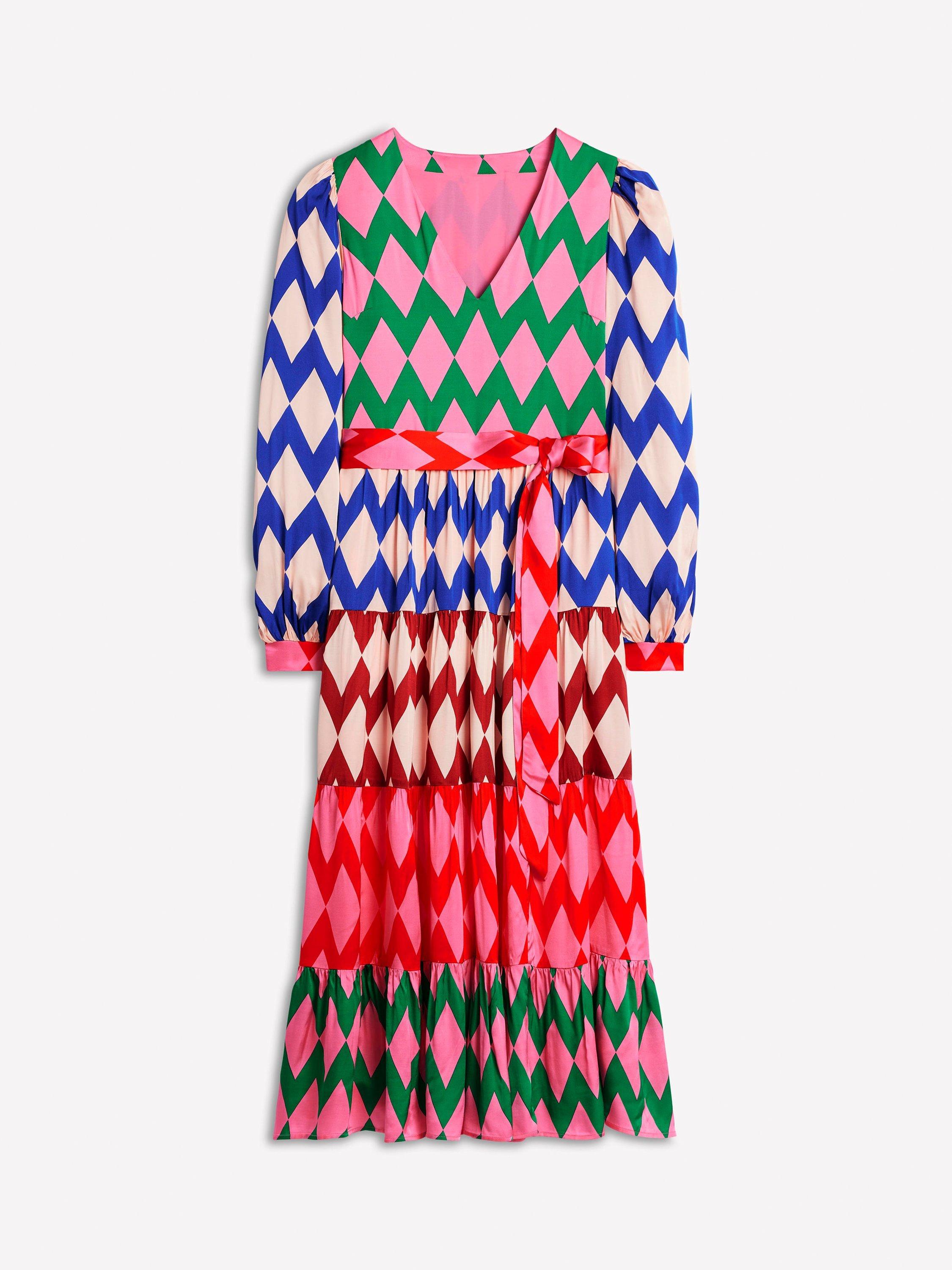 Everything about this dress sings of summer days (and nights). Balloon sleeves with cuffs, a flowy skirt with pockets and tie waist belt act as a blank canvas for the bold prints we love. V is for voilá.