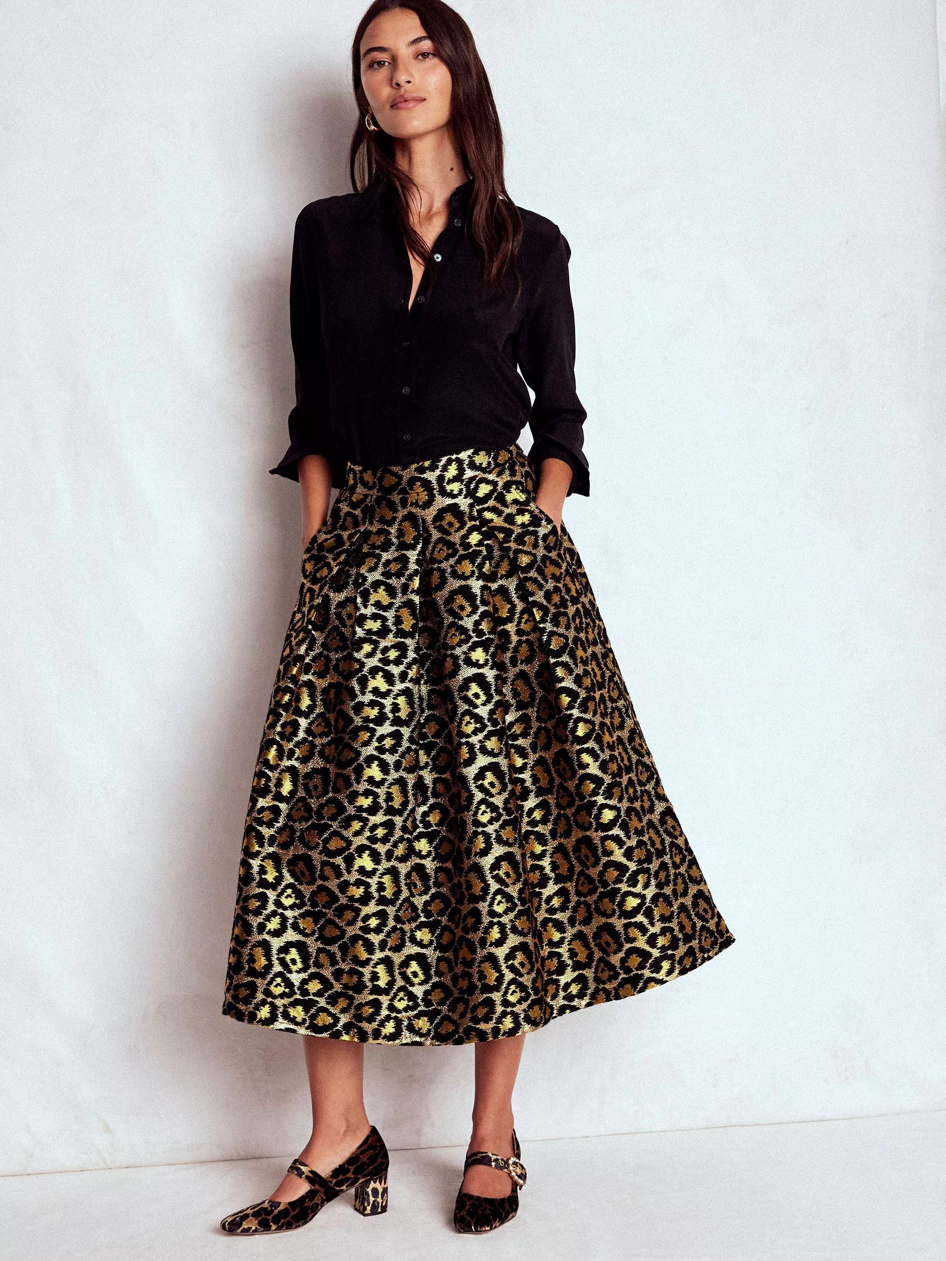 A midi-length skirt by Boden, cut from heavyweight leopard print jacquard fabric. Elasticated at the waist and equipped with pockets, say hello to your new go-to.