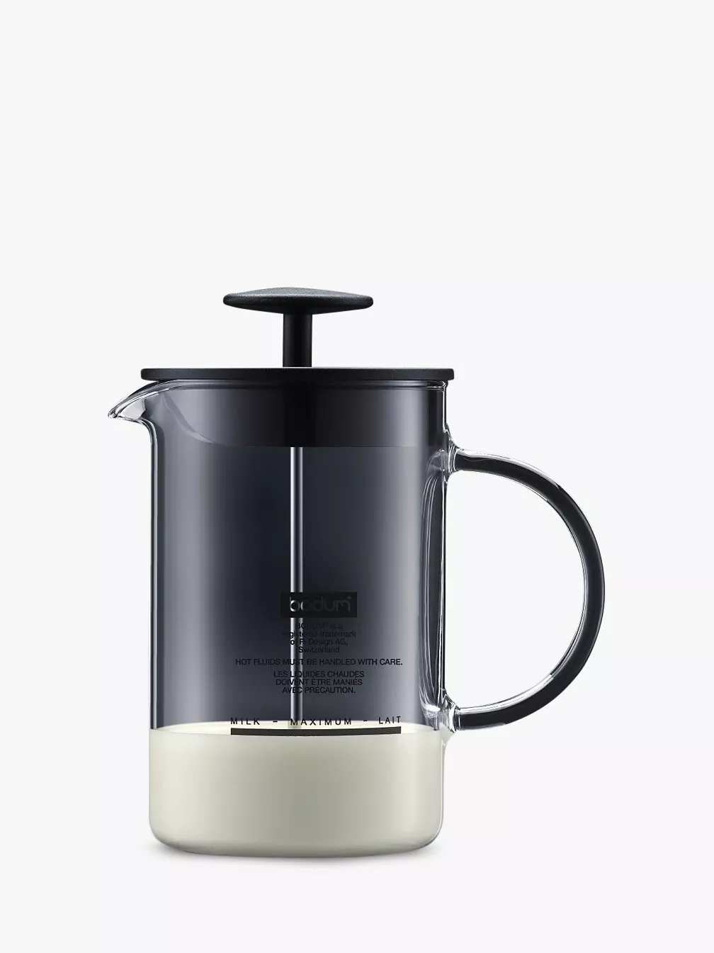 Made from durable glass with a deep-rimmed silk plastic lid to prevent foam from escaping through the spout, the plunger handle has a comfortable grip.