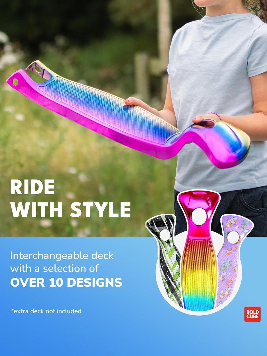 The simple pull-to-fold handlebar system makes it easy for kids to fold and carry themselves, perfect for hop-on, hop-off journeys and easy storage at home or in the car. A tough rear brake ensures reliable and gentle stopping, while bold colours and eye-catching deck designs make sure every ride stands out. These can be interchanged with the purchase of additional decks.